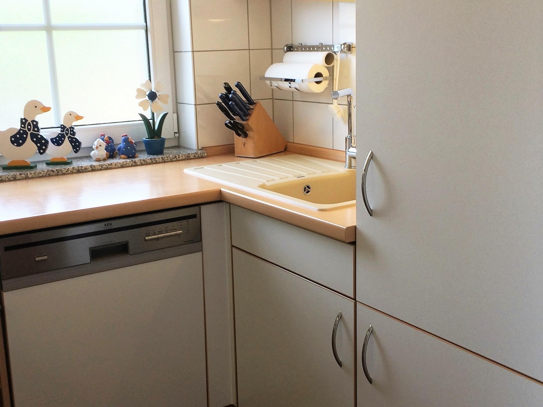 In der gut ausgestatteten Küche finden Sie neben einem Kühlschrank auch eine Mikrowelle und einen Backofen. Und eine Waschmaschine und ein Trockner stehen kostenfrei zur Verfügung.