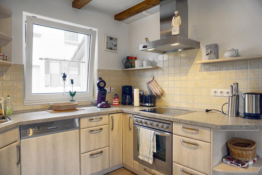 Die gut ausgestattete Küche besitzt unter anderem einen Kühlschrank, einen Herd zum Kochen und sogar eine Spülmaschine.