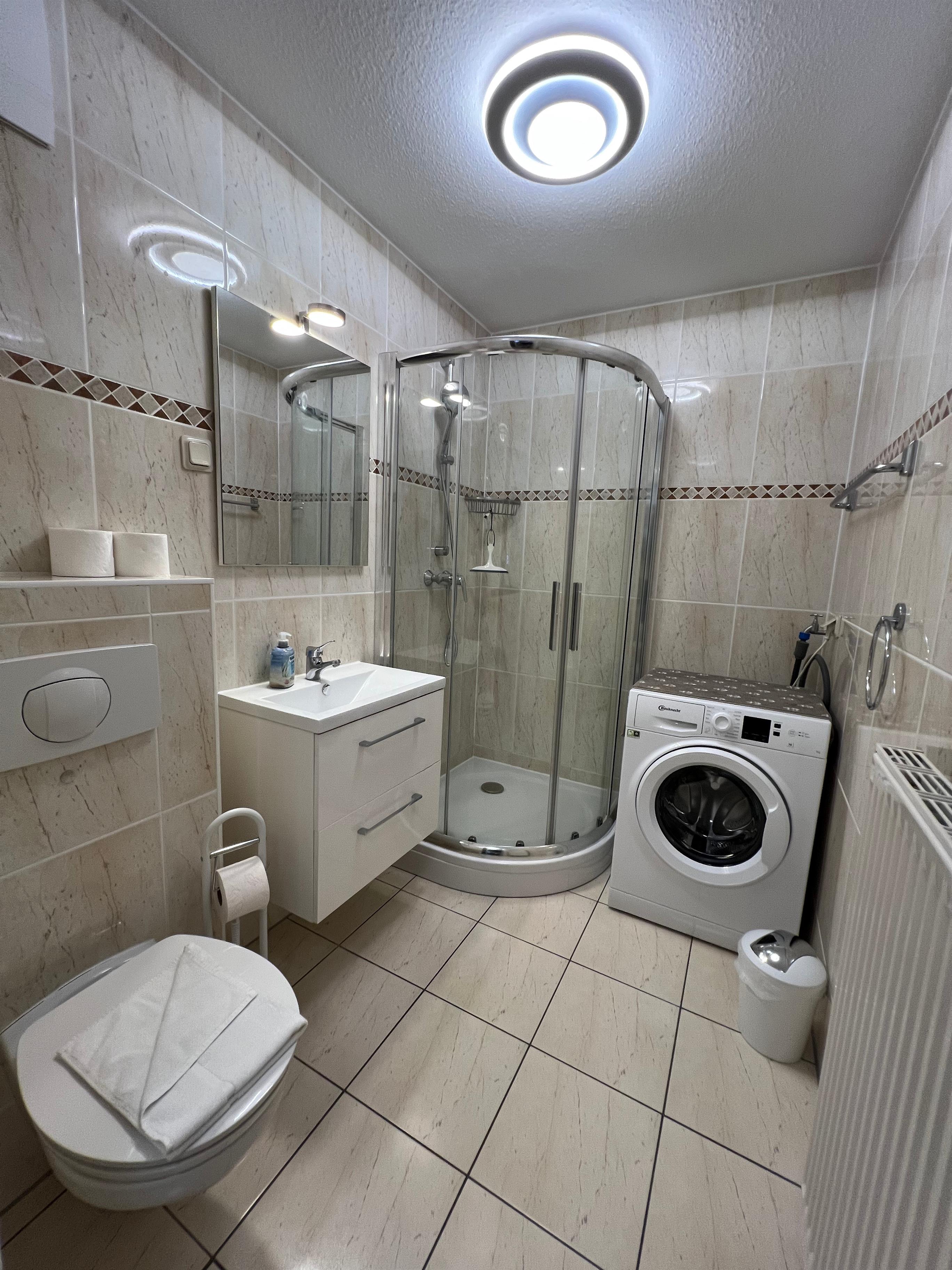 Im großzügigen Wohbereich mit gemütlicher Couch können Sie Filme oder Sport auf dem großen Fernseher genießen. Im Badezimmer finden Sie eine Dusche, einen Haartrockner und eine Waschmaschine.