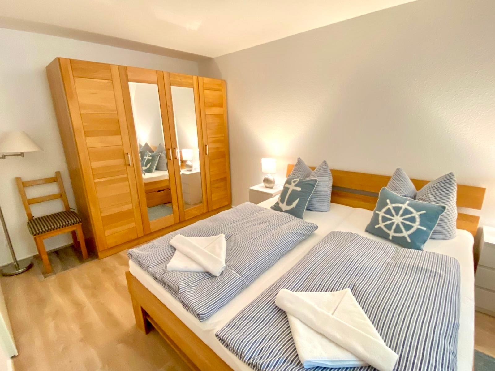 Modern eingerichtete Ferienwohnung im 1. Stock, 63m² für 4 Personen, mit 2 Schlafzimmern, offener Wohnbereich mit vollausgestatteter Küche, Sofaecke und großer TV, Balkon mit Morgensonne und Gartenmöbeln,