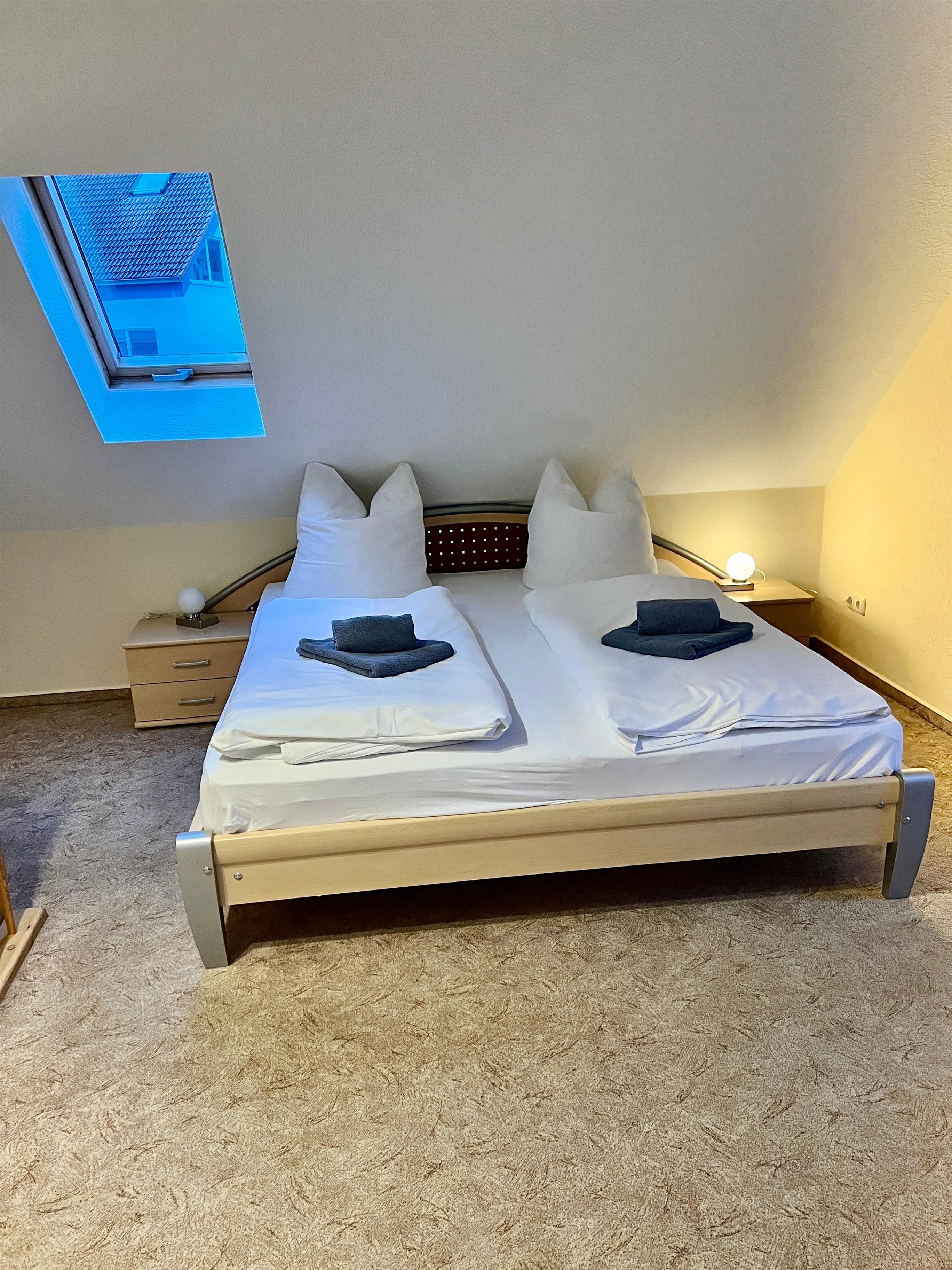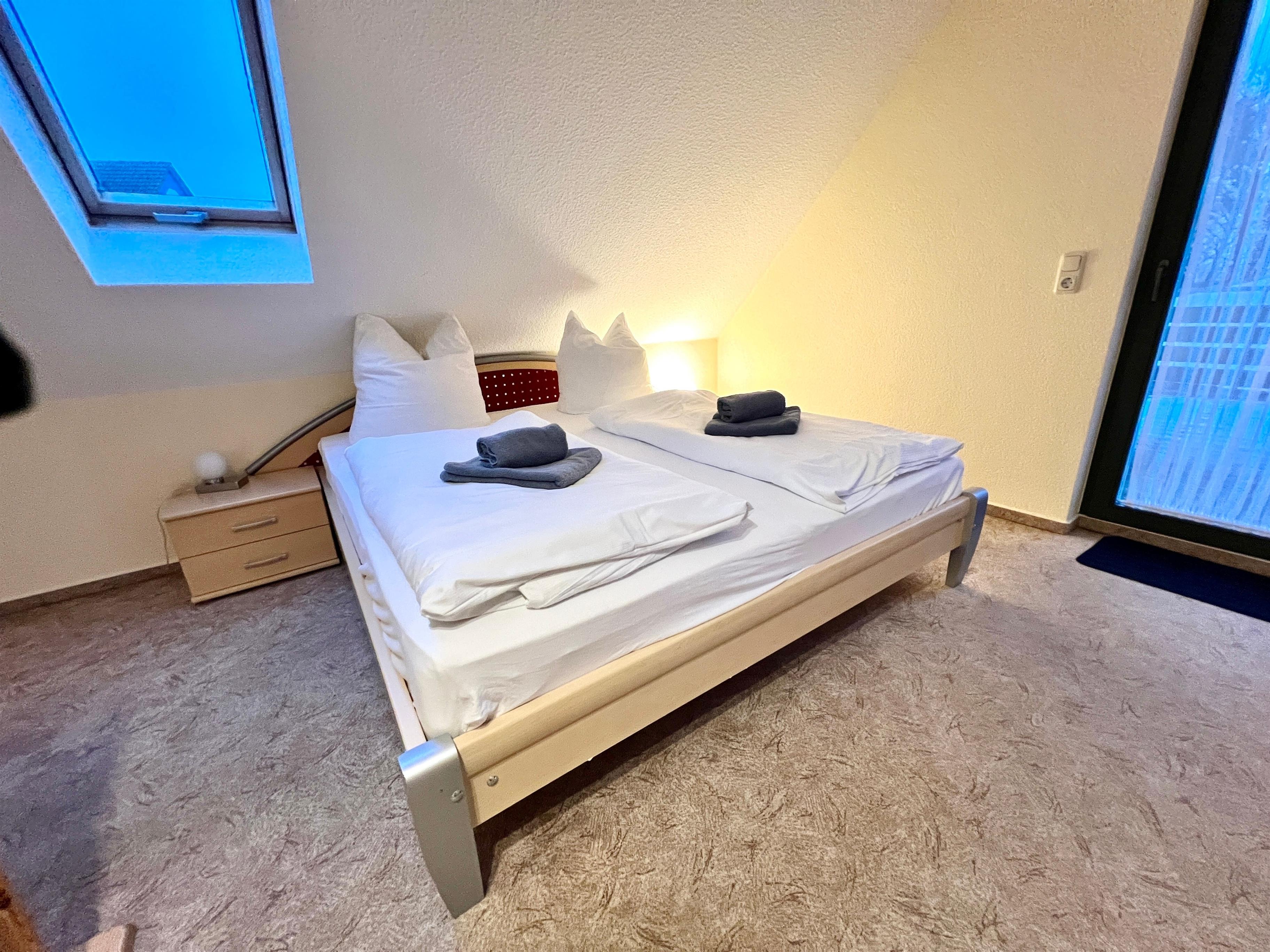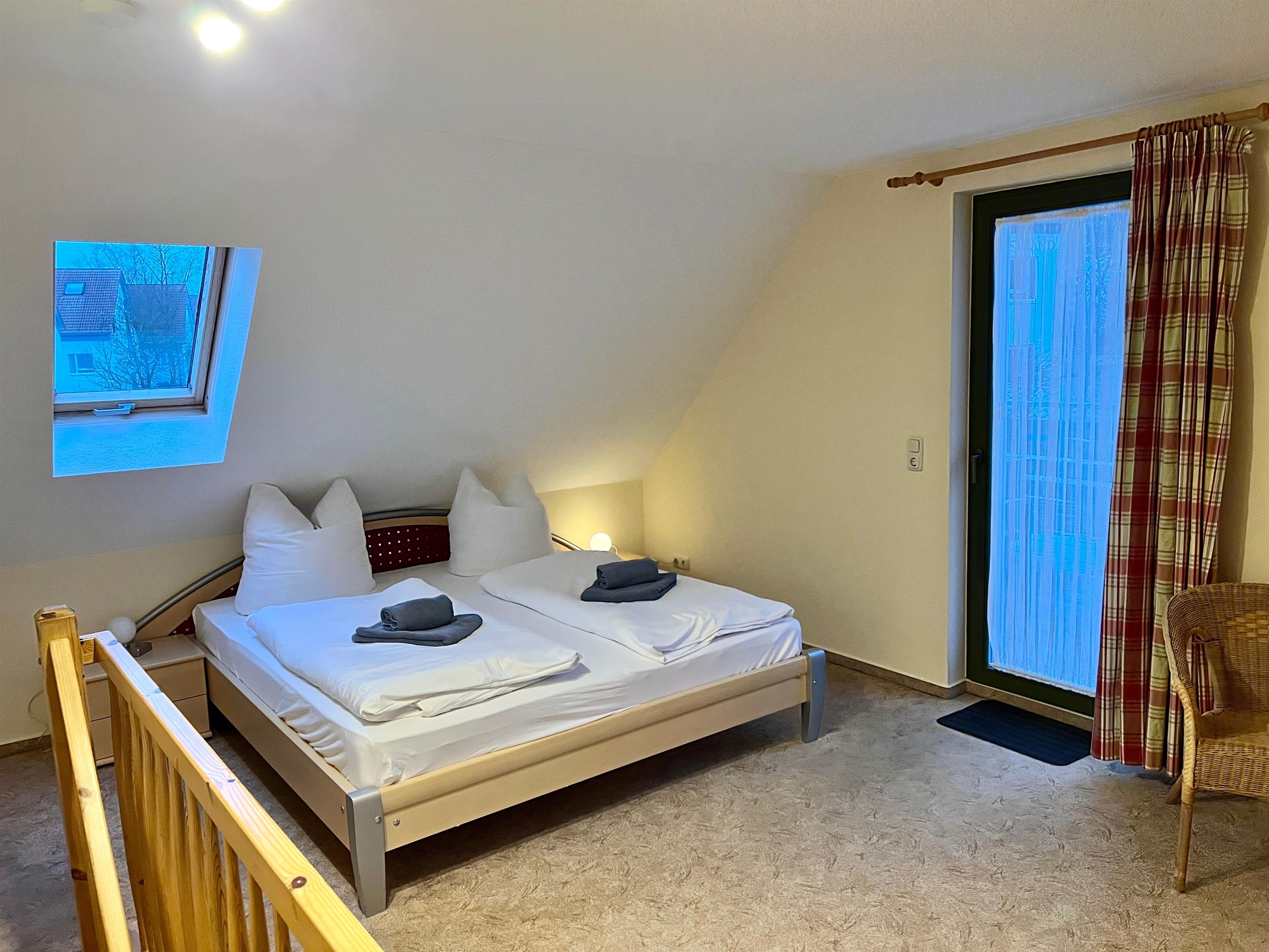 WC mit Duschkabine ist auch unten. Über eine ausreichend breite Treppe geht es in den Schlafbereich. Ein großzügiges gemütliches Doppelbett und ein bei Bedarf aufklappbares Einzelbett warten hier auf Sie. Der Höhepunkt: Direkt am Schlafzimmer ist ein großzügiger Balkon mit wunderschönem Meerblick.