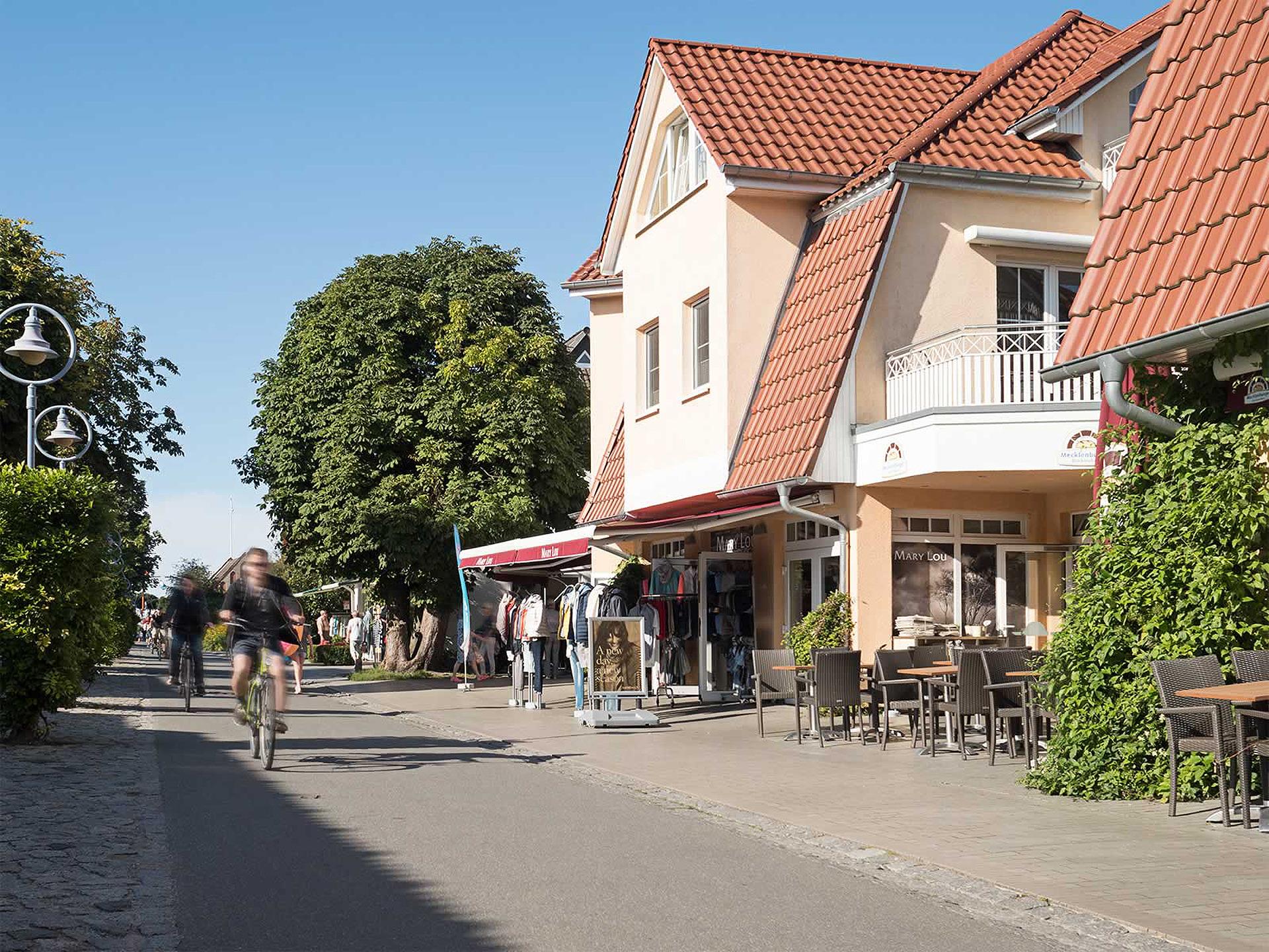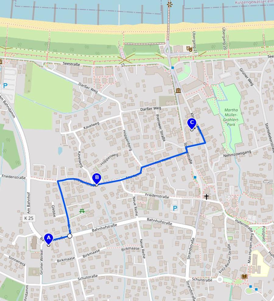 Ab Zimmervermittlg, Am Bahnhof, 1 Str. links "Gelbe Straße" / 3. Str. rechts "Friedenstraße / Alte Reihe" / links "Strandstr." 1. Str. rechts "Kosterstraße" -vor dem Geschäft "Casa Moden", links, bis Nr. 1 b "Torbogen u.1 c" Zufahrt zum PP,