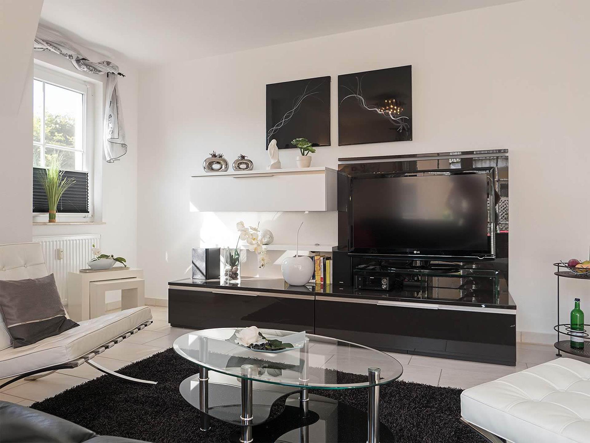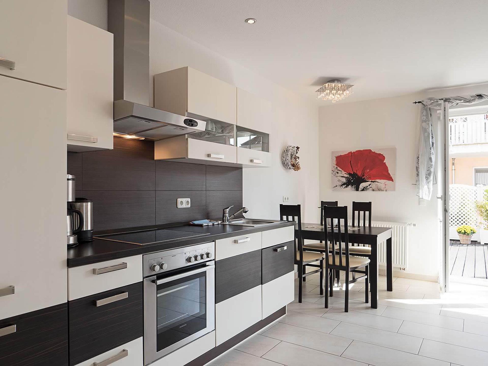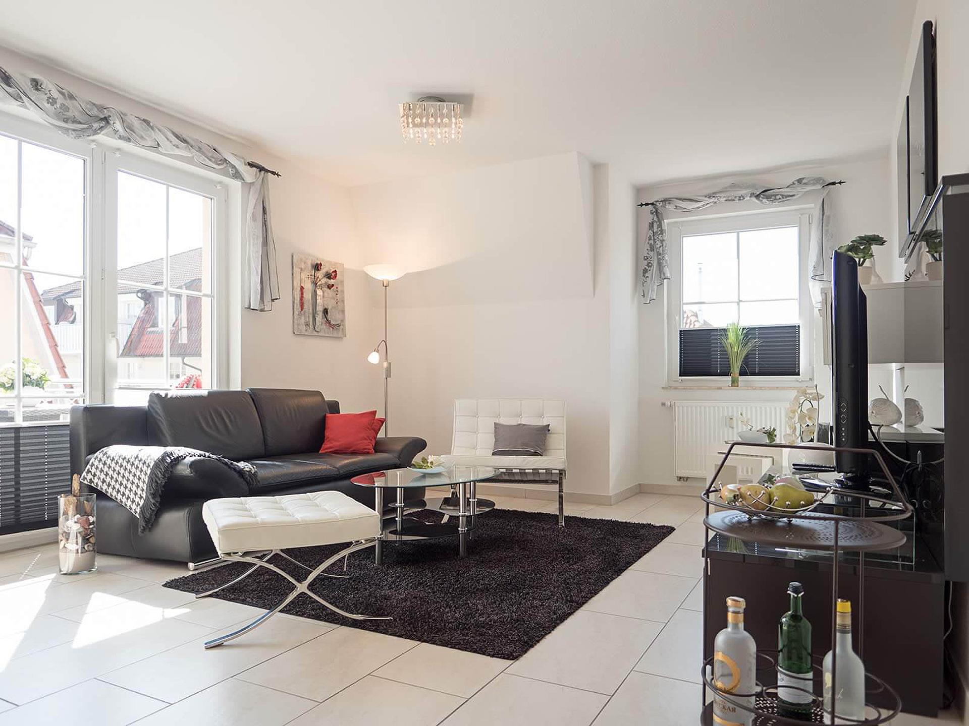 Die stilvoll und hochwertig eingerichtete Nichtraucherwohnung im Herzen von Zingst bietet auf ca. 55 qm Wohnfläche Platz für 2 Personen und ist ausgestattet mit einem Schlafraum (Doppelbett), einem Wohnbereich mit einer Küchenzeile (Spülmaschine, Kühlschrank, Herd mit Cerankochfeld, Kaffeemaschine, Toaster ..) und einem Bad mit DU und WC. Zur weiteren Einrichtung gehören ein großer Flachbildfernseher, ein Radio und ein zweiter TV im Schlafzimmer.