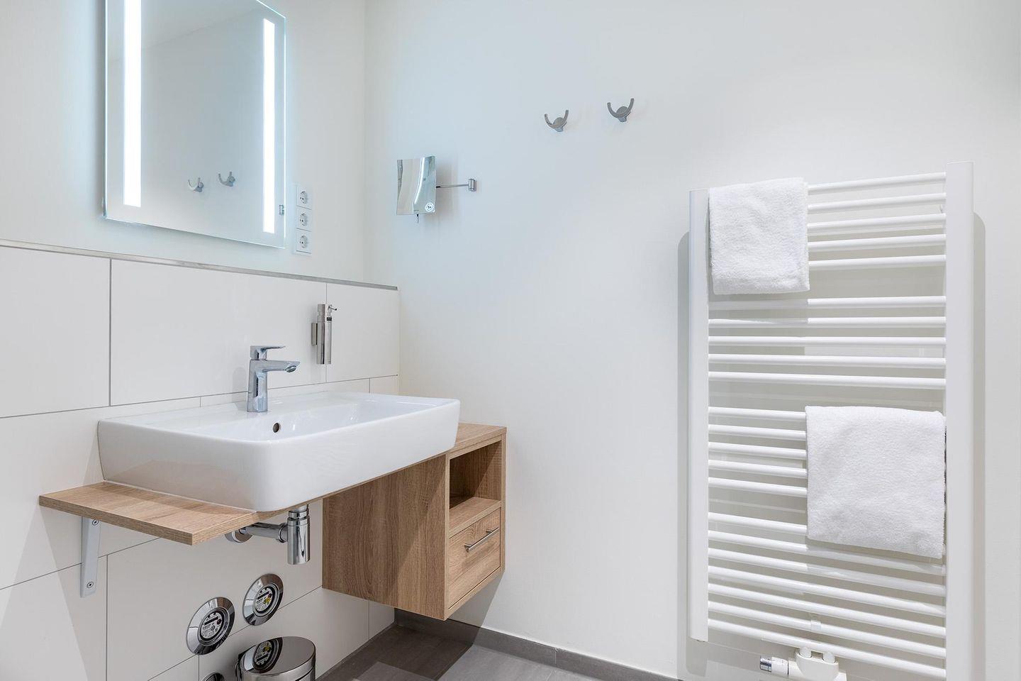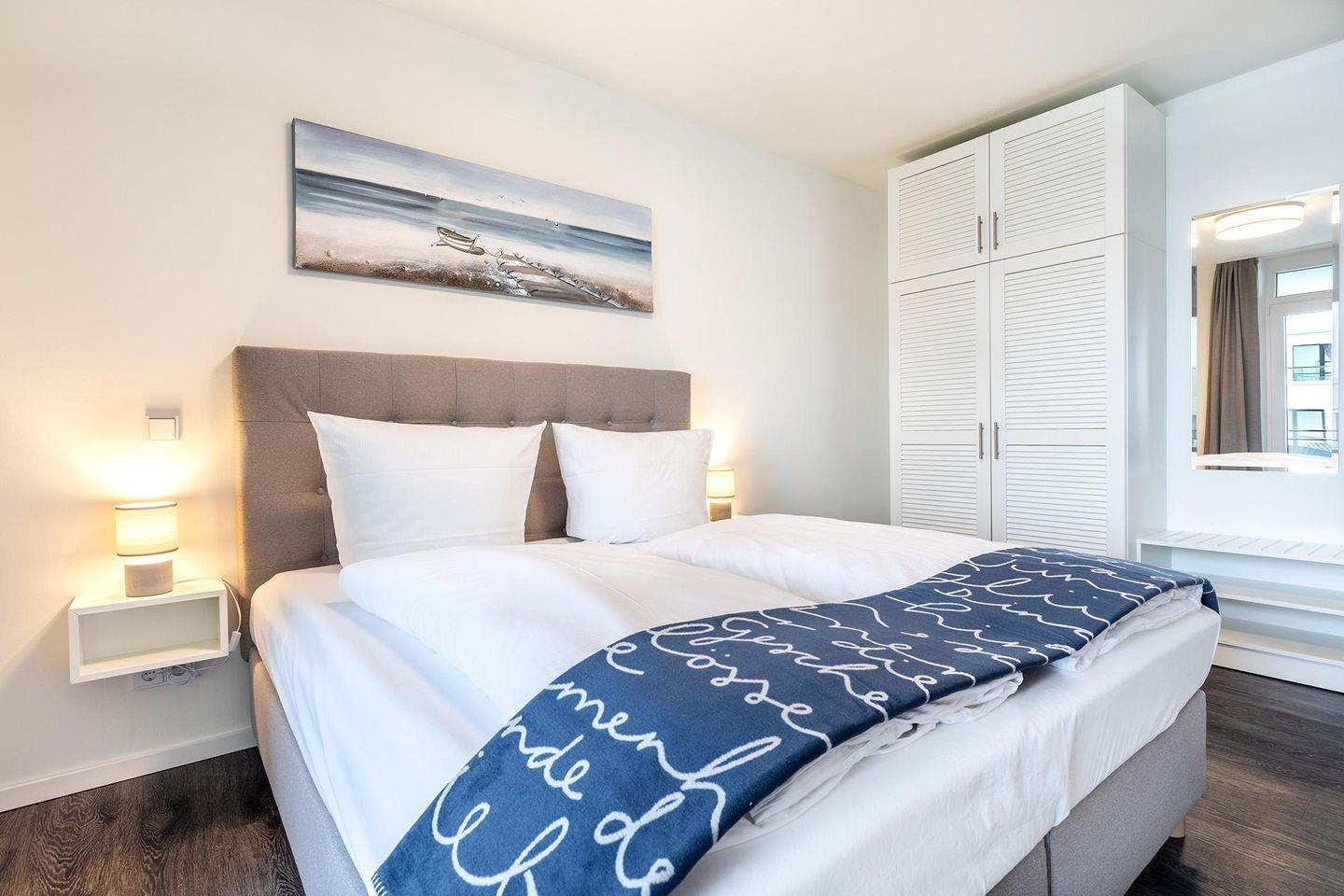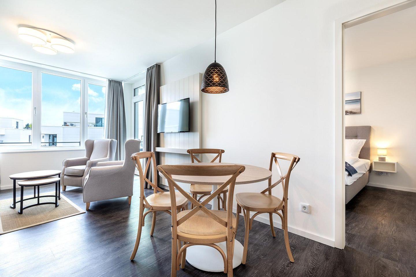 Das helle und moderne Nichtraucher-Apartment verfügt über Fußbodenheizung, sonnenschutzverglaste, teilweise bodentiefe Fenster, kostenfreies WLAN und eine voll ausgestattete offene Küche mit Geschirrspüler, Gefrier- und Kühlschrankkombination, Kaffeemaschine, Eierkocher, Toaster, Wasserkocher, Mikrowelle, Herd mit Glaskeramikkochfeld und Backofen sowie über einen behaglichen Wohn-Essbereich. Im Wohnbereich befindet sich eine Doppelschlafcouch (1,40 x 2,00 m) und ein SMART-TV (43 Zoll). Im separaten Schlafzimmer bietet ein modernes Boxspringbett (1,80 x 2,00 m) hohen Schlafkomfort. Auch hier befindet sich ein SMART-TV (43 Zoll). Im stilvollen Badezimmer stehen euch eine ebenerdige Dusche, WC, Waschtisch mit Föhn, Kosmetikspiegel, Handtuchheizkörper und Fußbodenheizung zur Verfügung. Entspannte Stunden verbringt ihr auf der überdachten Loggia, die nach Westen liegt und mit Gartenmöbeln ausgestattet ist. Die Loggia ist sowohl vom Wohnbereich als auch vom Schlafzimmer aus zugänglich.