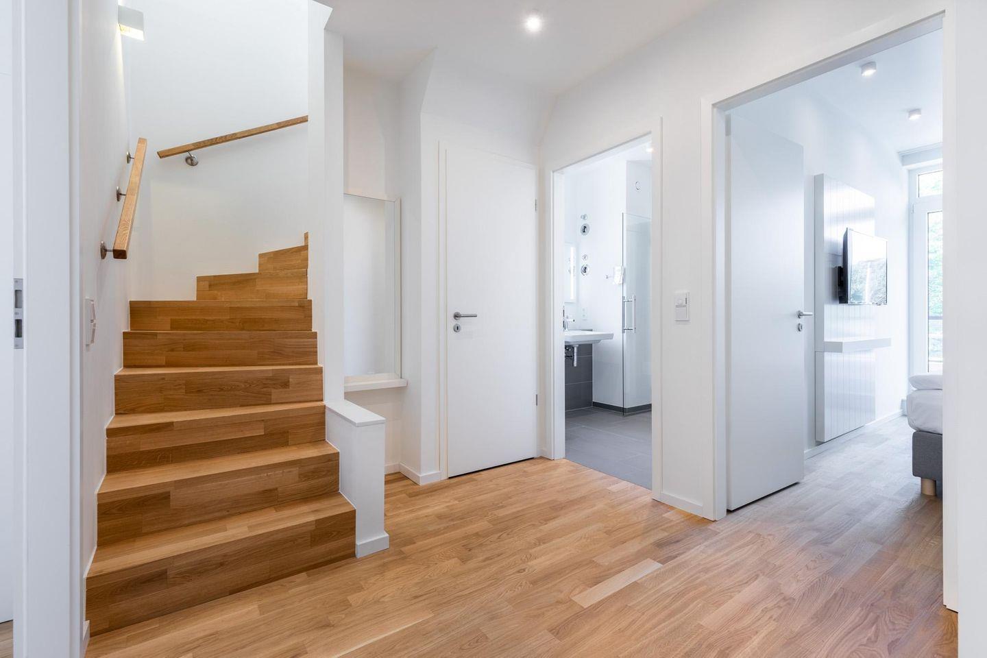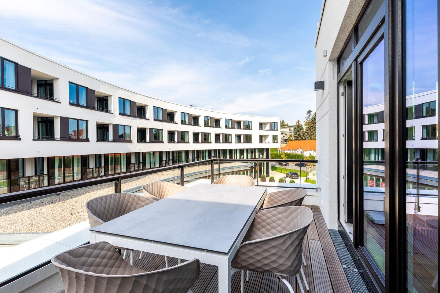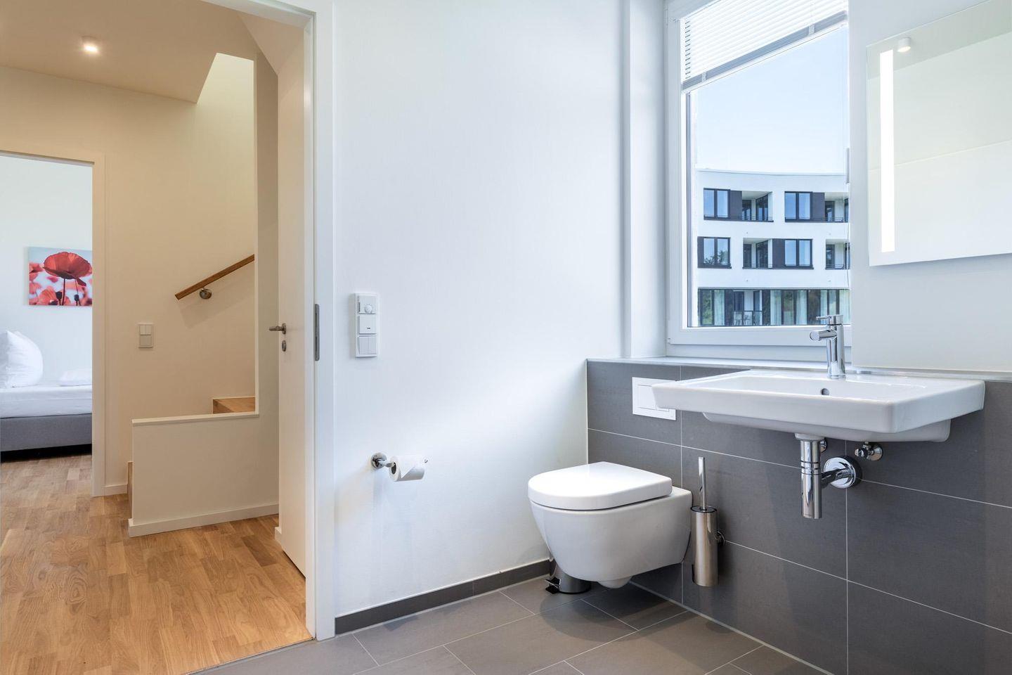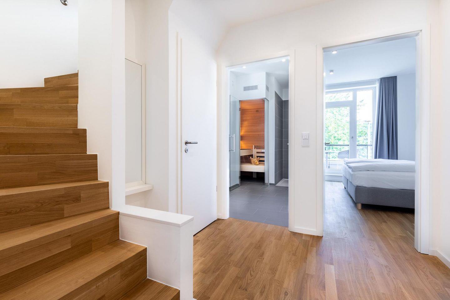 Das helle und moderne Nichtraucher-Apartment verfügt über Echtholzparkett, Fußbodenheizung, sonnenschutzverglaste Fenster und kostenfreies WLAN. Auf der zweiten Wohnebene im zweiten Obergeschoss befindet sich der großzügig konzipierte Wohn-Essbereich und die voll ausgestattete offene Küche mit Geschirrspüler, Gefrier- und Kühlschrankkombination, Kapsel-Kaffeemaschine (Cafissimo), Filter-Kaffeemaschine, Toaster, Wasserkocher, Eierkocher, Mikrowelle, Backofen und Herd mit innovativem BORA Kochfeldabzug sowie ein Bügelbrett und Bügeleisen. Des weiteren verfügt diese Etage über ein separates WC und einen Abstellraum.