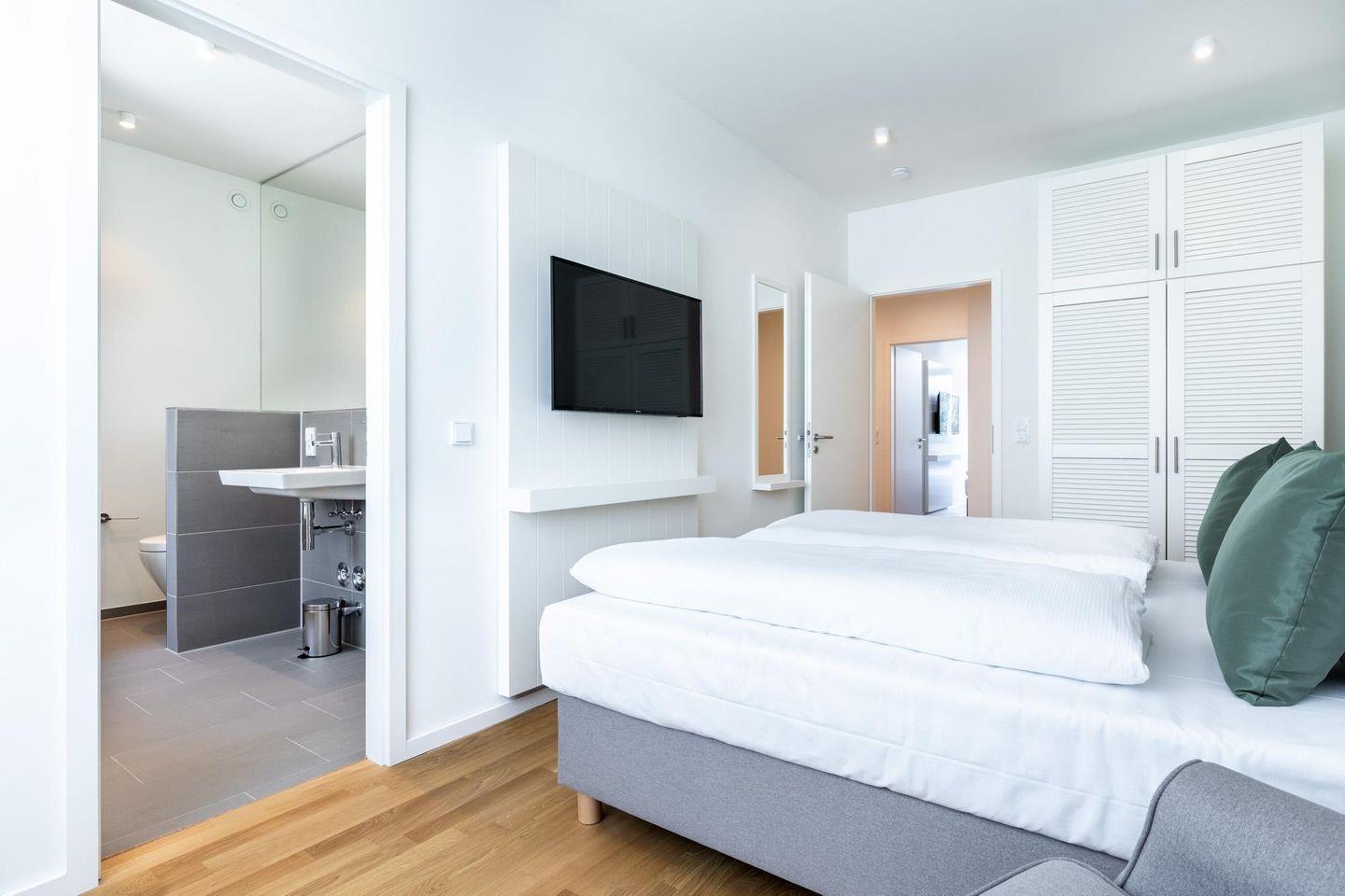 Das 125 m² große 4-Zimmer Maisonette-Apartment ist für bis zu 5 Erwachsene oder 4 Erwachsene und 2 Kinder geeignet. Besonders hervorzuheben ist die private Sauna und die Dachterrasse; hier könnt ihr bis in den Abend hinein die Sonne und das Meeresklima genießen. Überdies verfügt das moderne Apartment über den Luxus von zwei Bädern.