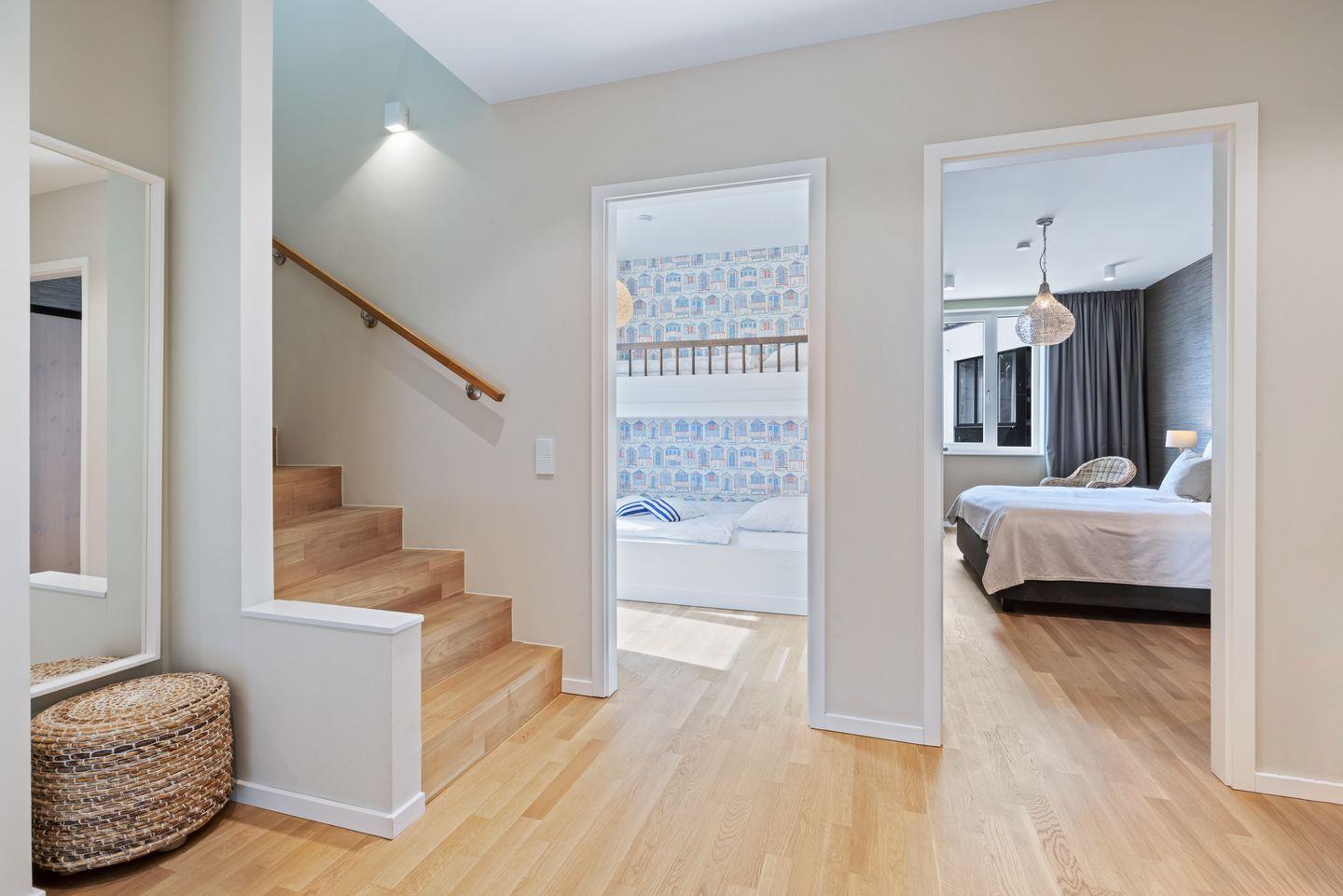 Die drei separaten Schlafzimmer auf der ersten Etage bieten hohen Schlafkomfort durch zwei moderne Boxspringbetten (1,80 x 2,00 m) bzw. ein hochwertiges Etagenbett für zwei Personen - idealerweise für Kinder, aber auch für Erwachsene hervorragend geeignet (1,00 x 2,00 m und 1,40 x 2,00 m). Die Schlafzimmer verfügen allesamt über Blackout-Vorhänge und Klimageräte. Ein Kinderbett kann gegen Entgelt aufgestellt werden.