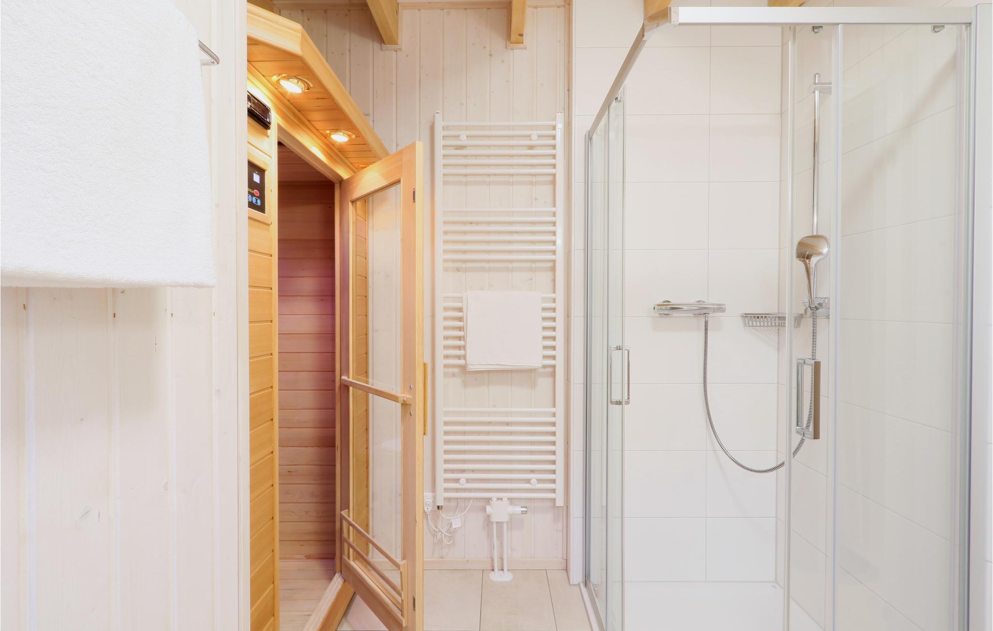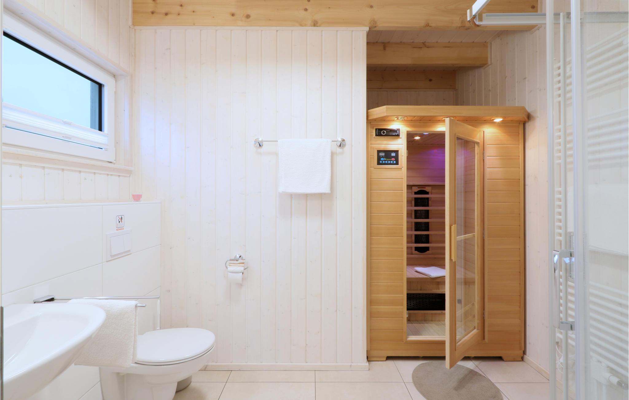 På husets førstesal ligger begge de store soveværelser og et af badeværelserne.I dagligstuen i stueetagen er der to yderlige sovepladser på sovesofaen. I badeværelset i stueplan ligger den private infrarøde varmekabine.
