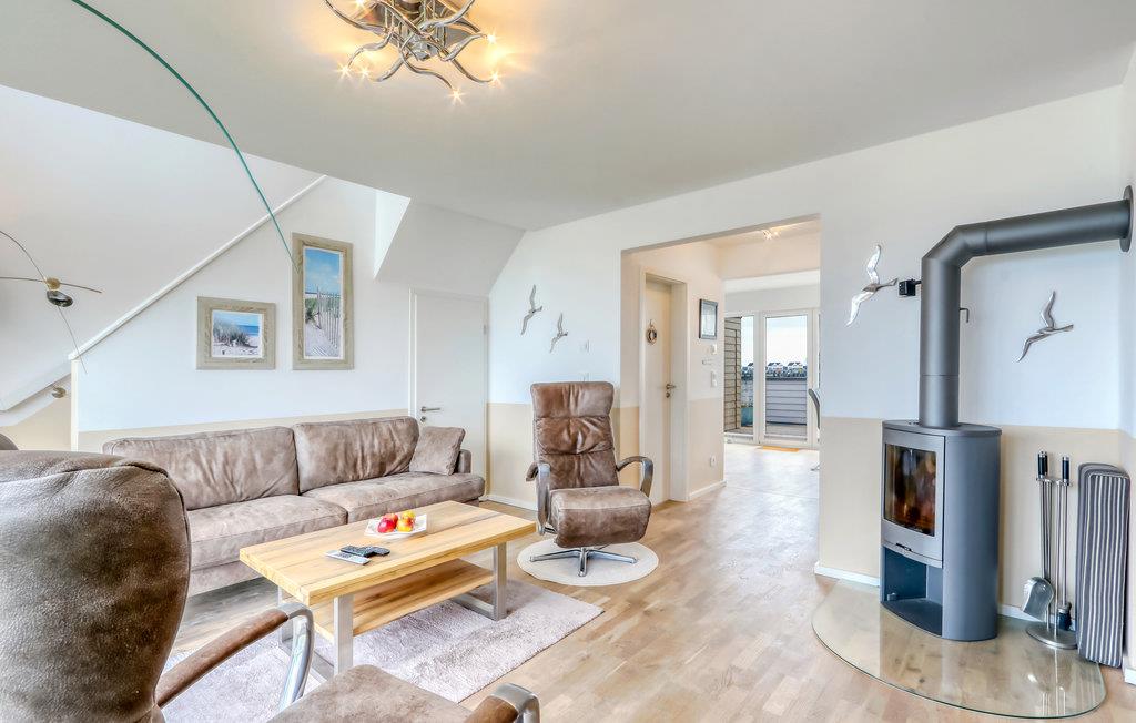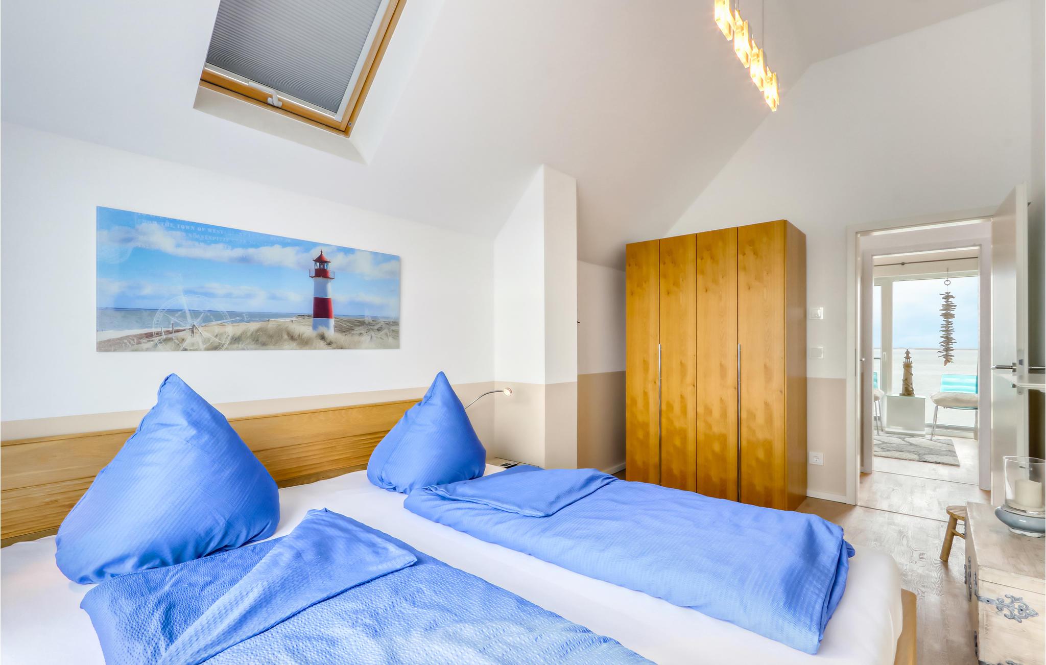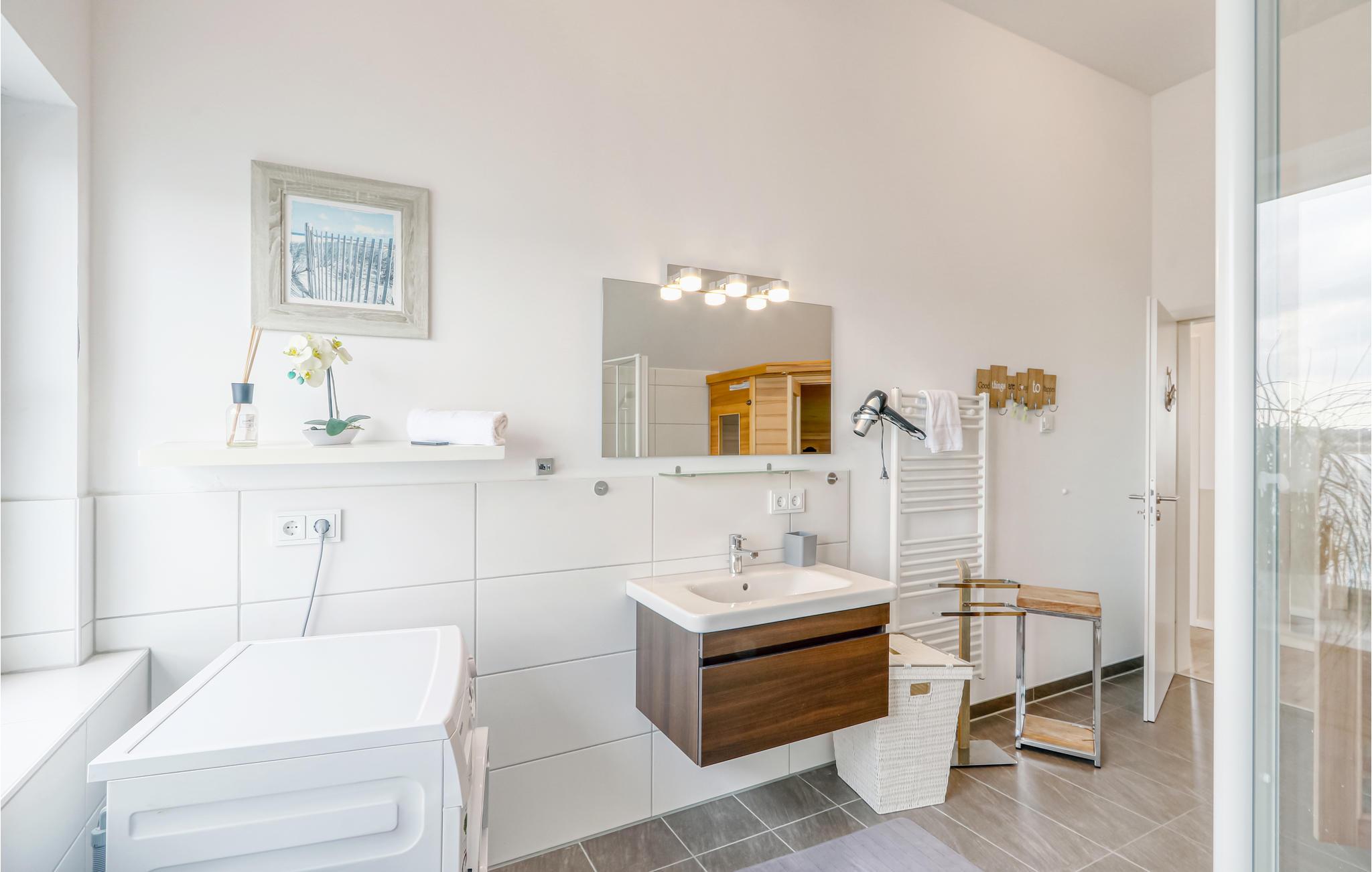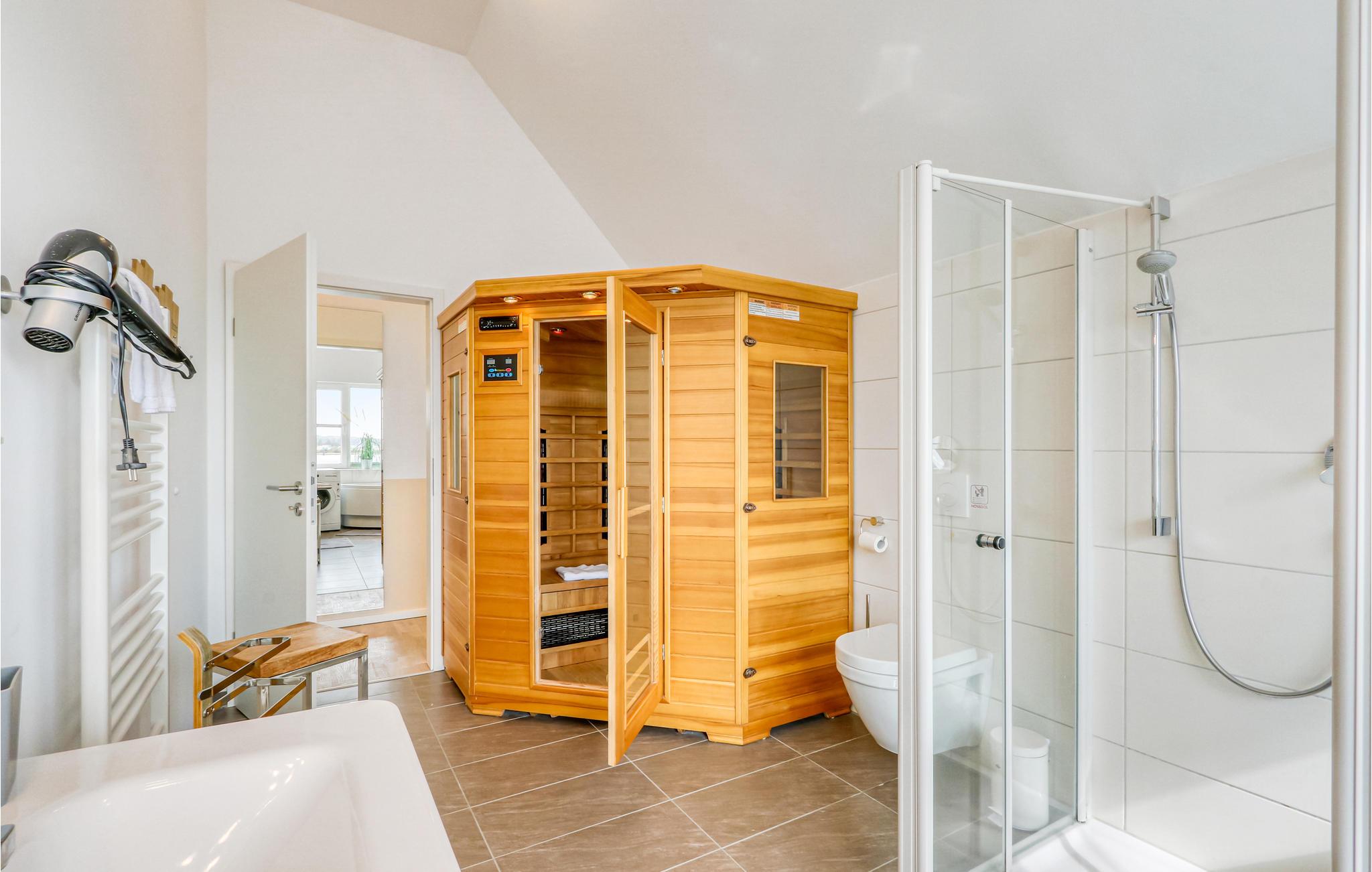 Maisonettelejligheden strækker sig over to etager (1. og 2. sal). Ovenpå finder du, udover de to soveværelser, badeværelset, hvor et stort hjørnebadekar med massagedyser lægger op til at slappe af. Et særligt højdepunkt er den infrarøde sauna. Er der noget bedre end at berolige trætte muskler i den hyggelige varme efter en lang dag ved havet og derefter slappe af foran den skandinaviske pejs?
