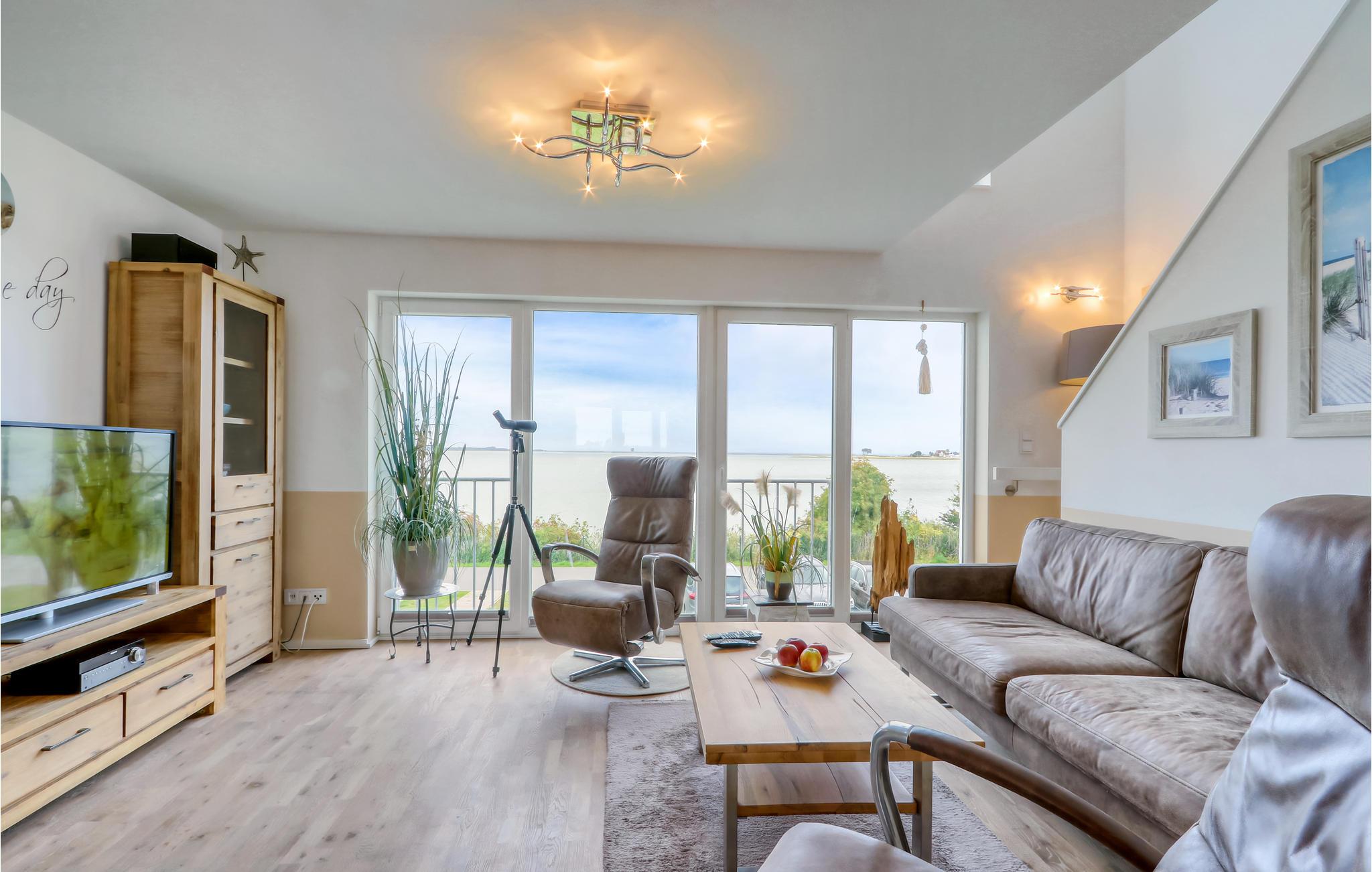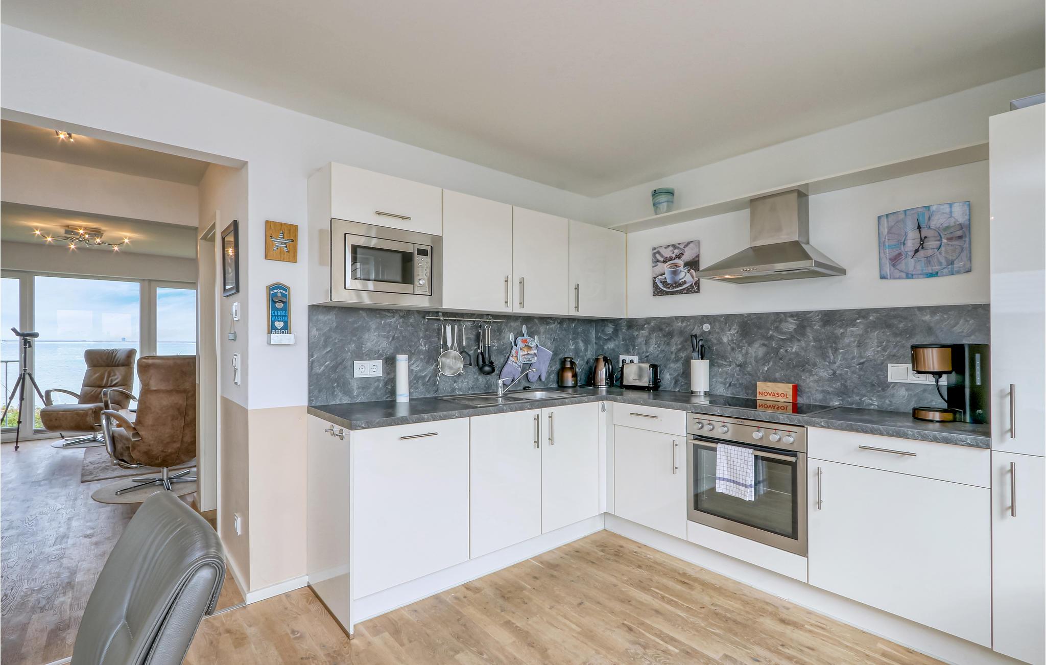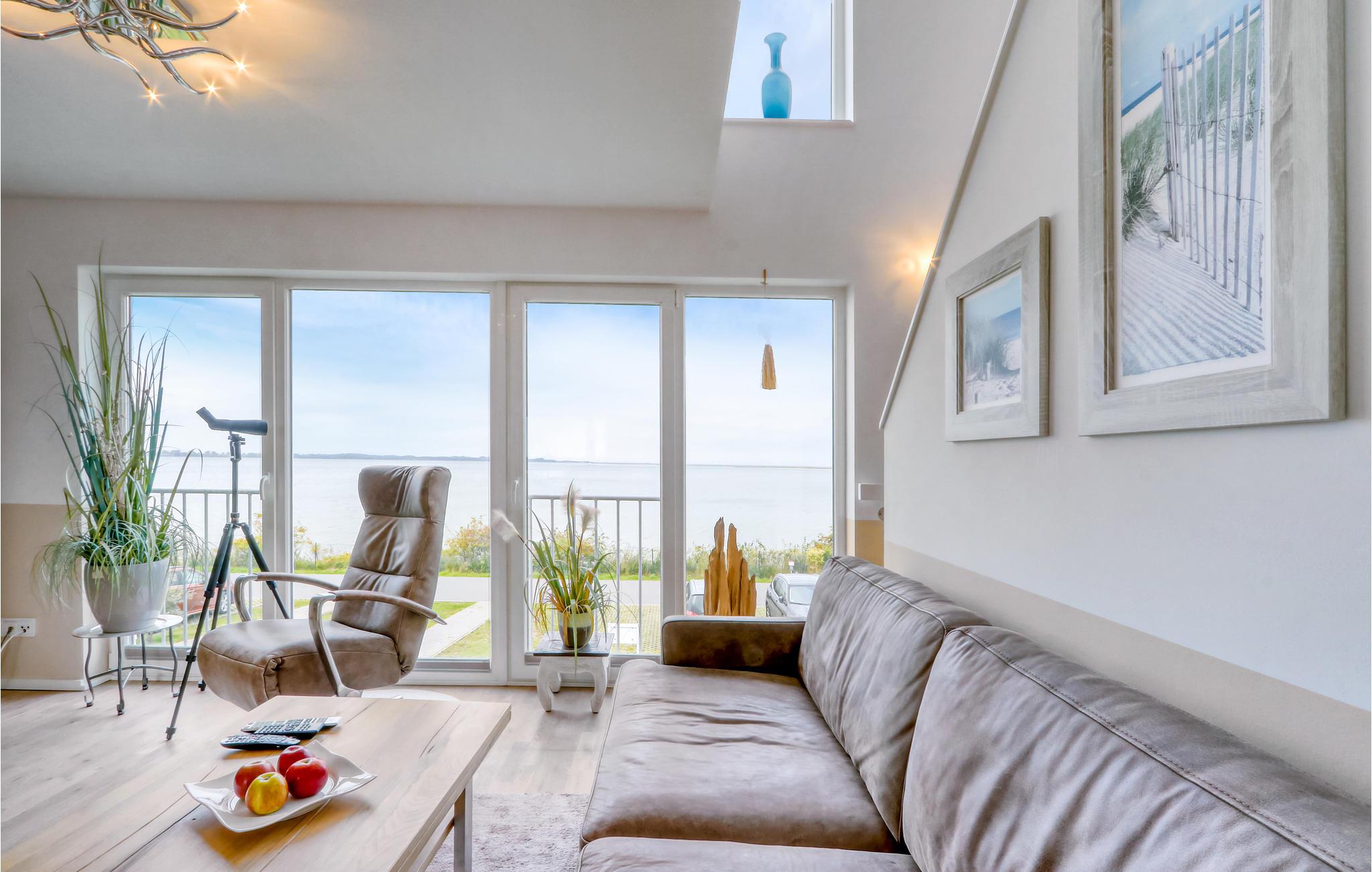 Selv hvis vejret ikke er med jer, behøver I ikke at gå glip af den storslåede udsigt. Fra den velindrettede og komfortable opholdsstue kan I også se ud over Sliens blå vand. Fra spisestuen og det moderne køkken, selv fra sengen og det store badekar, har I en vidunderlig udsigt over vandet, måger og både. Denne panoramaferielejlighed er en oplevelse ikke kun i strålende sommersolskin, men især om efteråret og vinteren, når storme og bølger raser omkring husrækken på det smalle forbjerg, mens I komfortabelt kan betragte skuet fra jeres sofa.