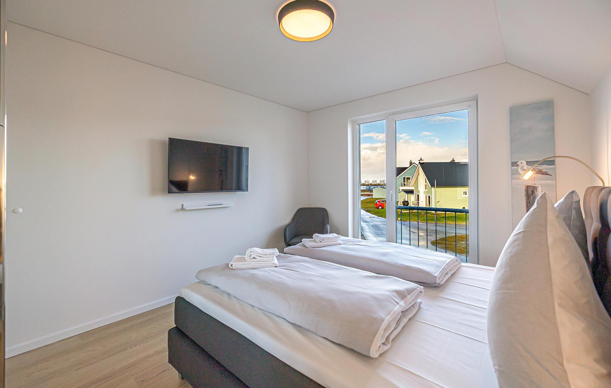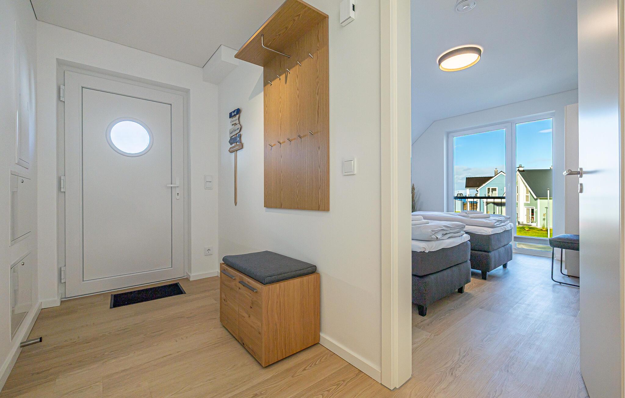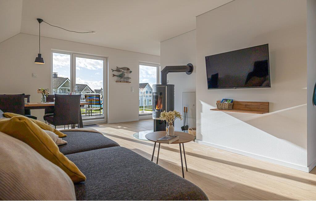 I træder ind i ferielejligheden via den overdækkede terrasse. Den lyse stue og spisestue med gulv-til-loft-vinduer danner hjertet af lejligheden. Et vitrineskab, komfortable lænestole og en brændeovn – alt er perfekt koordineret. Klar til en fantastisk spilleaften ved det store bord, en aften foran et af de to smart-tv'er eller en filmaften? Lejlighedens generøse faciliteter inkluderer også en Bluetooth-højttaler til musik eller lydbøger, klassiske brætspil og underholdende børnespil. Det veludstyrede køkken lægger op til at tilberede jeres yndlingsretter og nyde lækre måltider, selv på ferien.