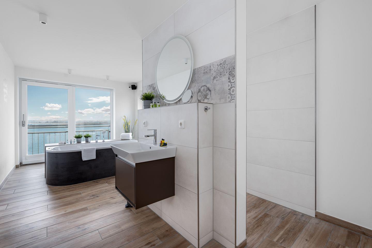 "Sky 65" besticht durch bodentiefe Fenster in allen Zimmern, die nicht nur viel Licht hereinlassen, sondern auch eine fantastische Aussicht auf die Ostsee und das Ostseeresort Olpenitz bieten. Genießen Sie den luxuriösen Komfort von zwei Schlafzimmern und zwei Badezimmern, darunter eine frei stehende Whirlwanne mit direktem Wasserblick, perfekt für entspannte Momente sowie eine große finnische Sauna.