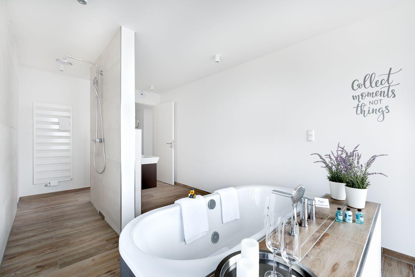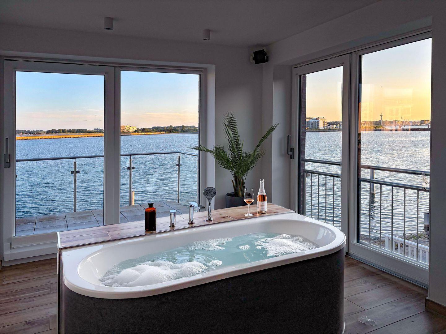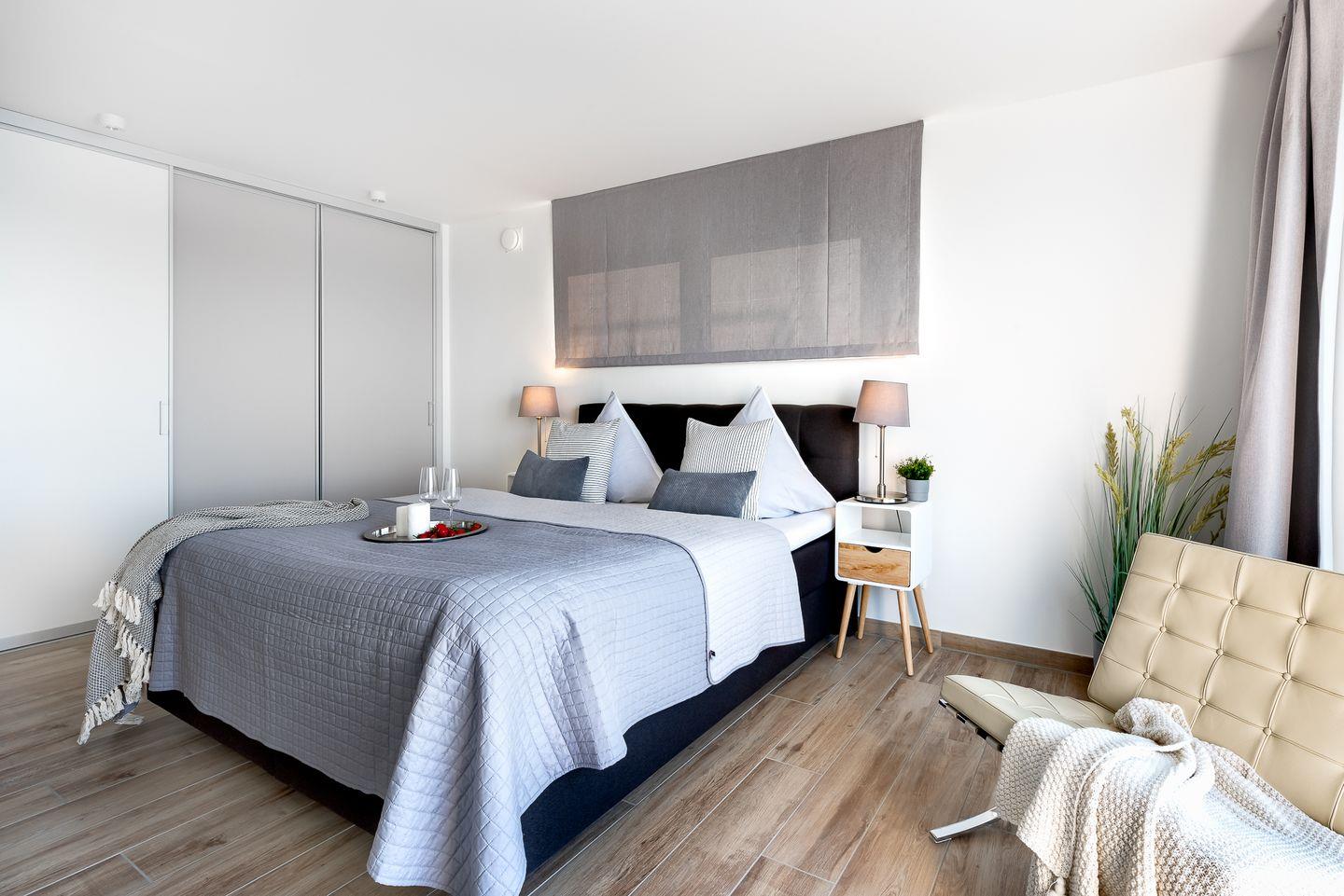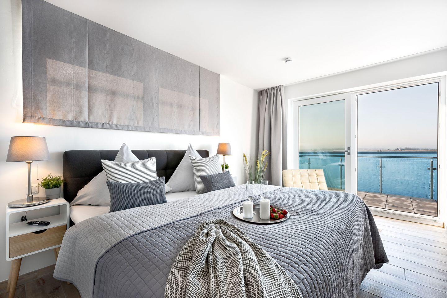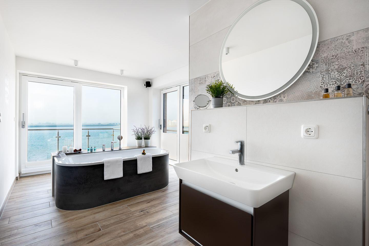 Die Ostsee-Ferienwohnung "Sea 65" beherbergt zwei stilvolle Schlafzimmer, wobei ein optionales drittes Zimmer unter "Sea 65 Plus" hinzugebucht werden kann, perfekt für größere Familien oder Gruppen bis zu 6 Personen. Jedes Schlafzimmer verfügt über ein eigenes Badezimmer. Eine frei stehenden Whirlwanne mit einzigartigem Wasserblick finden Sie im Badezimmer im Obergeschoss. Die finnische Sauna lädt zum Entspannen ein.