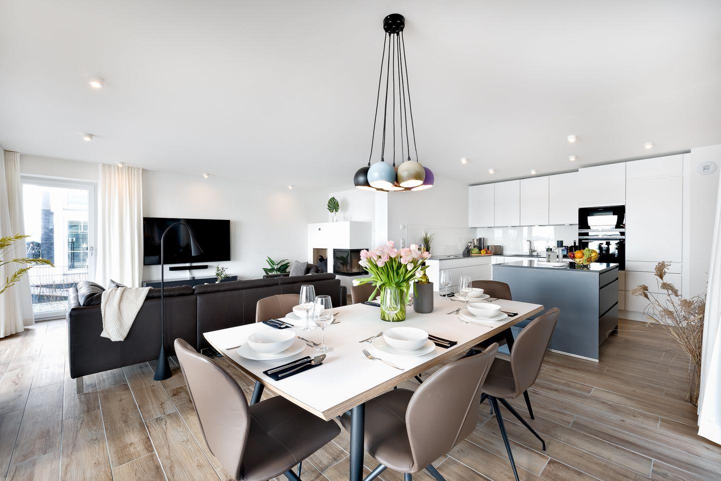 Die Wohnung zeichnet sich durch bodentiefe Fenster aus, die alle Räume mit natürlichem Licht fluten und einen freien Blick auf das Ostseeresort Olpenitz und die Ostsee ermöglichen. Die Terrasse im Erdgeschoss und einem Balkon im Obergeschoss laden dazu ein, die Seele baumeln zu lassen und das maritime Flair des Ostseeresort Olpenitz in vollen Zügen zu genießen.