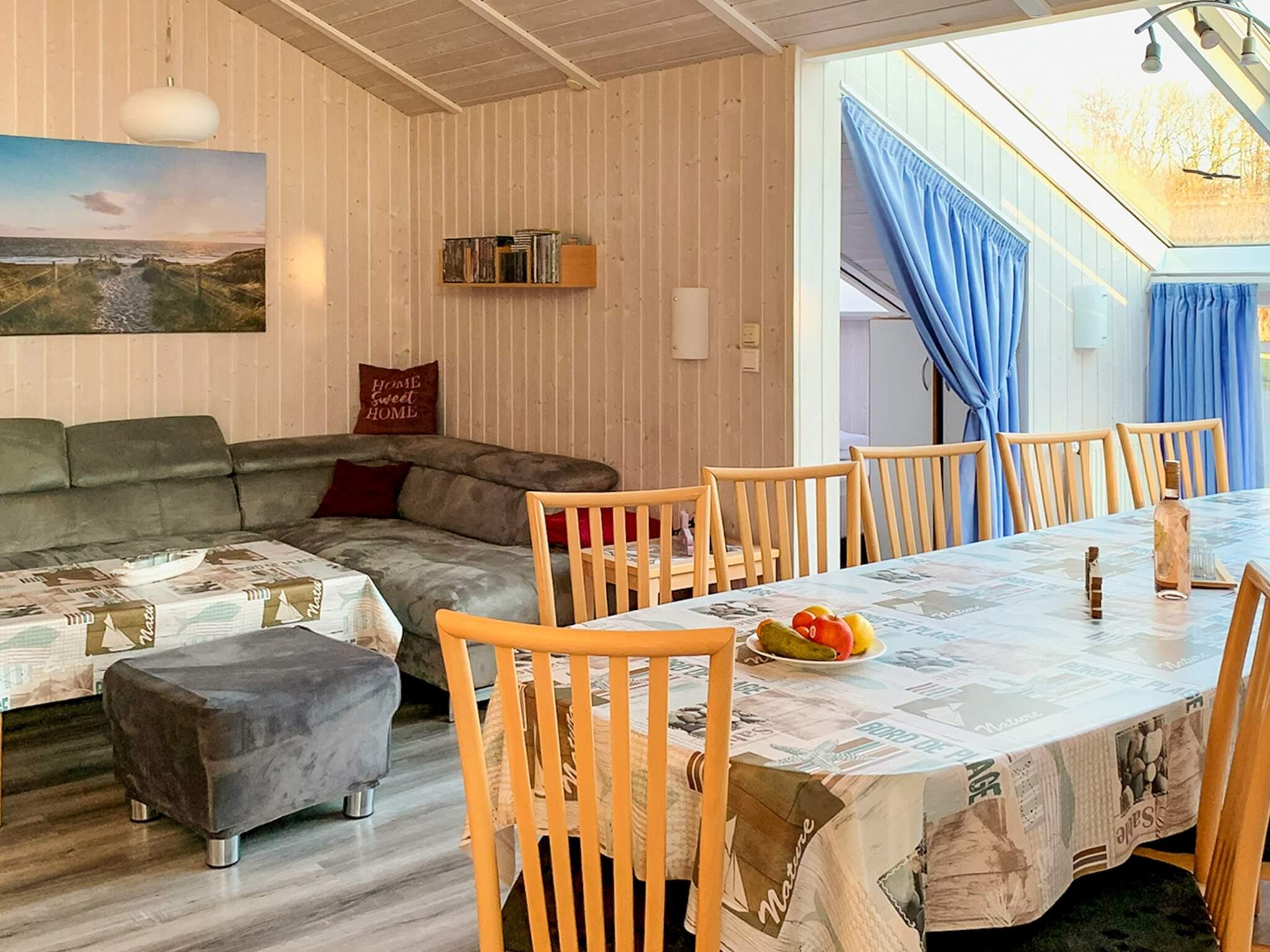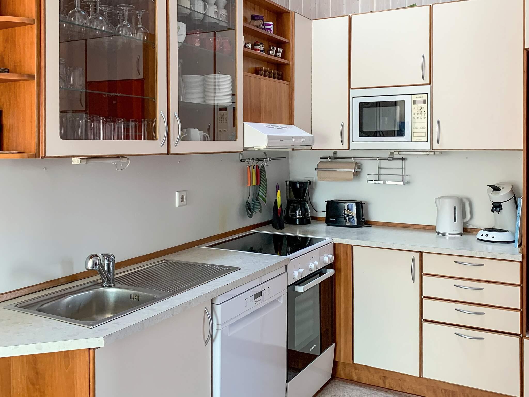 I tilknytning hertil ligger det åbne, moderne udstyrede køkken med bl.a. en Senseo-kaffemaskine. Opvaskemaskinen og køleskabet blev skiftet ud i 2022. Af yderligere udstyr er der liggestole, parasol, muret grill, barneseng og højstol inklusive, boghjørne, spil til store og små, 1000 GB Internet, stort LCD-fjernsyn og dvd-afspiller med film. I soveværelset ved indgangen findes der også et tv. Gulvet i stuen blev skiftet i 2022.