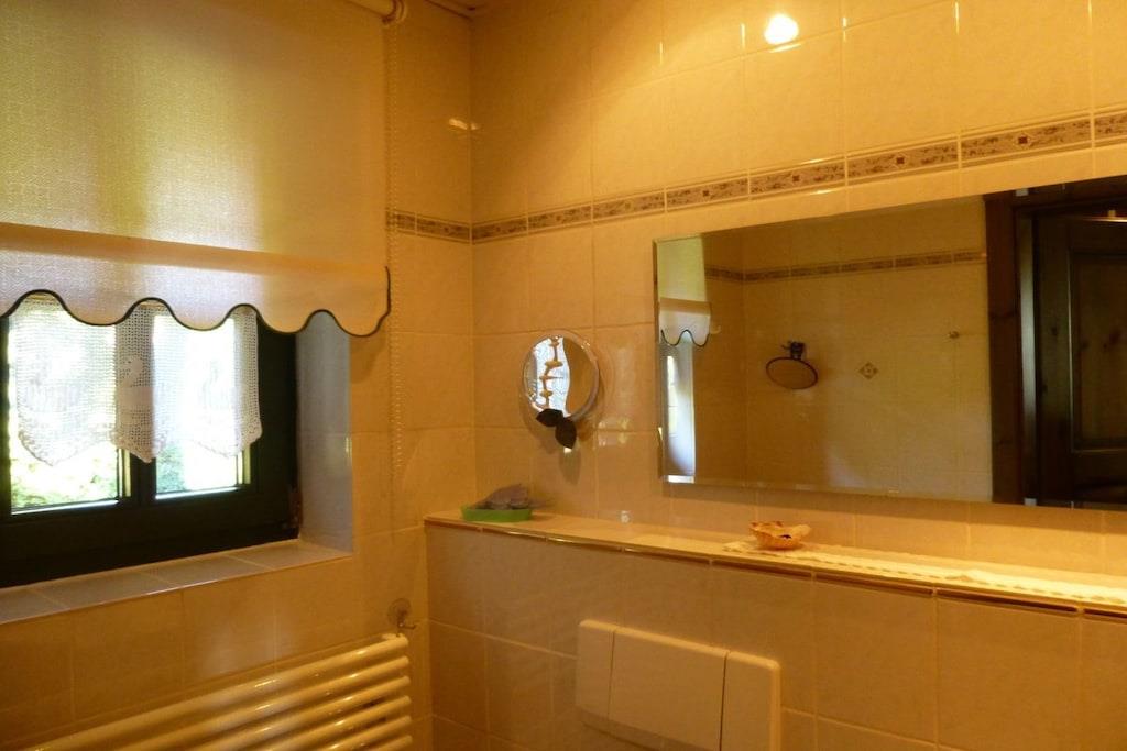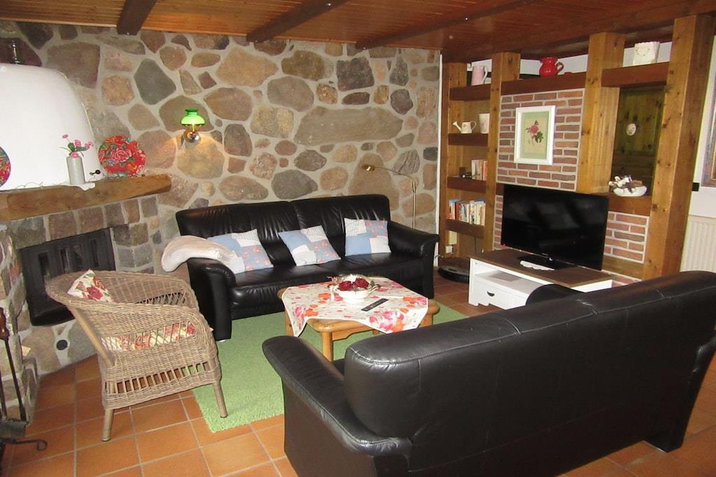 Stueetage: (stue / spisestue(, Fjernsyn, spisebord, pejs), soveværelse(, , dobbeltseng), Børneværelse(køjeseng)) , , badeværelse(, toilet, bruser, håndvask), guest toilet(toilet, håndvask), carport, vaskemaskine, varme, parkering, tørreskab