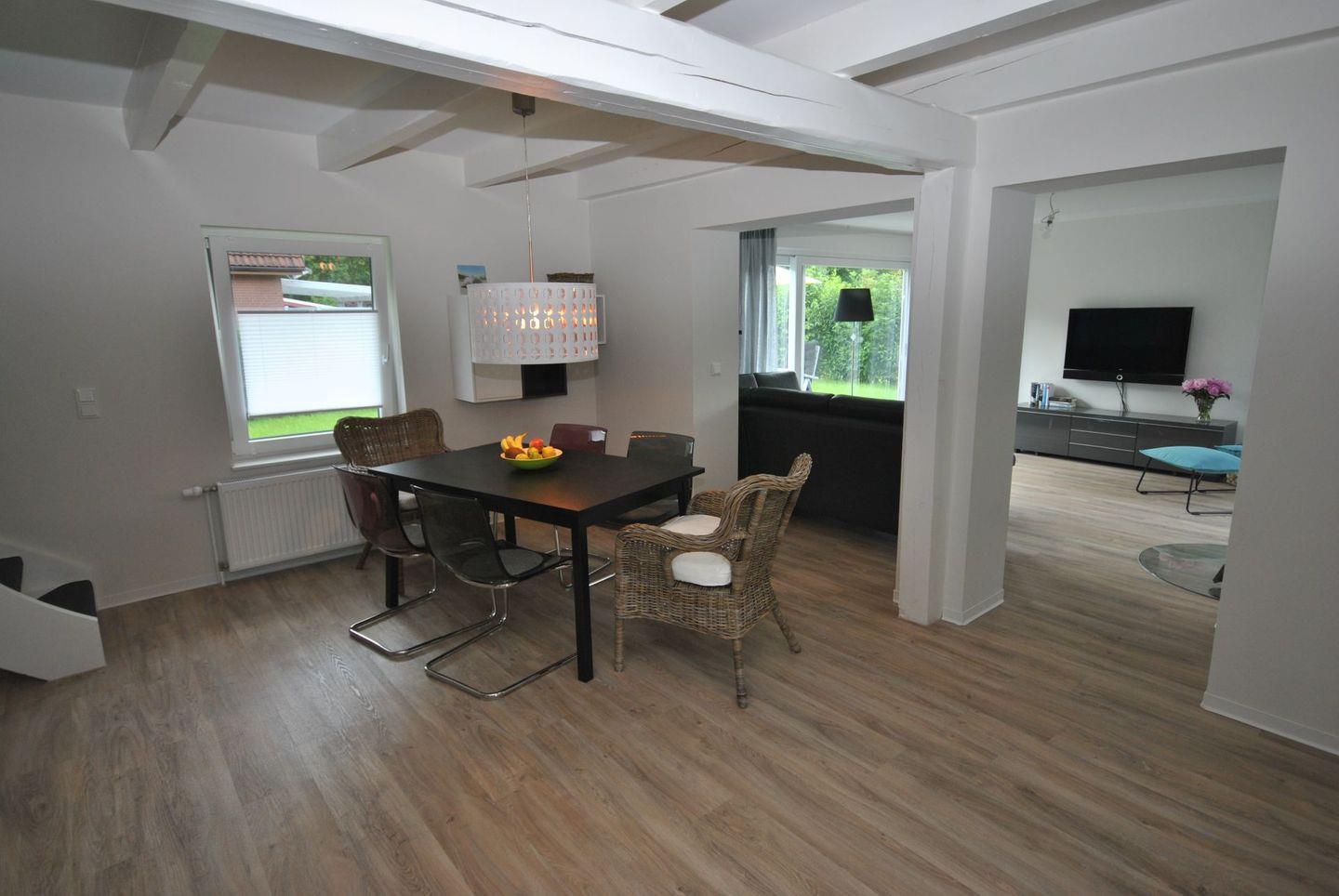 Das Nichtraucher-Ferienhaus "Deichgräfin" wurde in 2015 komplett saniert und modernisiert. Vom Ferienhaus aus haben Sie einen herrlichen Blick auf den Deich. Die Nähe zum Strand, den Badeseen, den Freizeitanlagen und der Spiel-& Spaßscheune machen dieses Ferienhaus zum idealen Ausgangspunkt für den perfekten Familienurlaub. Das Ferienhaus Deichgräfin ist ausgestattet mit einem großen Wohn- und Essbereich. Hier finden Sie genügend Sitzmöglichkeiten für die gemeinsamen Mahlzeiten und eine großzügige Couchgarnitur. Der dänische Kaminofen sorgt in den kalten Monaten für wohlige Wärme und ein romantisches Ambiente. Der Flat-TV mit Sat-Anlage, die Stereoanlage und der DVD-Player stehen hier für Sie bereit. Die beiden Schlafräume (eins mit Ehebett, eins mit zwei einzeln stehenden Betten) befinden sich im Obergeschoss. Hier finden Sie auch eines der beiden Duschbäder. Das zweite Duschbad, sowie das Lesezimmer mit einem Smart-TV und Blue-Ray-Player finden Sie im Erdgeschoss. Im Lesezimmer befindet sich eine Schlafcouch, welche für die 5. Person gedacht ist. Der Wohnraum mit den vielen Fenstern ist hell und modern gestaltet. Auch die Küchenzeile lässt keine Wünsche offen. Hier finden Sie die Geschirrspülmaschine, den E-Herd mit Backofen, sowie alle Kochutensilien, die Sie zum Zubereiten Ihrer Mahlzeiten benötigen. Der große Garten lädt mit der Süd-Ostterrasse zum Sonnen und Verweilen ein.