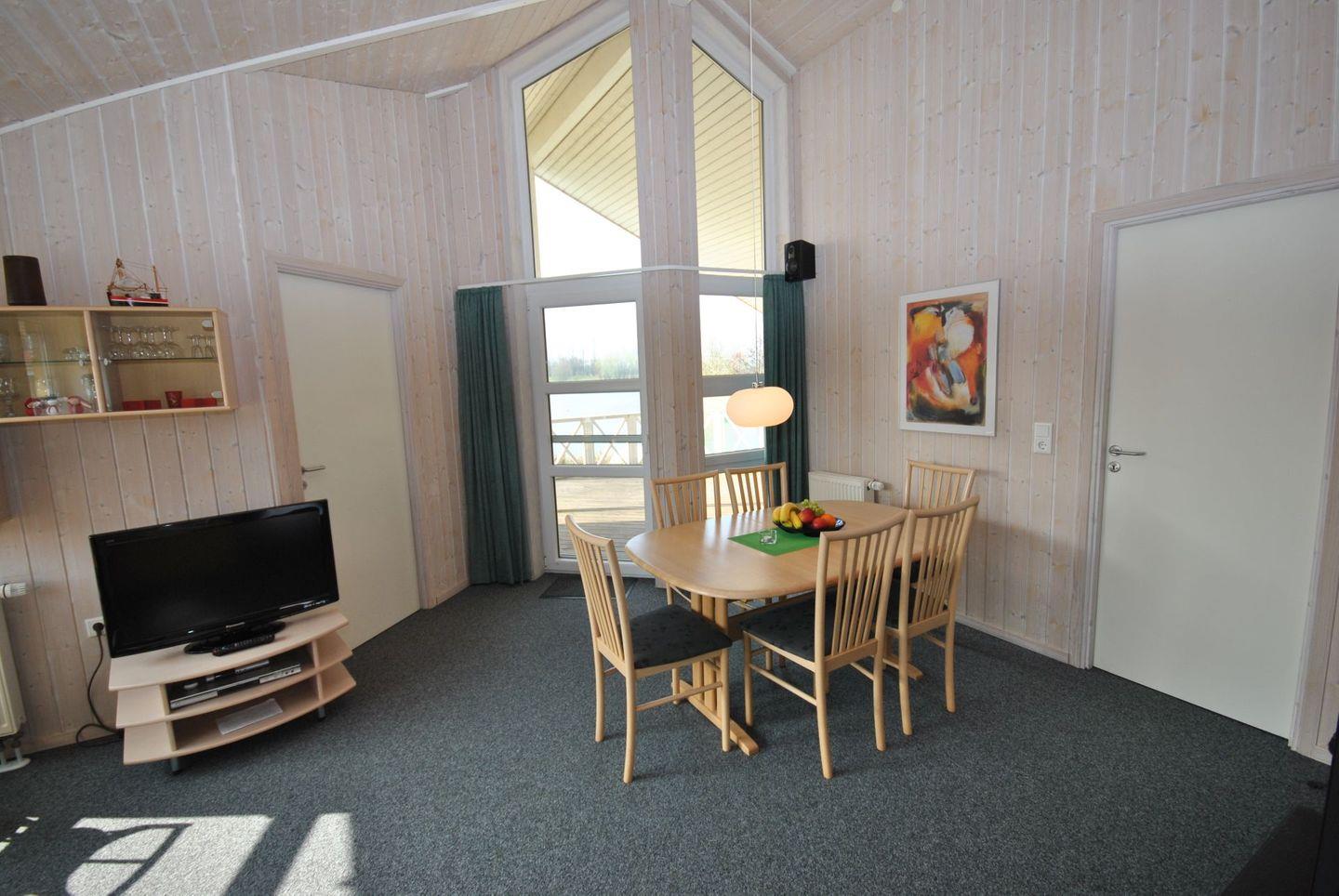 Das gemütlich eingerichtete, ebenerdige Ferienhaus bietet Platz für 6 Personen. Im Haus finden Sie zwei Doppelschlafzimmer und ein Schlafzimmer mit Einzelbetten, ein Badezimmer mit Sauna, Whirlpool, Dusche und WC. In dem geräumigen Wohnzimmer befinden sich eine Couchgarnitur und ein Kaminofen, sowie eine gemütliche Essecke. In der Einbauküche befindet sich ein Kühl-Gefrierschrank, Geschirrspülmaschine und Mikrowelle. Die Terrasse ist zum Teil überdacht und man kann eine herrliche Aussicht über das Wasser genießen.
