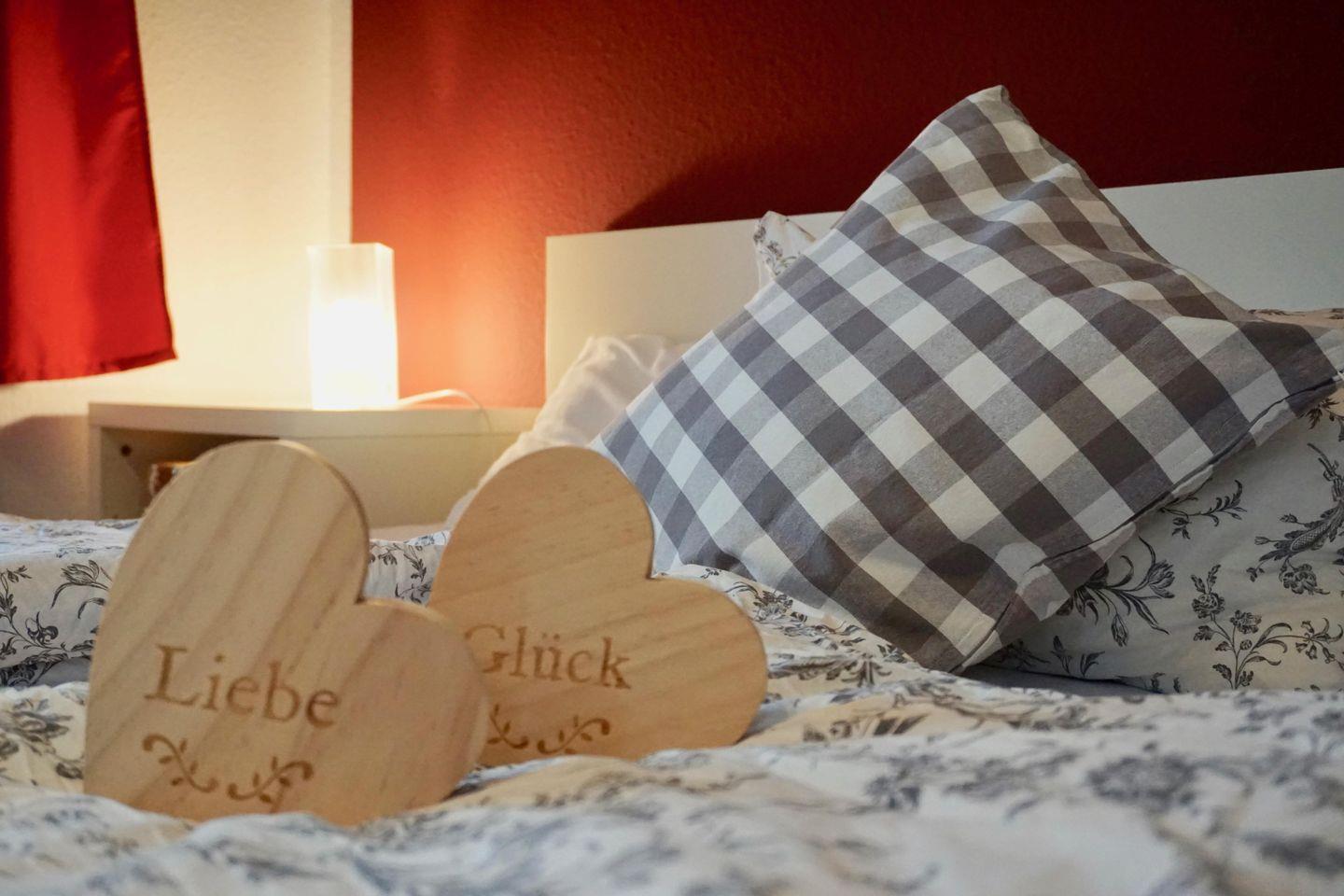 - Ein Schlafzimmer mit Doppelbett, orthopädischer Kaltschaummatratze und zusätzlichem Topper
