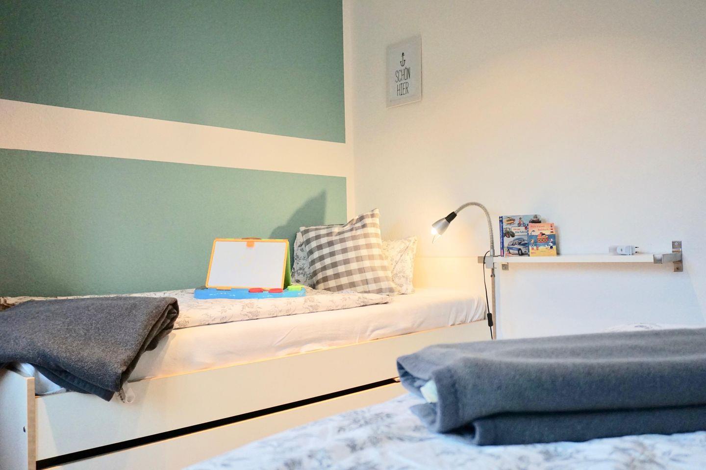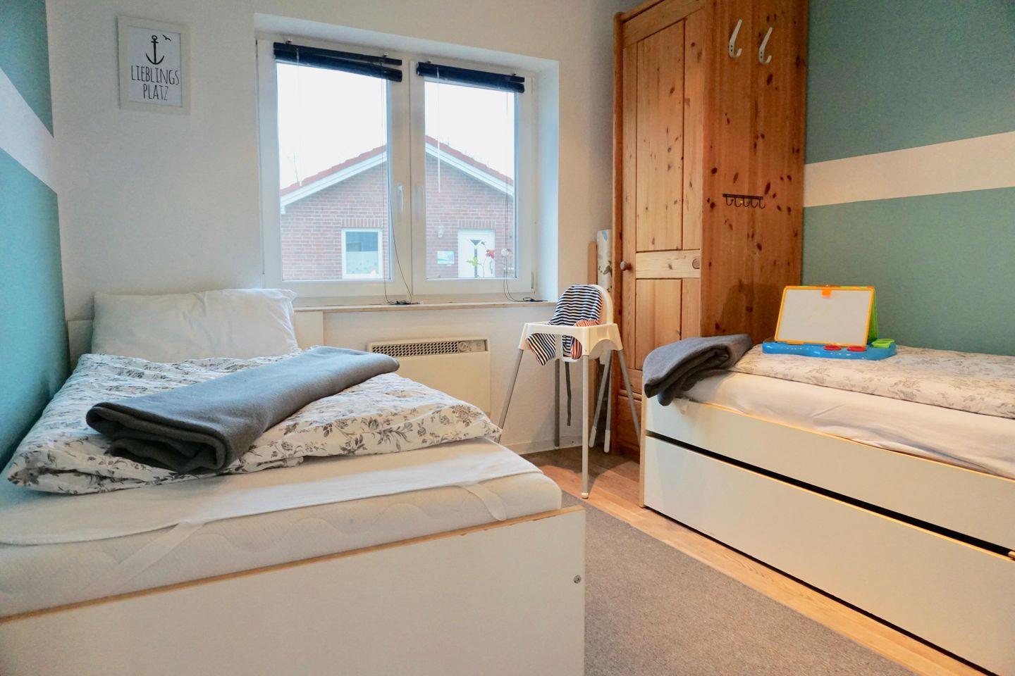 Für die Kids gibt es ein separates Kinderschlafzimmer mit 2 Einzelbetten und Kleiderschrank, Kinderreisebett, Hochstuhl, Wickeltisch, Spiele/Spielzeug, Bücher, Töpfchen, Toilettensitz, Tritthocker, Babykost- und Flaschenwärmer, einen Garten zum Toben mit Schaukel, Rutsche, Sandkasten, Sandspielzeug und ganz viel frische Seeluft.