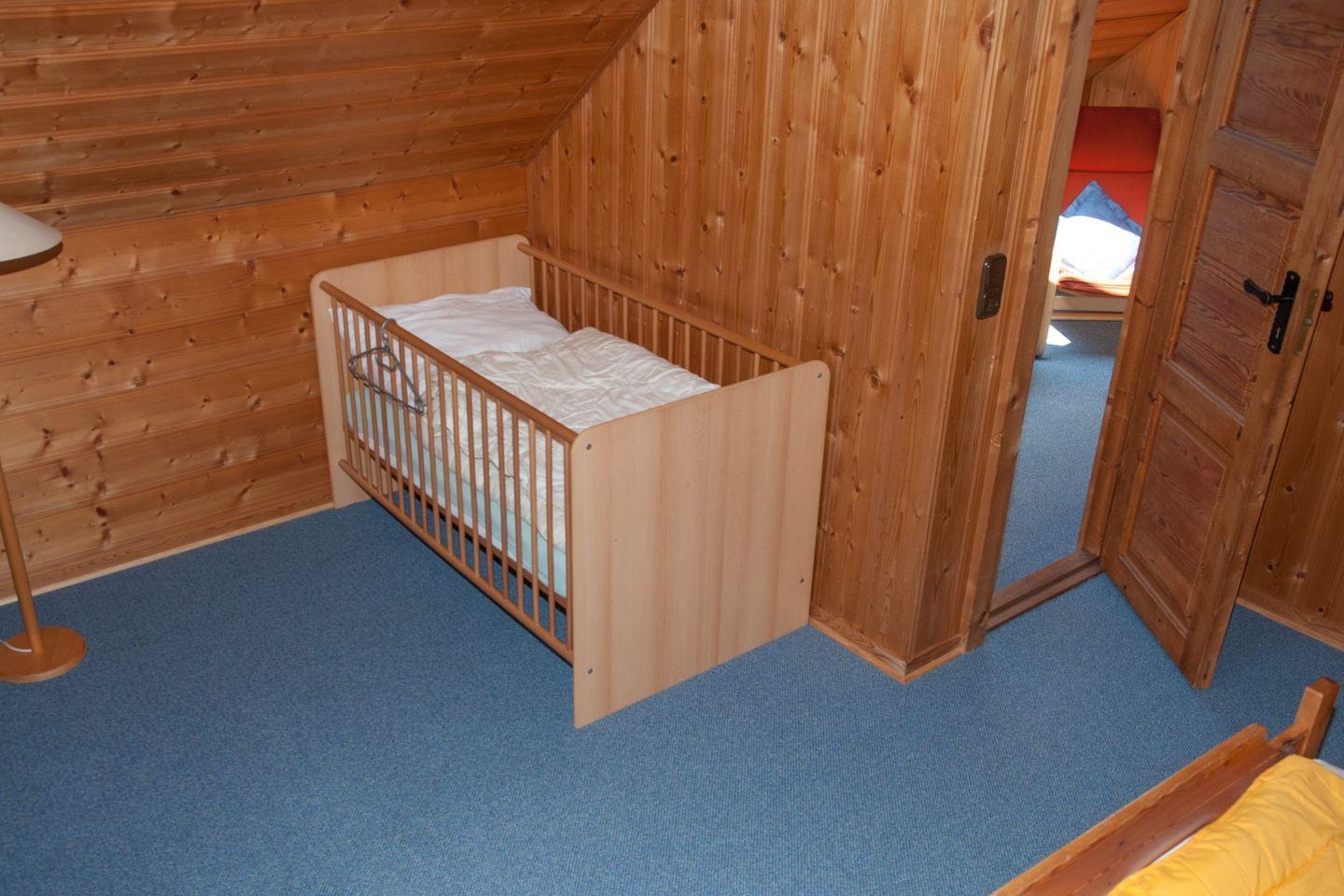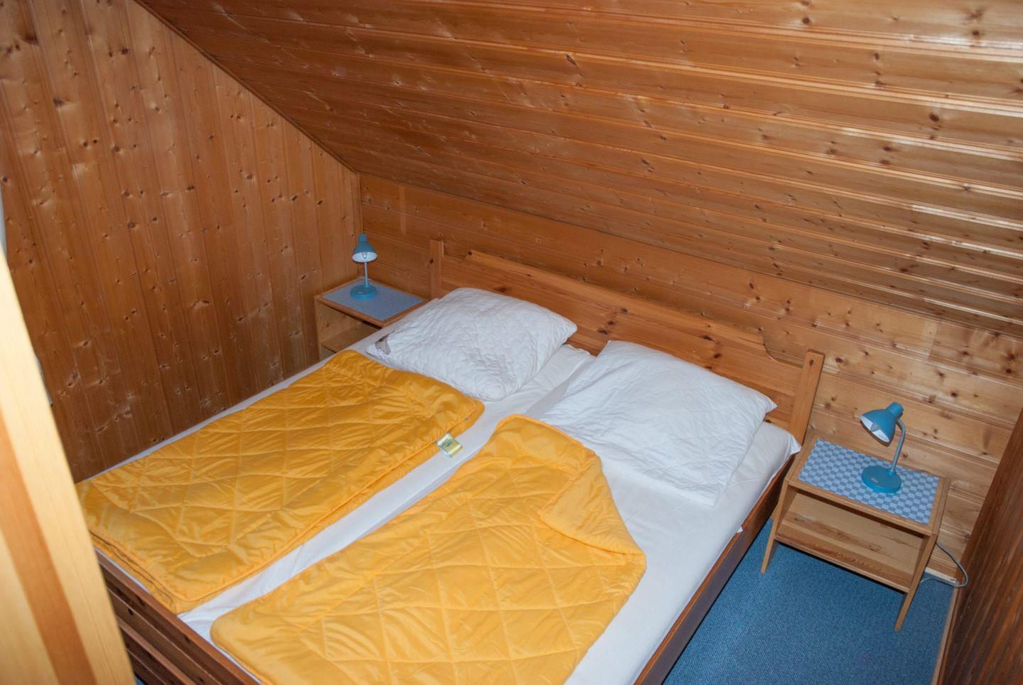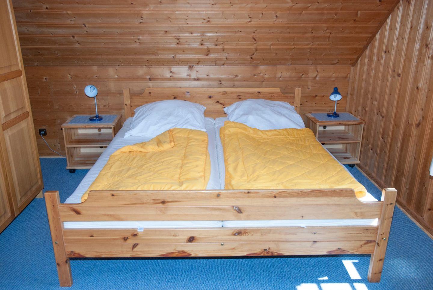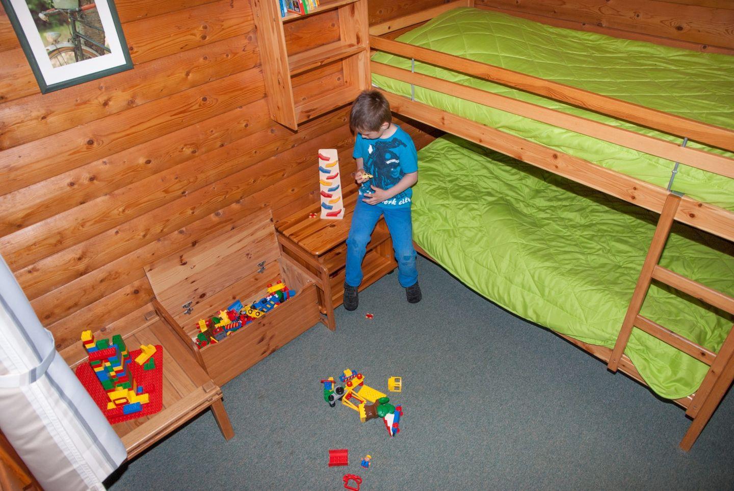 Das rustikale und geräumige Holzblockbohlenhaus bietet auf 2 Etagen Platz für bis zu 6 Personen. Im Erdgeschoss befindet sich der großzügige Wohnraum mit Couch und einer offenen Essecke mit Einbauküche. Die Küche ist ausgestattet mit Geschirrspülmaschine, Mikrowelle, Ceranfeld, Kaffeemaschine, Wasserkocher, Backofen usw. Auch befinden sich ein Schlafzimmer mit Etagenbett, sowie ein Badezimmer (saniert in 2015) mit Sauna, ebenerdiger Dusche und WC im Erdgeschoss. Über eine offene Holztreppe gelangen Sie in das Obergeschoss, wo sich zwei Doppelschlafzimmer, sowie ein zweites WC befinden. In einem der beiden Doppelschlafzimmer befindet sich ein Kinderbett und ein zweiter Fernseher.