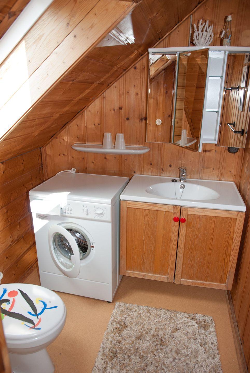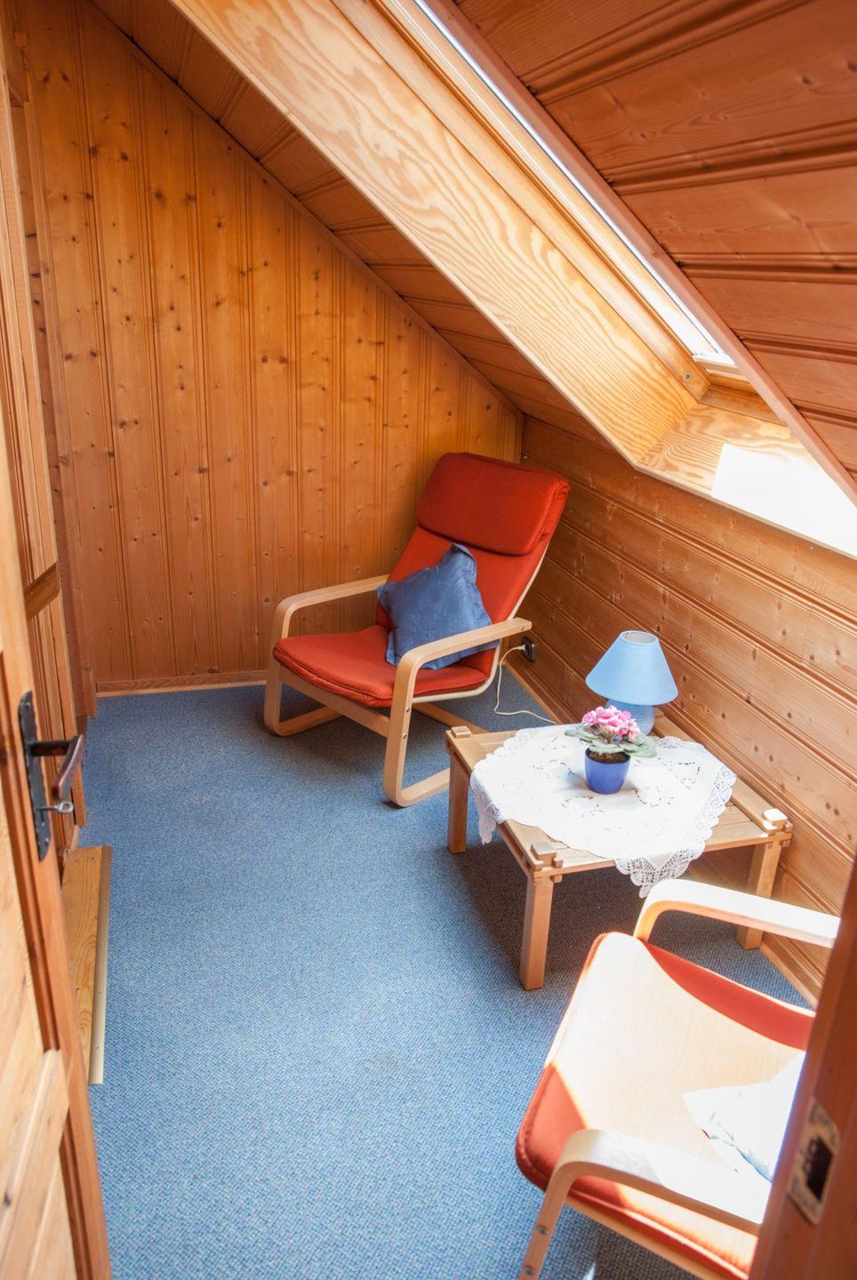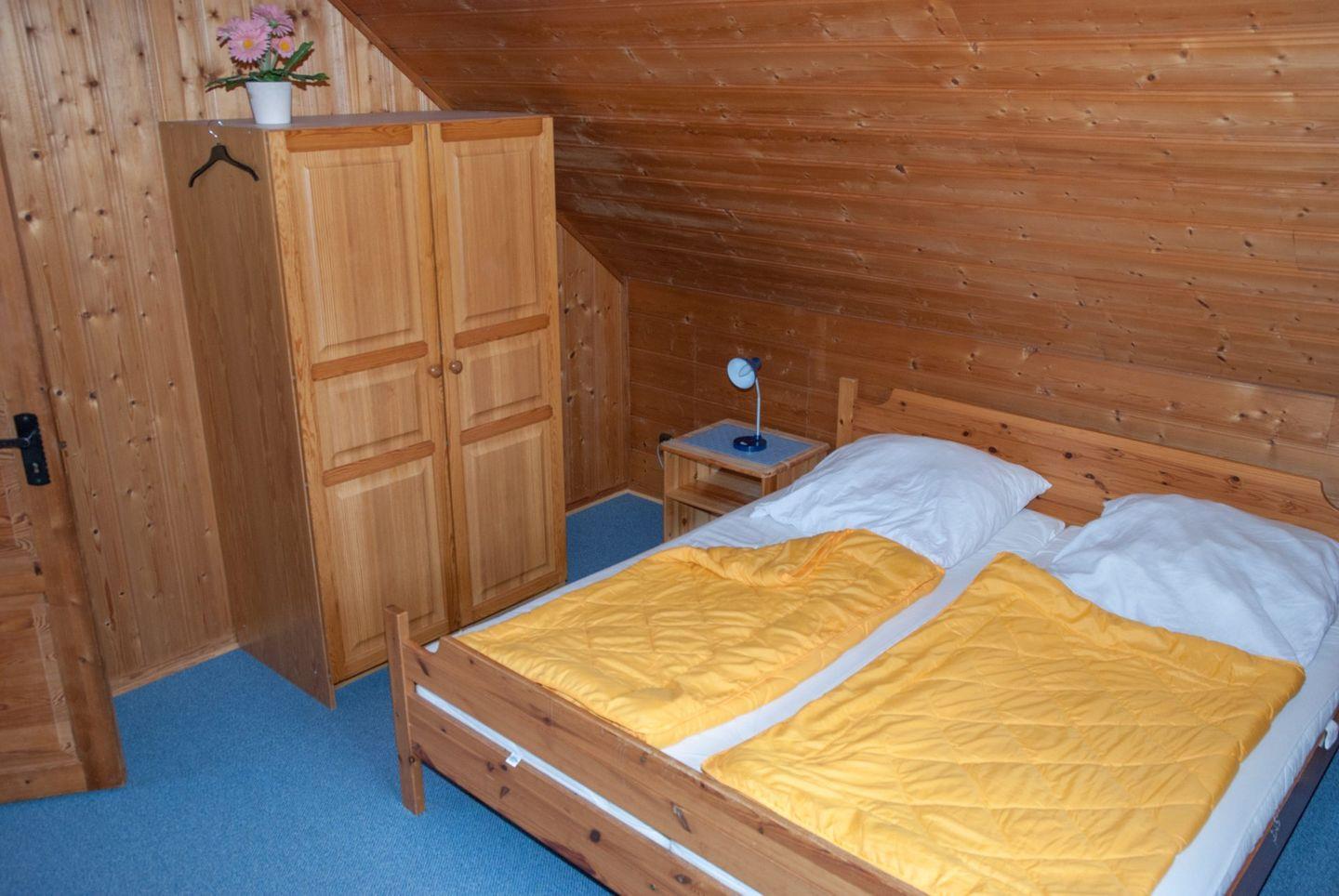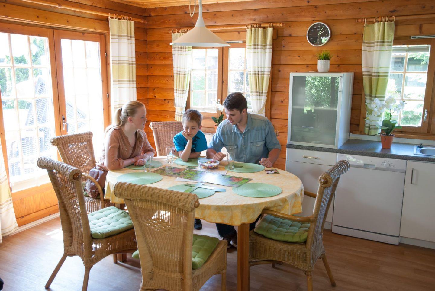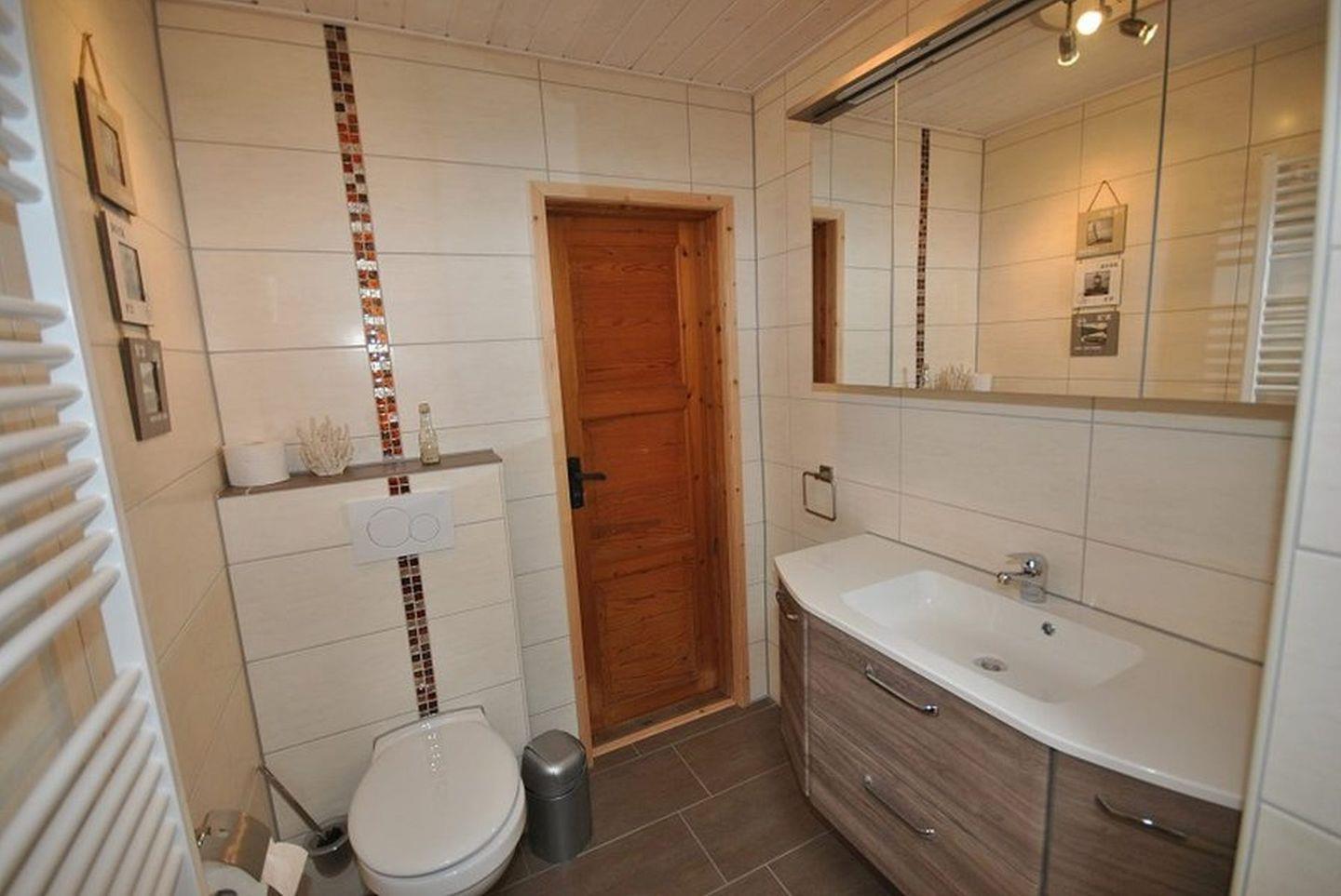 Das rustikale und geräumige Holzblockbohlenhaus bietet auf 2 Etagen Platz für bis zu 6 Personen. Im Erdgeschoss befindet sich der großzügige Wohnraum mit Couch und einer offenen Essecke mit Einbauküche. Die Küche ist ausgestattet mit Geschirrspülmaschine, Mikrowelle, Ceranfeld, Kaffeemaschine, Wasserkocher, Backofen usw. Auch befinden sich ein Schlafzimmer mit Etagenbett, sowie ein Badezimmer (saniert in 2015) mit Sauna, ebenerdiger Dusche und WC im Erdgeschoss. Über eine offene Holztreppe gelangen Sie in das Obergeschoss, wo sich zwei Doppelschlafzimmer, sowie ein zweites WC befinden. In einem der beiden Doppelschlafzimmer befindet sich ein Kinderbett und ein zweiter Fernseher.