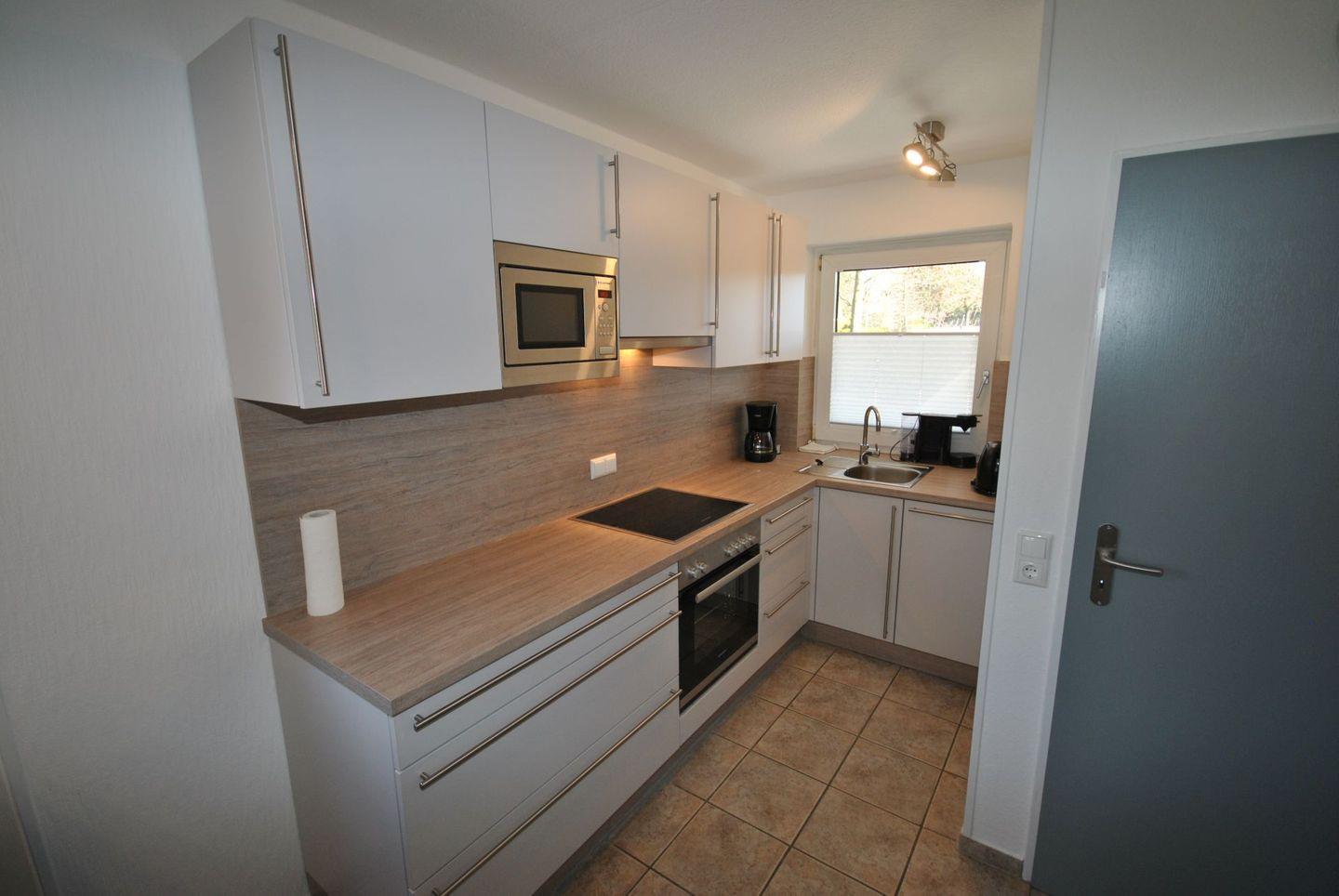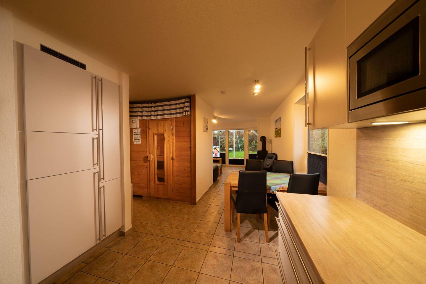 Die rauchfreie Feriendoppelhaushälfte verfügt über einen offenen Wohnbereich mit Essecke und Küche. Hier finden Sie jeglichen Komfort z. B. Farb-TV mit Sat-Anlage, Radiorecorder mit CD-Player, dänischer Kaminofen, Mikrowelle, Backofen, Geschirrspülmaschine, Kaffeemaschine, Toaster und Wasserkocher. In dem einen Schlafzimmer befinden sich ein Ehebett mit elektrisch verstellbaren Lattenrosten sowie der zweiter Fernseher, in dem zweiten Schlafraum stehen ein Etagenbett und ein einzeln stehendes Bett. Außerdem ist ein Kinderreisebett auf Wunsch zustellbar. Neben dem barrierefreien Duschbad mit Wellnessdusche befindet sich die Sauna. Alle Fußböden im Ferienhaus sind wischbar. Für Grillabende steht Ihnen ein gemauerter Grillkamin und eine ca. 25 m² überdachte Terrasse zur Verfügung.
