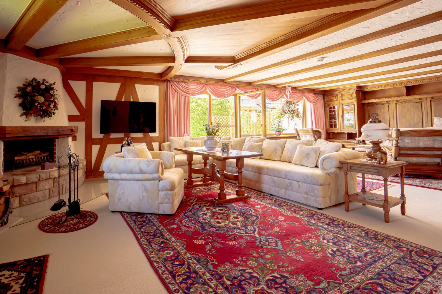 Wohnzimmer mit Panoramafenster, großer Rundcouch, TV, HiFi-Anlage Sitzgruppe, offener Kamin nur zur DEKO (nicht nutzbar)