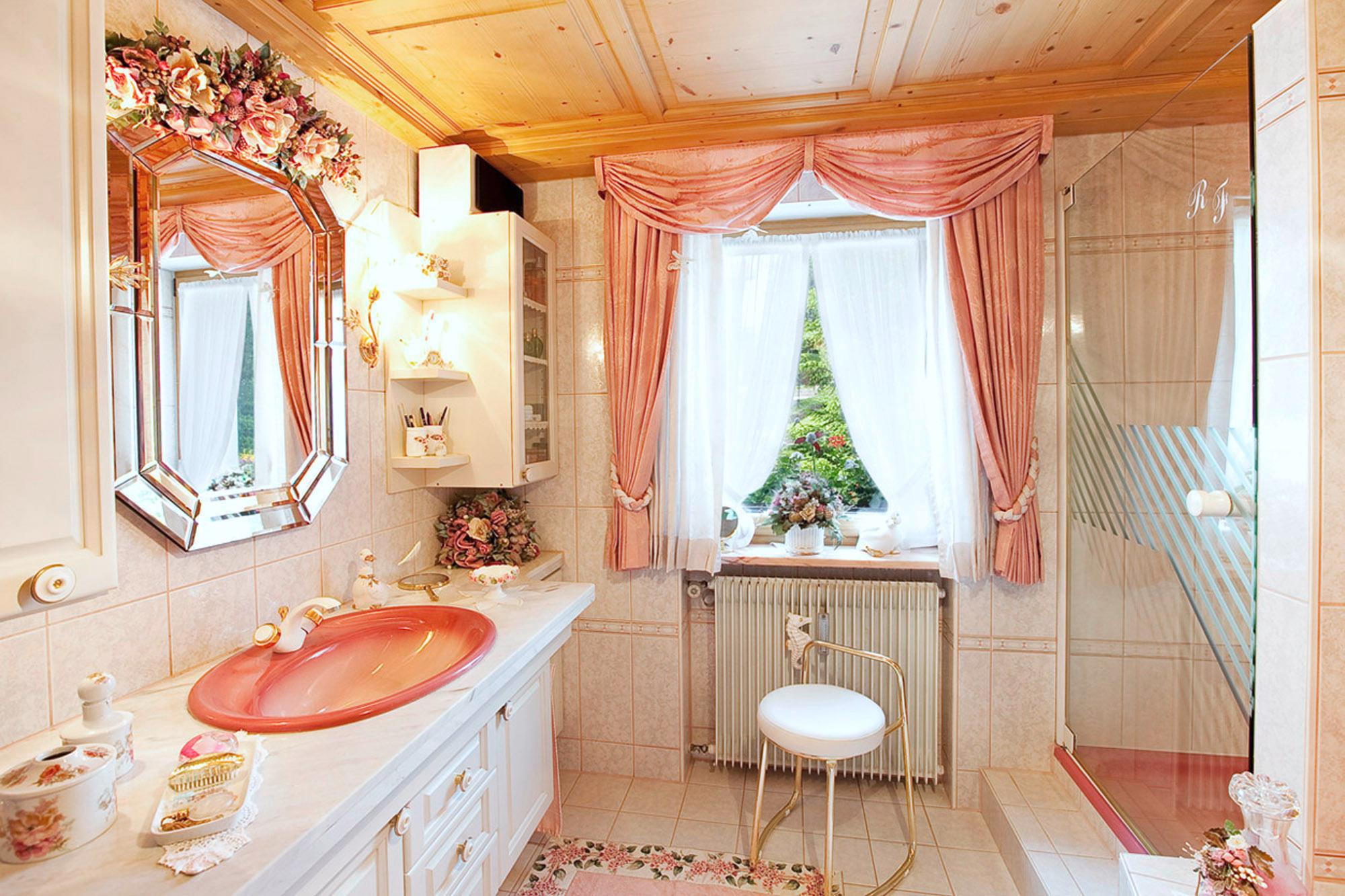 Bad mit Dusche, Badewanne, Waschbecken mit Unterschrank, Kosmetikspiegel, Fön und Kleiderständer