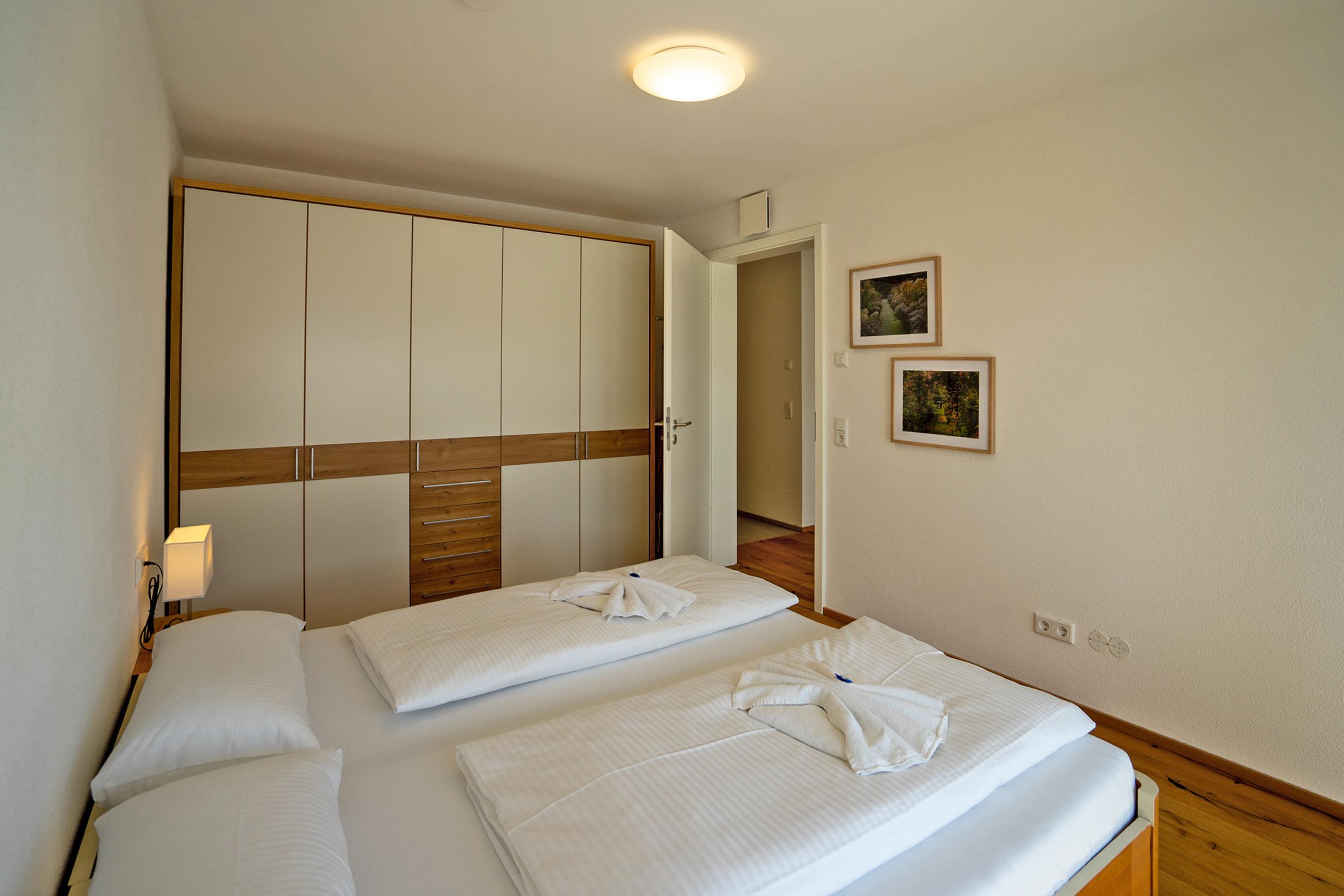 Schlafzimmer mit Doppelbett (180x190), Nachttischelemente und großzügigem Kleiderschrank