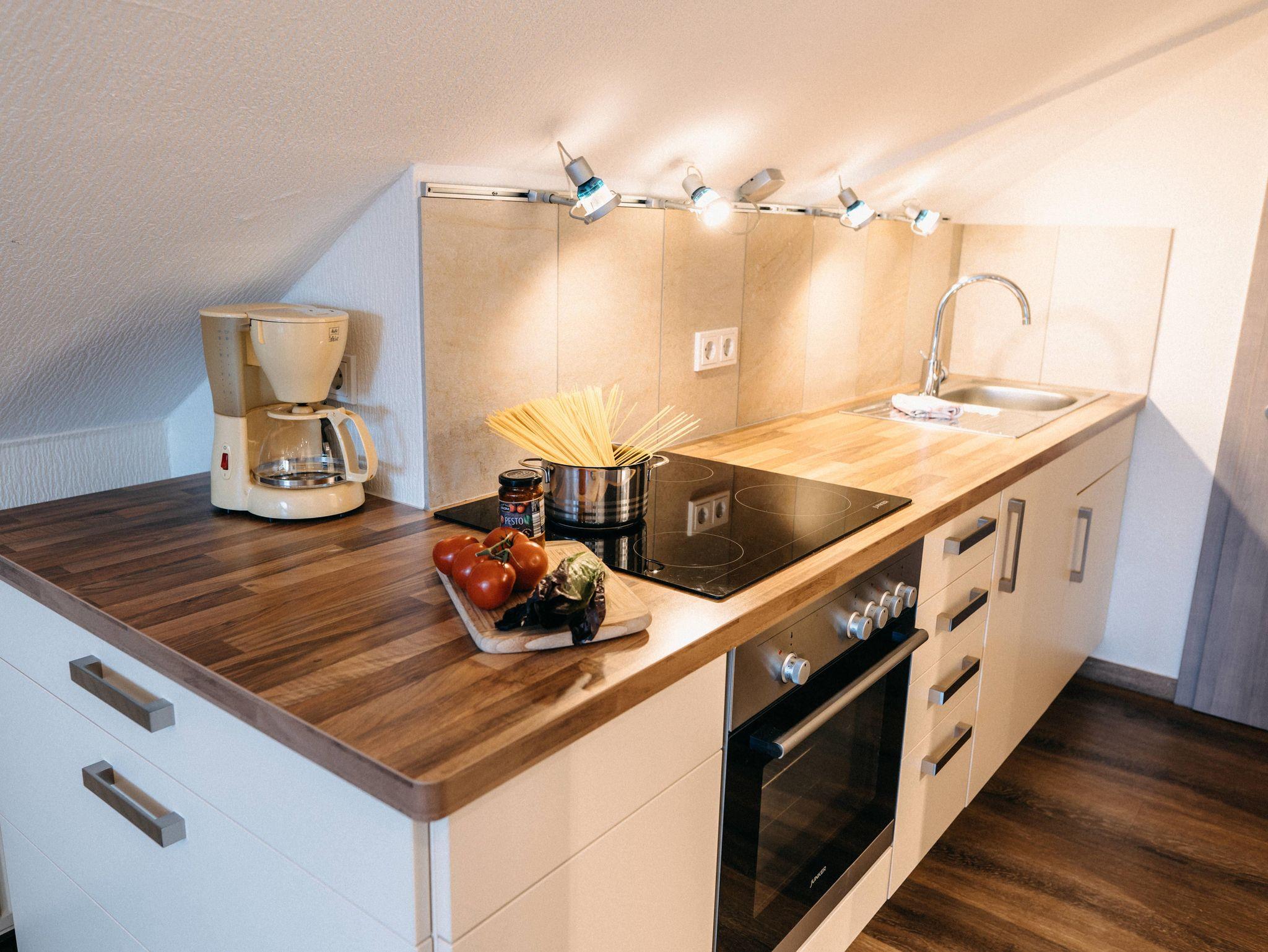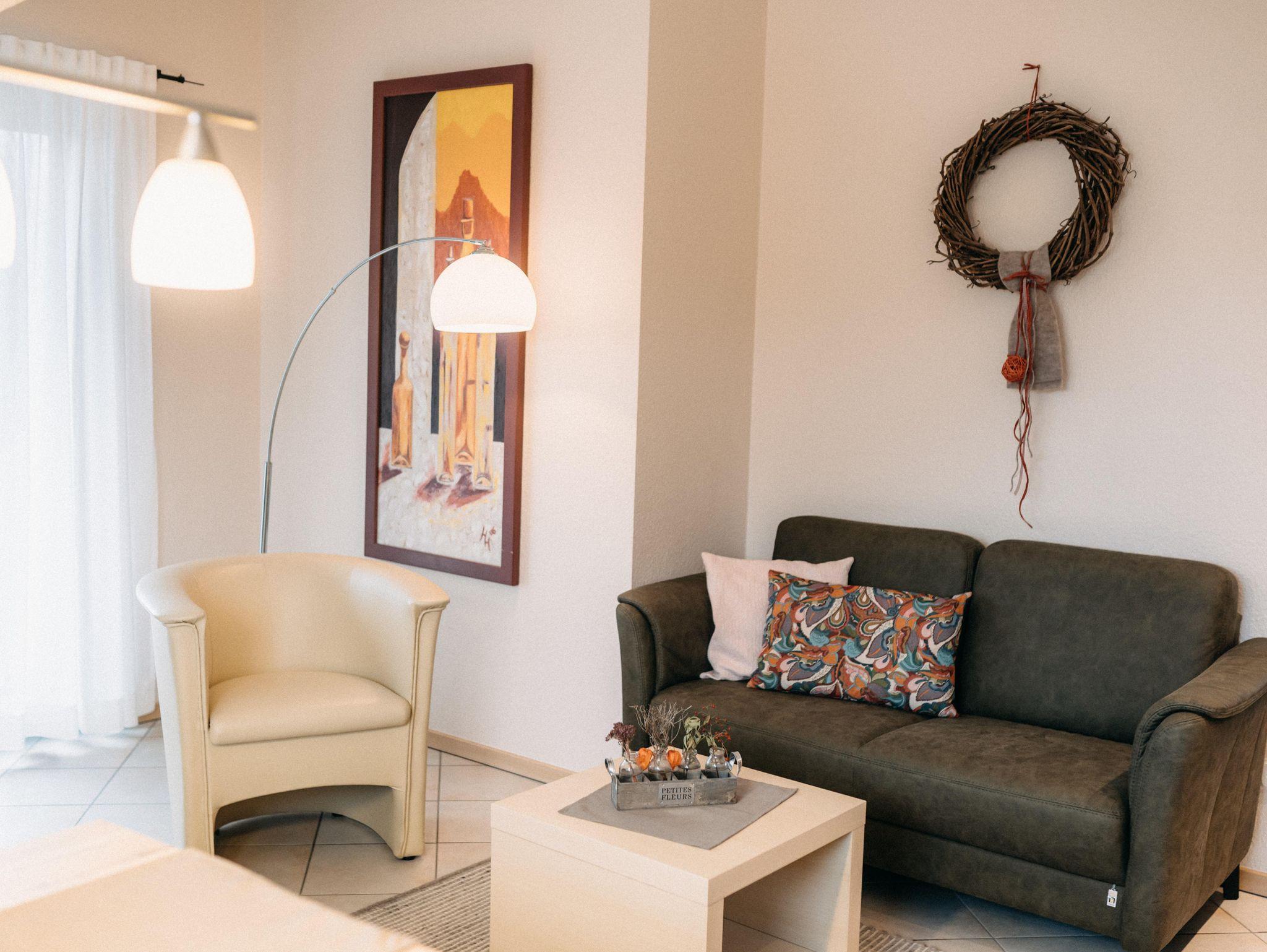 Ferienwohnung Abendsonne 1 Schlafzimmer, Wohn- Essbereich, Küche offen zum Wohnzimmer, DU/WC, eigener Balkon, auf dem Sie die Abendsonne genießen können