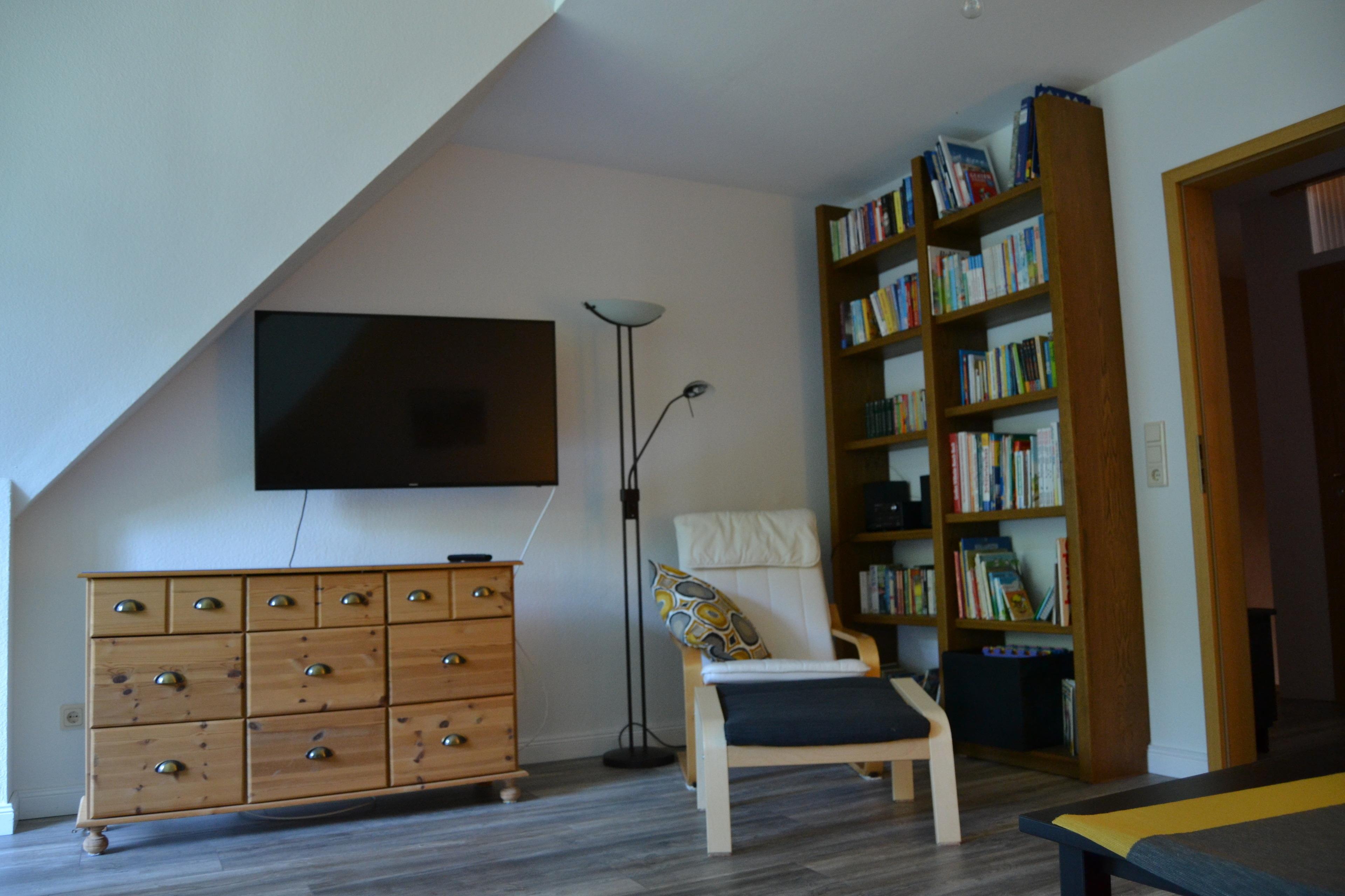 Flachbildfernseher, einem Tisch für gesellige Abende sowie einer Leseecke mit einer großzügigen Auswahl an Romanen, Kinderbüchern, Krimis, Gesellschaftsspielen, etc.. Weiterhin steht Ihnen in unserem hellen Badezimmer neben der Dusche, Badewanne und WC eine Waschmaschine zur Verfügung. Die Küche bietet Platz für ein gemütliches Frühstück oder gemeinsame Koch Abende.