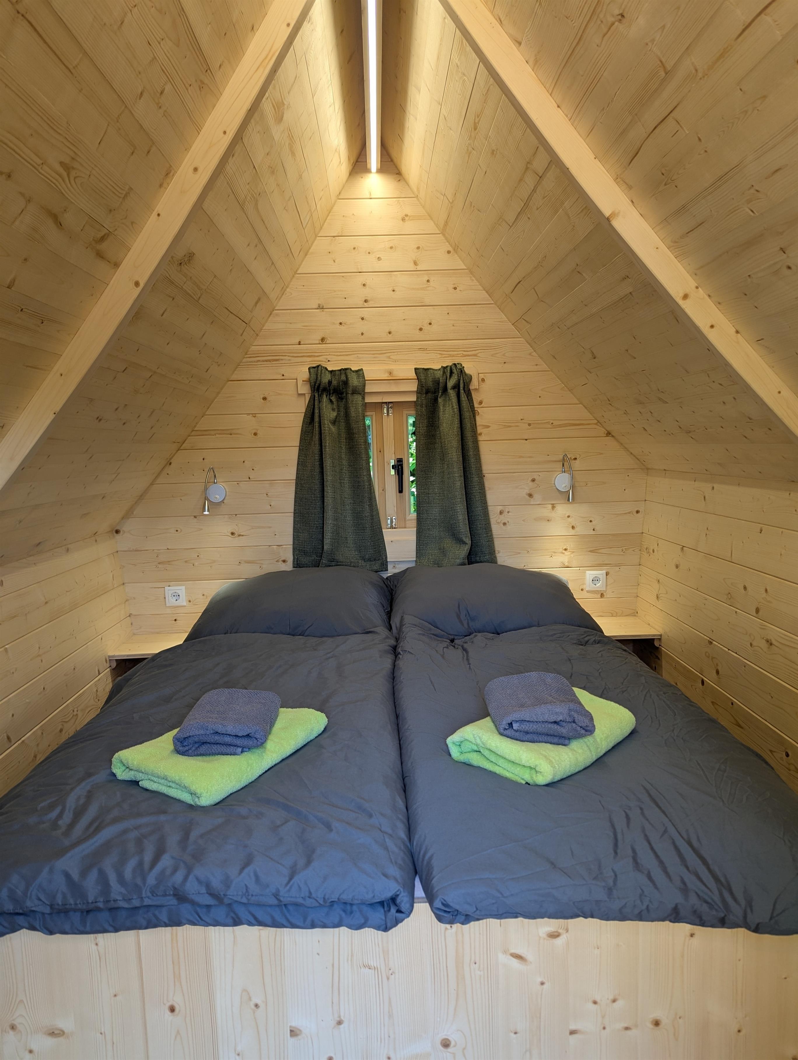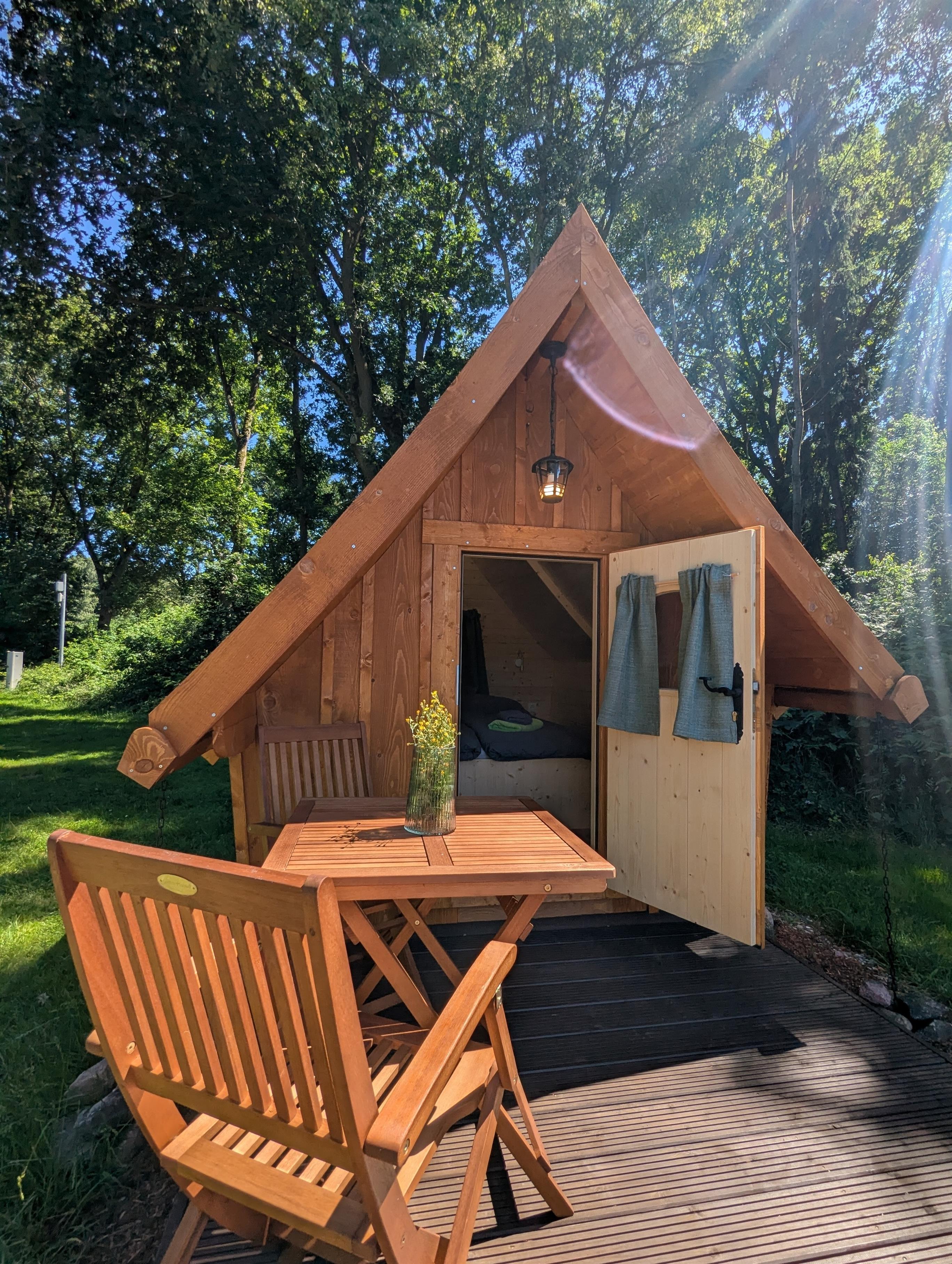 Auf 8 qm finden sie eine einfache aber komfortable Ausstattung mit Doppelbett und Schrank. Die Sanitäranlagen des Campingplatzes sind ca. 100 m entfernt und können kostenfrei mit genutzt werden.