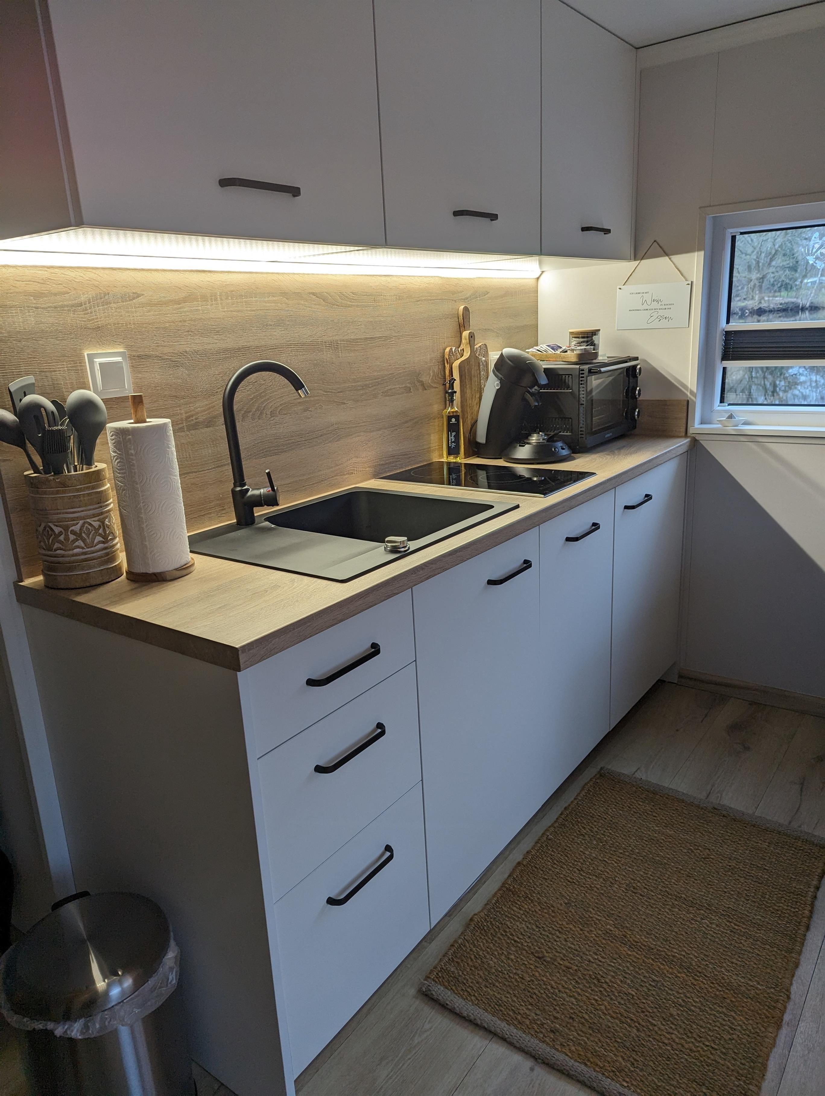 eine vollausgestattete Küchenzeile mit einem kleinen Backofen und einer
