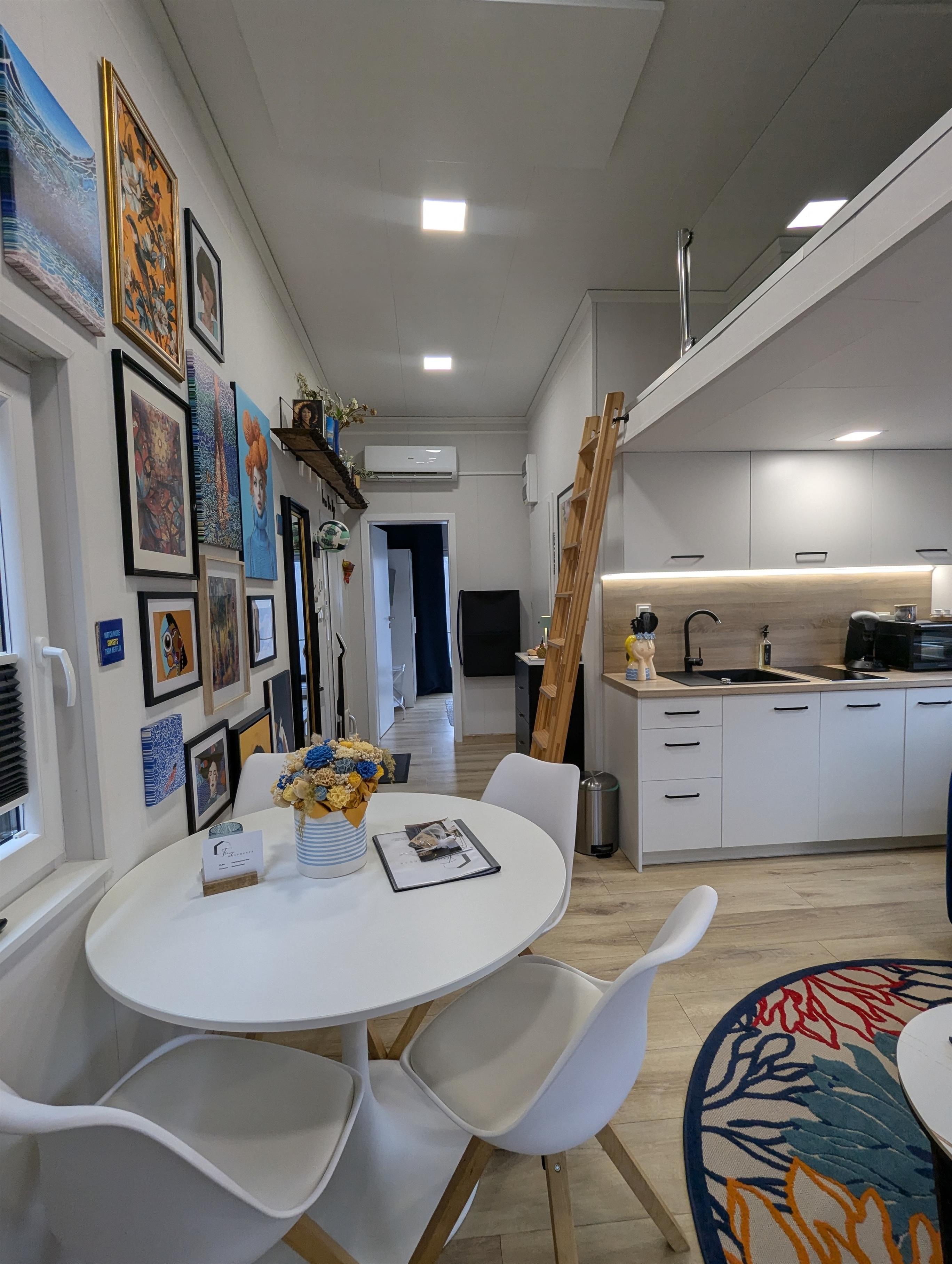 Über dem Wohnbereich geht es mit einer Leiter hoch zum Schlafloft. Dort finden weitere 2 Personen ein gemütliches Plätzchen (160cm Matratze). Alle Tinyhouses sind mit einer Klimaanlage und Infrarotheizung ausgestattet.