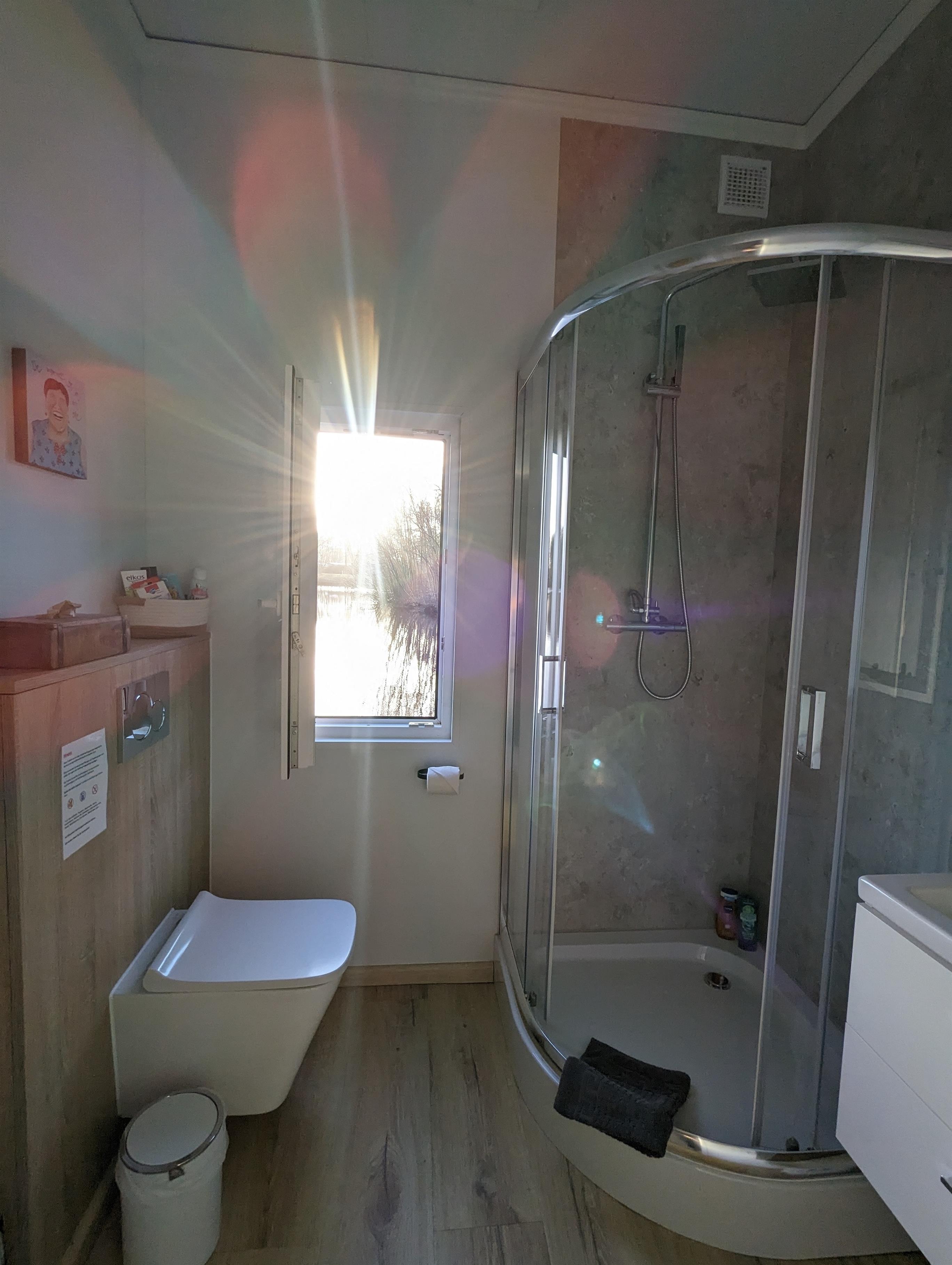 Ausgestattet mit einem Fernseher und einem Doppelbett (160cm). Ein WC mit Dusche ist ebenfalls vorhanden und mit Shampoo und Handtüchern ausgestattet.