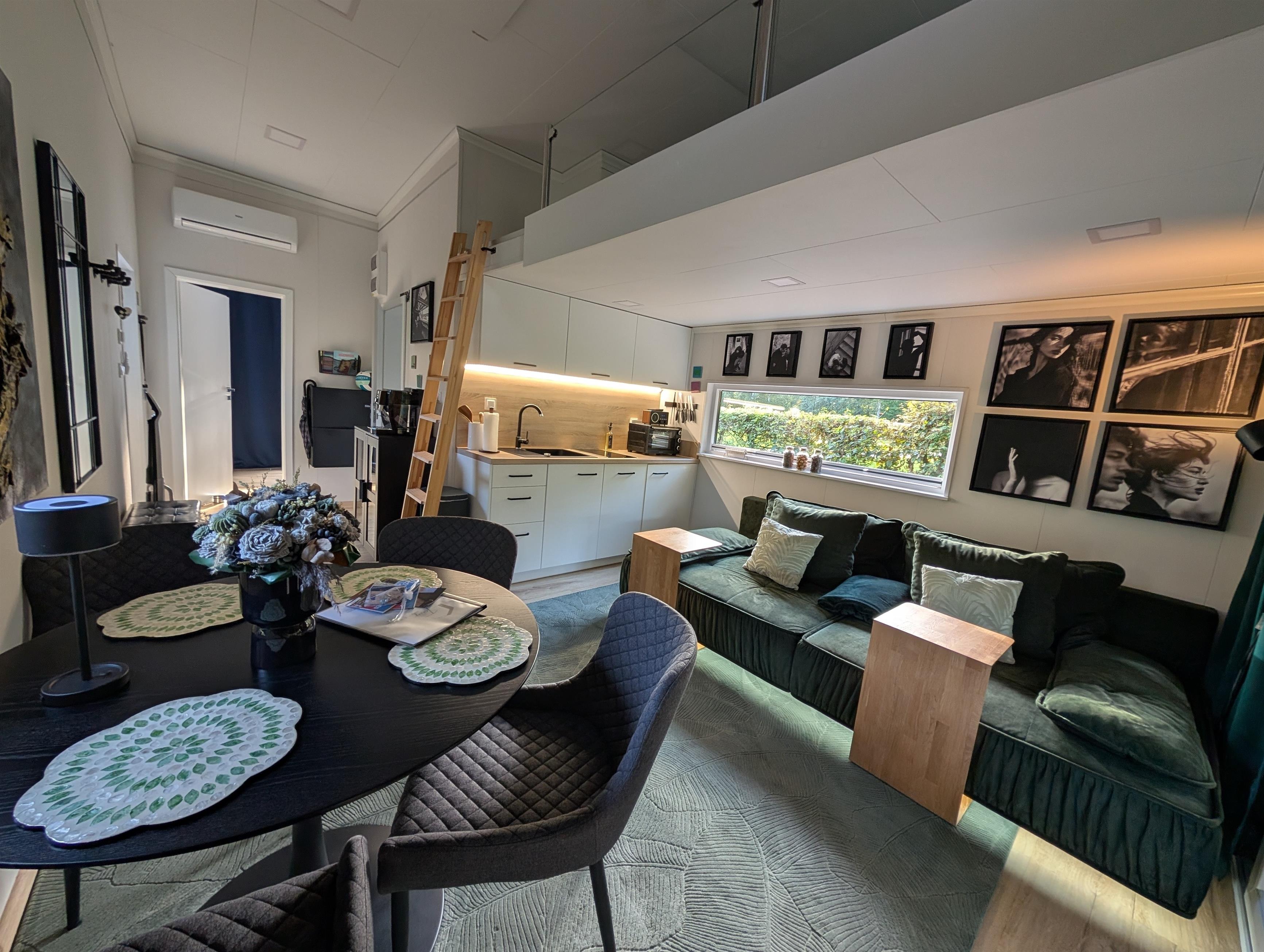 Über dem Wohnbereich geht es mit einer Leiter hoch zum Schlafloft. Dort finden weitere 2 Personen ein gemütliches Plätzchen mit dem Blick zum See(160cm Matratze). Alle Tinyhouses sind mit einer Klimaanlage und Infrarotheizung ausgestattet.