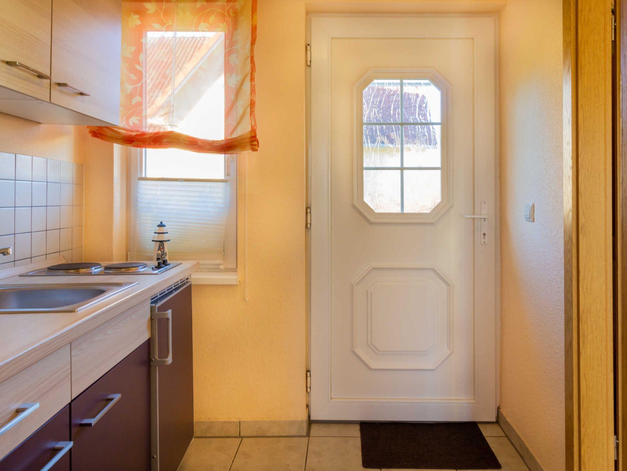 Die kleine Ferienwohnung (25 m²) ist modern und gemütlich ausgestattet. Eine Küchenzeile mit Kochgelegenheit befindet sich im Flurbereich; von hier aus gelangt man in den Wohn-/Schlafraum oder zu DU/WC. Die zur Fewo gehörende Terrasse mit Blick über die Wiesen lädt zum Verweilen ein.