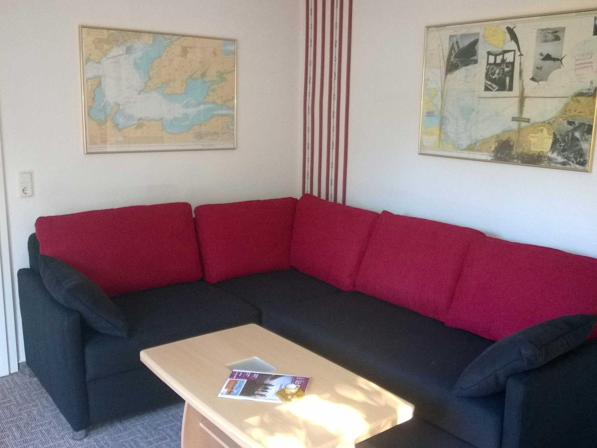Wohnzimmer mit Flachbild-TV, DVD-/CD-Player, Radio, Tisch, Sessel, 2 Stühl, Schlaf-Eck-Couch in Boxspringqualität (1,40 x 1,80 m);