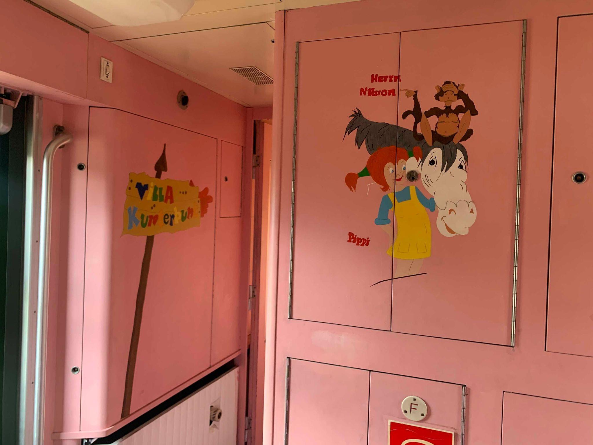 Der Schlafwagon ist ein Kunstwerk, bemalt mit den Fantasien von Pippi Langstrumpf und nordischen Märchensagen.