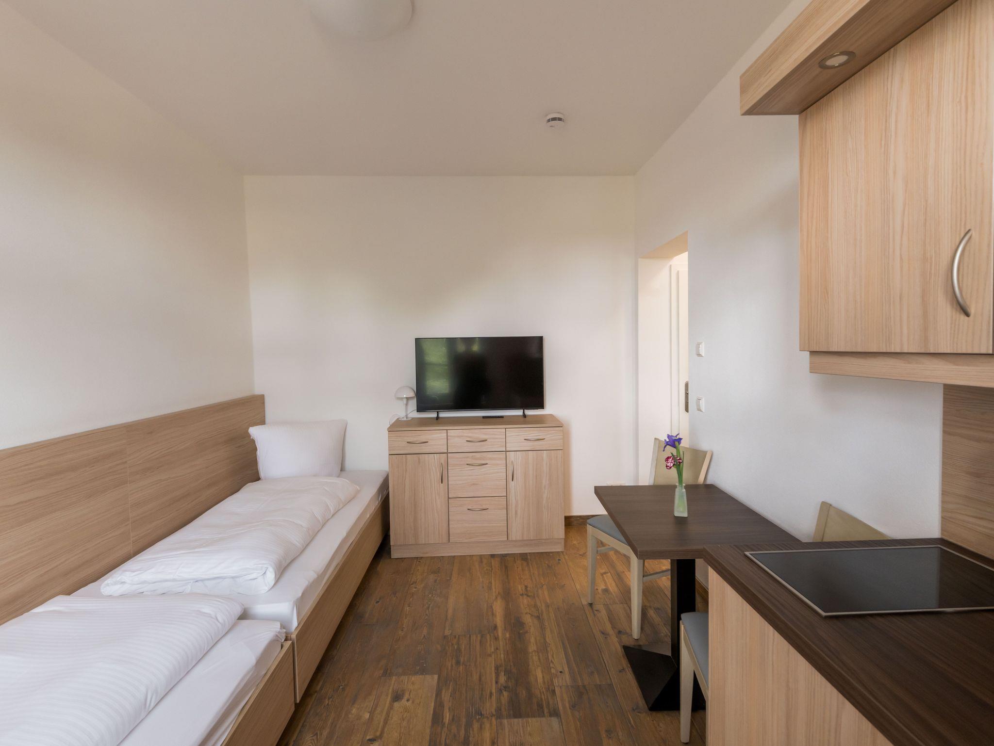Mit zwei Einzelbetten bzw.Doppelbett getrennt stellbar und einer Pantry-Küche sowie einem Badezimmer mit bodenebener Dusche ist das großzügige Studio ausgestattet.