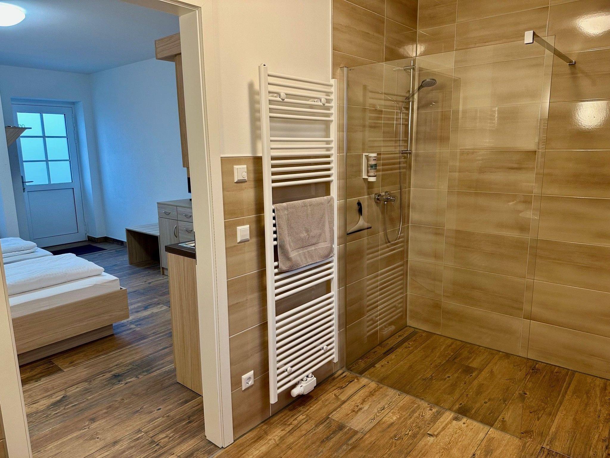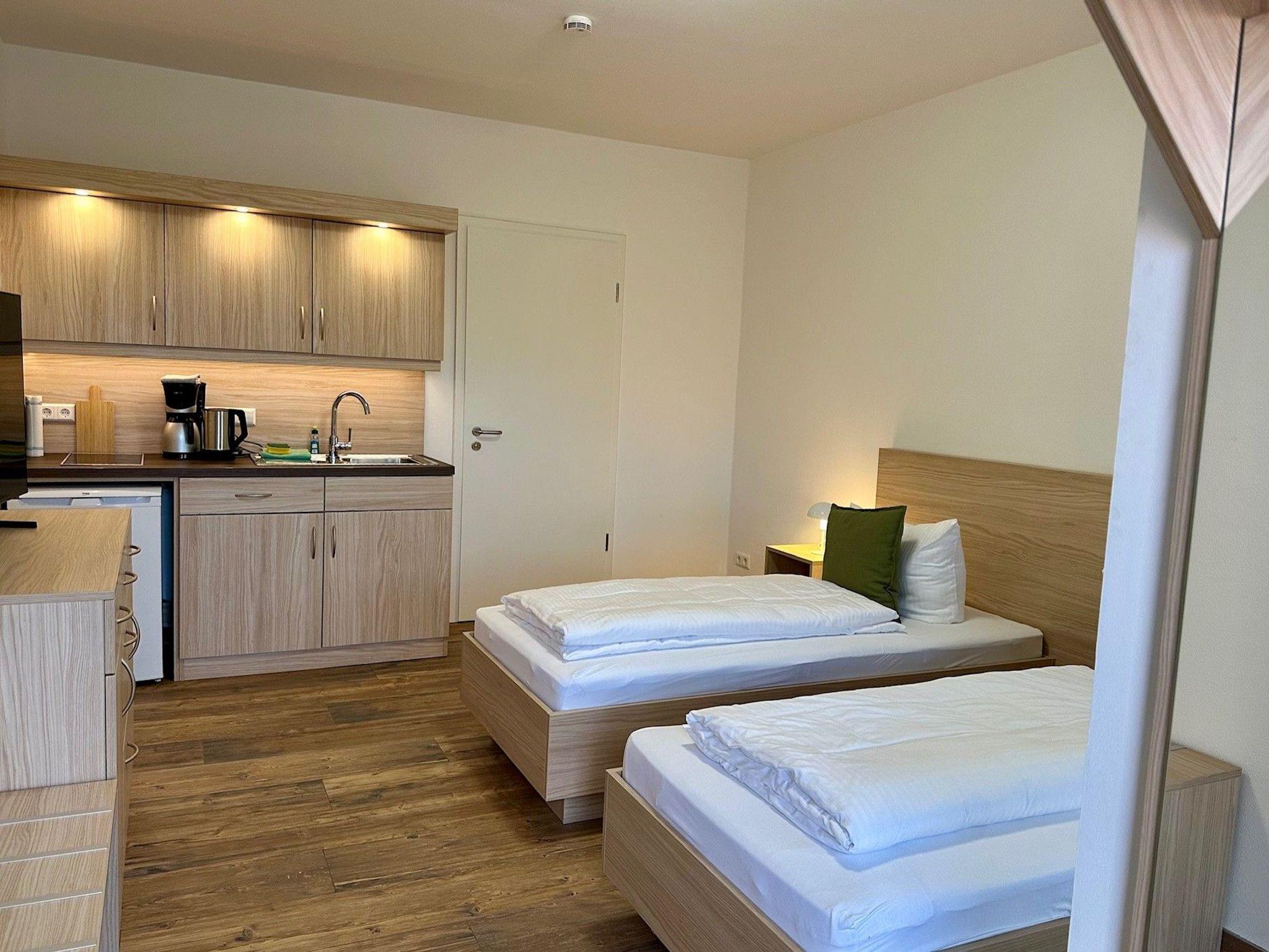 Mit zwei Einzelbetten bzw.Doppelbett getrennt stellbar und einer Pantry-Küche sowie einem Badezimmer mit bodenebener Dusche ist das großzügige Studio ausgestattet.