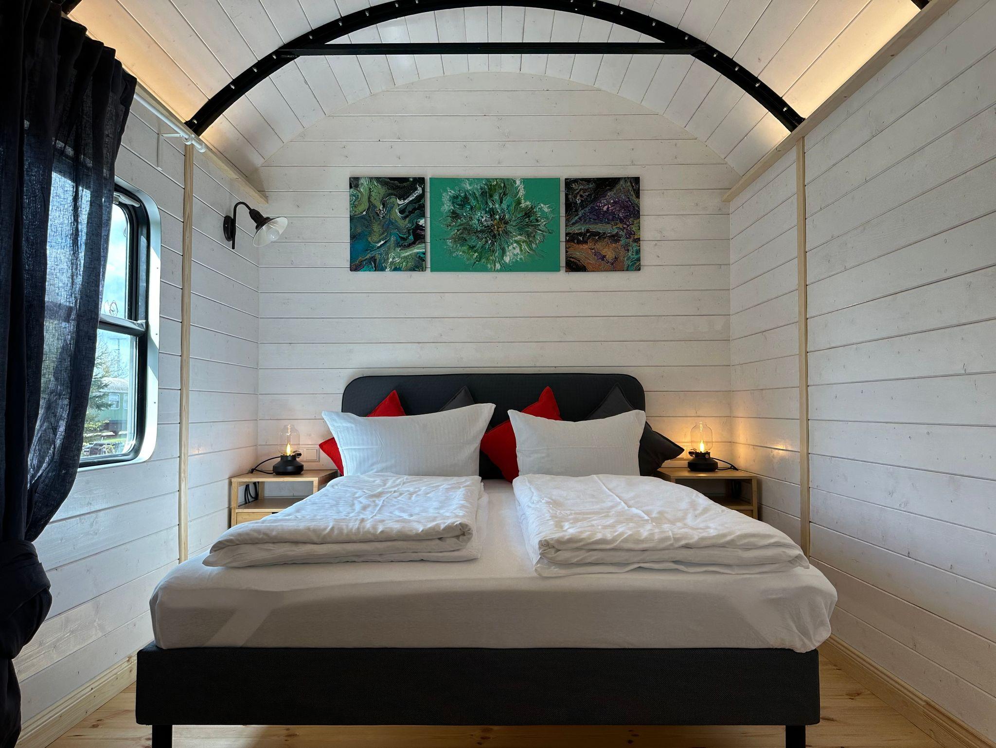 Eisenbahnwagon mit jeweils zwei Abteilen, jedes Abteil ist mit einem Doppelbett oder Einzelbetten, Garderobe und einer Sitzgelegenheit sowie einem Schrank ausgestattet. Diese Wagen stehen separat auf dem Gelände und haben kein WC. Im Servicehaus befinden sich die gemeinschaftlichen Sanitäreinrichtungen Dusche und WC sowie eine Camperküche zur Sebstversorgung.