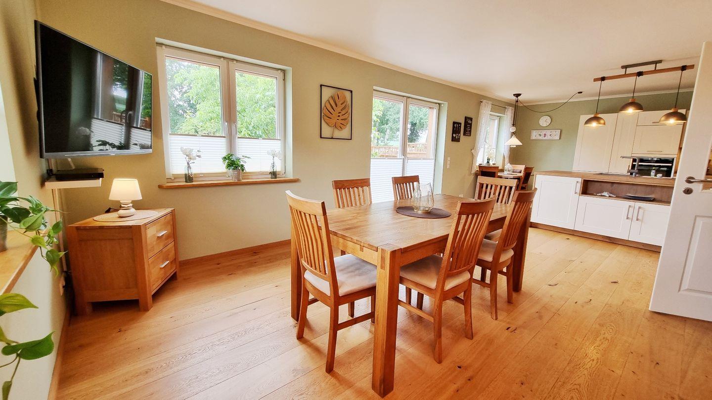 Bis zu 6 Personen finden hier Platz für Ihren erholsamen Traumurlaub. Das Domizil verfügt über 3 Schlafzimmer, davon eins im Erdgeschoss, eine luxuriöse, offene Landhausküche mit großem Essbereich, sowie einen Wohnbereich mit Blick ins Grüne, ein ebenerdiges Vollbad und ein Gäste-WC. Das Erdgeschoss mit Doppelbettzimmer, Küche und Essbereich sowie dem Vollbad sind behindertengerecht gestaltet und auch mit einem Rollstuhl gut erreichbar. Zudem ist ein eigener, eingezäunter Garten nebst großer Terrasse in Südlage vorhanden, um in vollen Zügen die frische Luft zu genießen. Zwei Hunde sind herzlich willkommen.