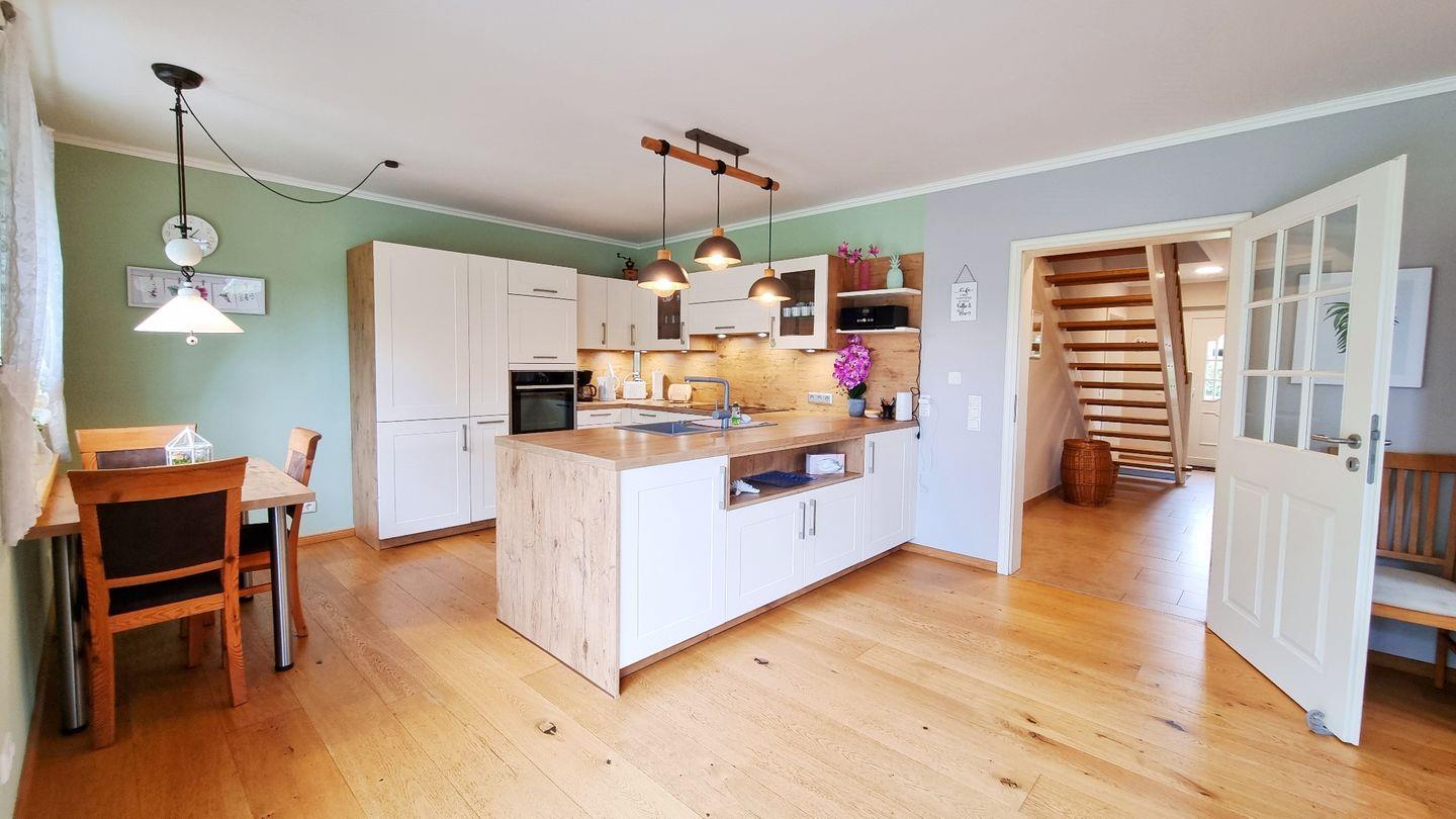 Küche: helle, großzügige Landhausküche / Dunstabzug / Backofen / Geschirrspüler / Toaster / Filterkaffeemaschine / Wasserkocher / Mixer / Kühlschrank / Gefrierschrank