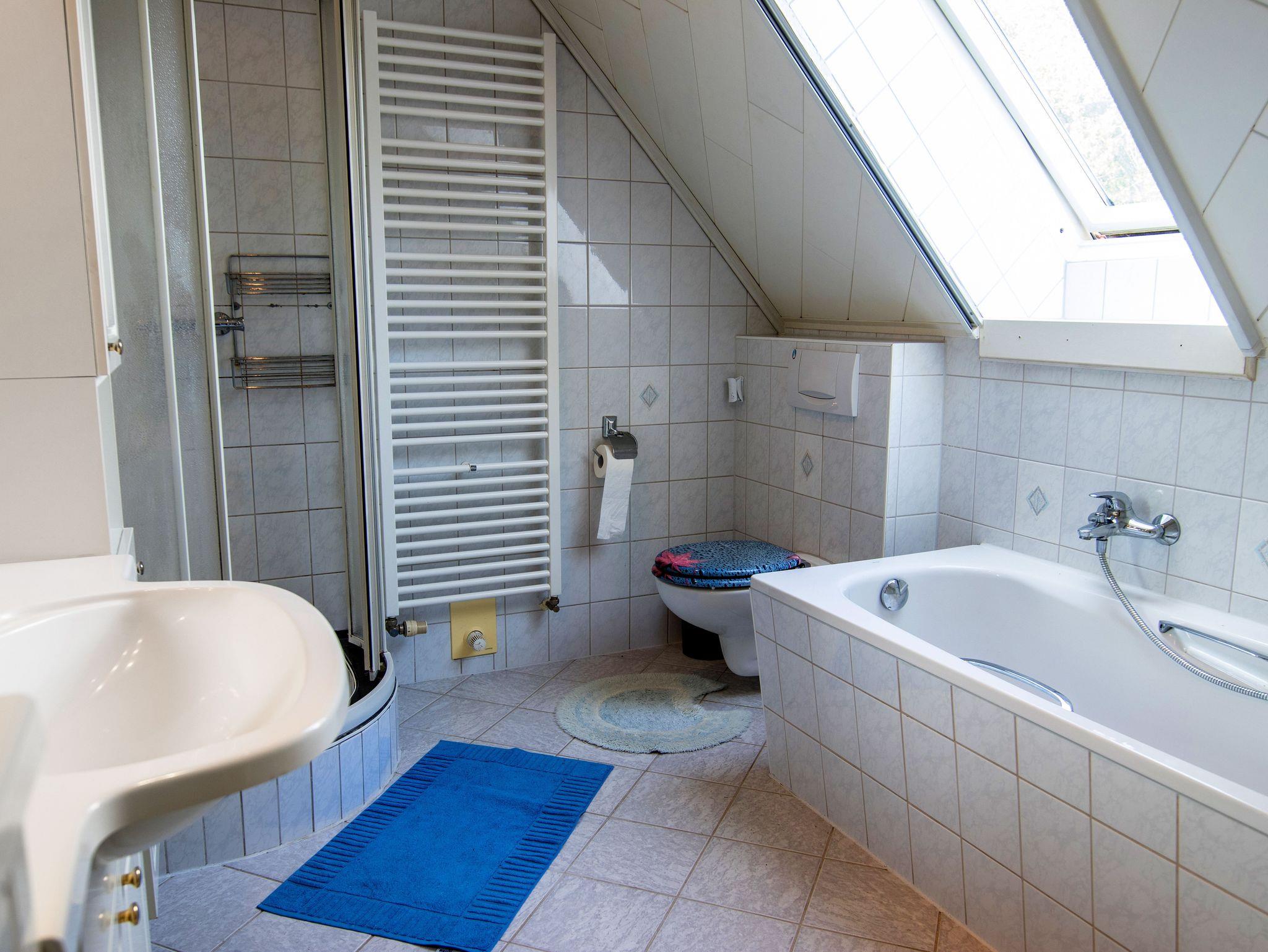 Die Dachgeschoss-Ferienwohnung befindet sich im Haupthaus und verfügt über Wohnzimmer, Doppelbett-Schlafzimmer, komplett ausgestatteter Küche und ein Bad mit Dusche und Badewanne.