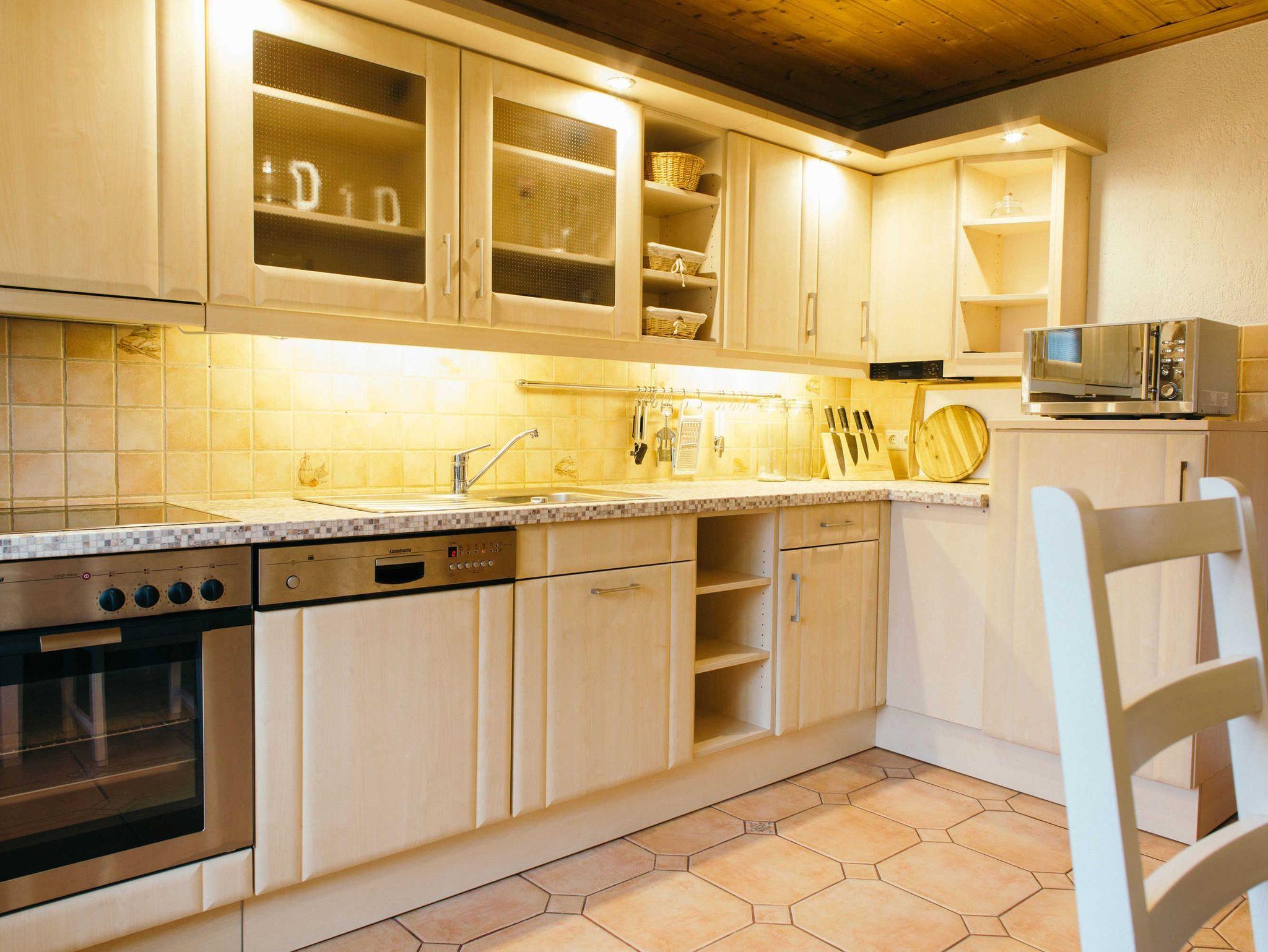 Die kleine Küche ist mit einem Herd, Wasserkocher, Kaffeemaschine, Toaster, Mikrowelle und Kühlschrank ausgestattet. Hier steht auch ein Esstisch mit Stühlen.