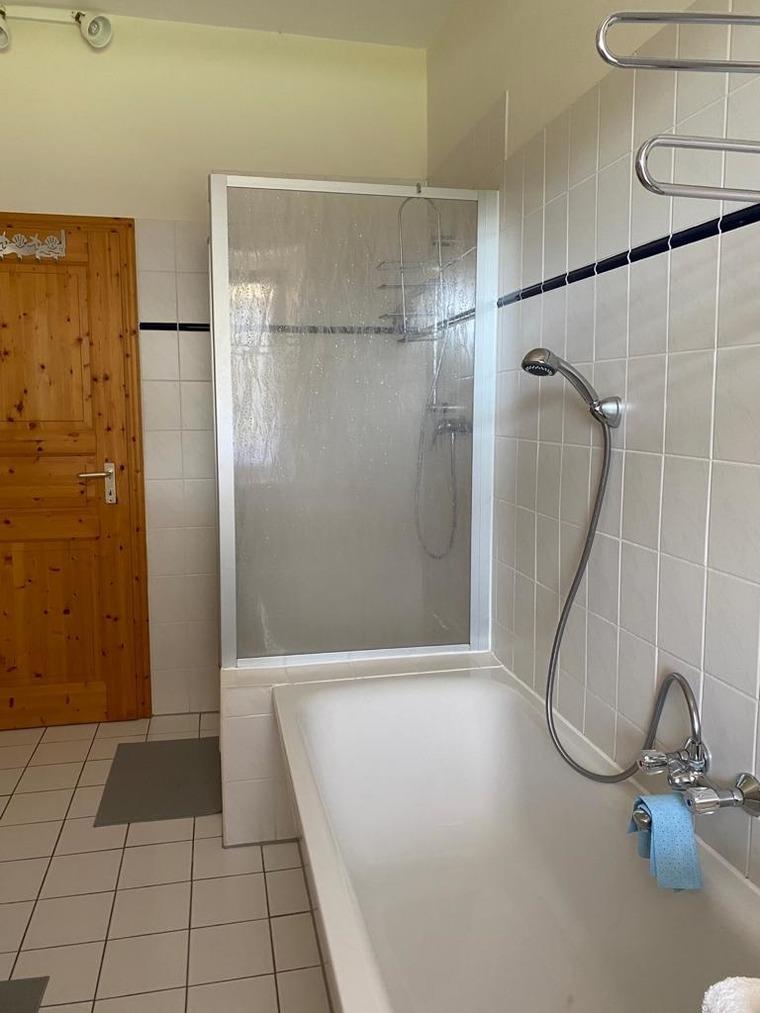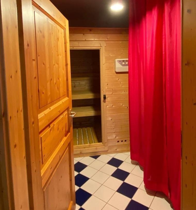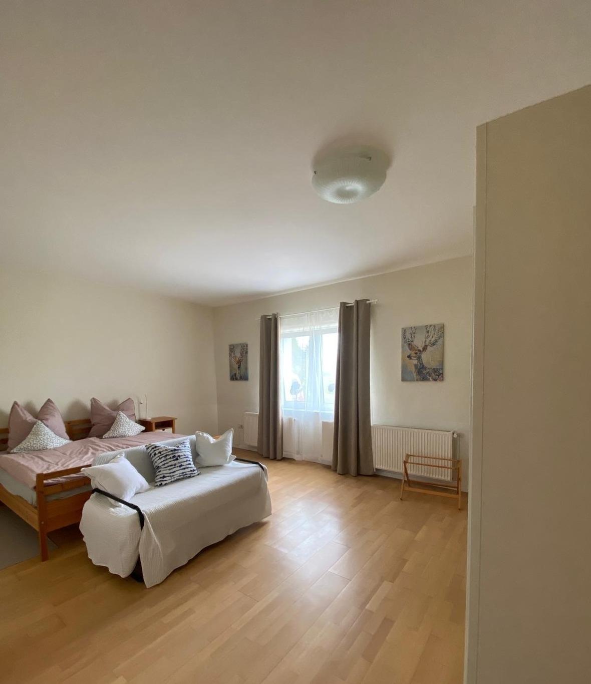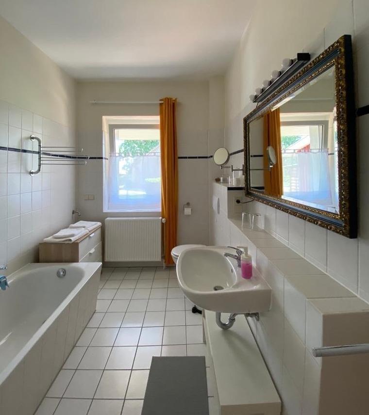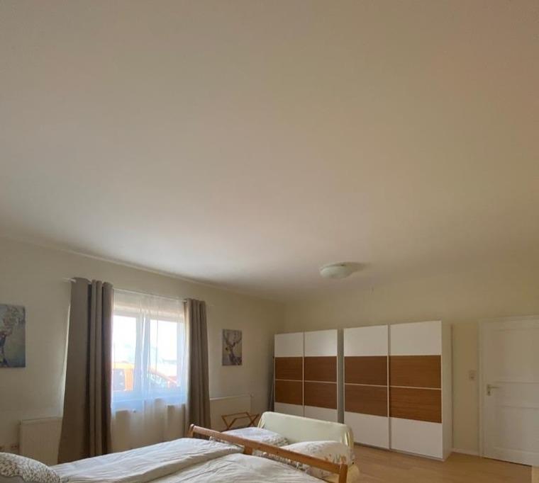 Großzügige Ferienwohnung mit eigenem Zugang, Schlafzimmer, Wohnzimmer, Küche, Bad, Sauna und Flur.
