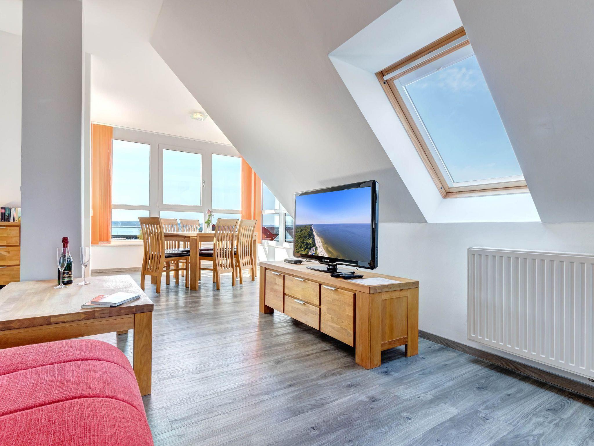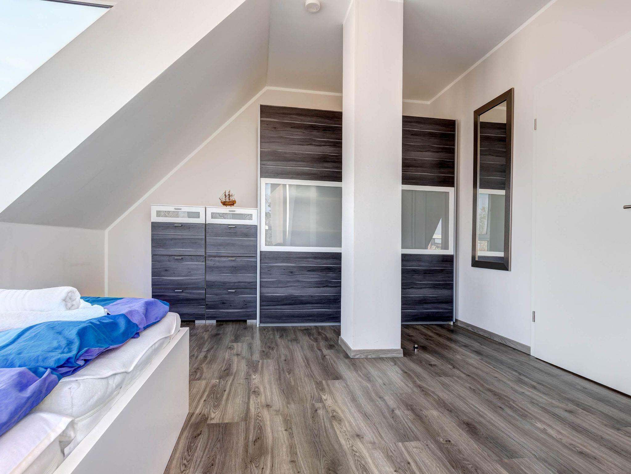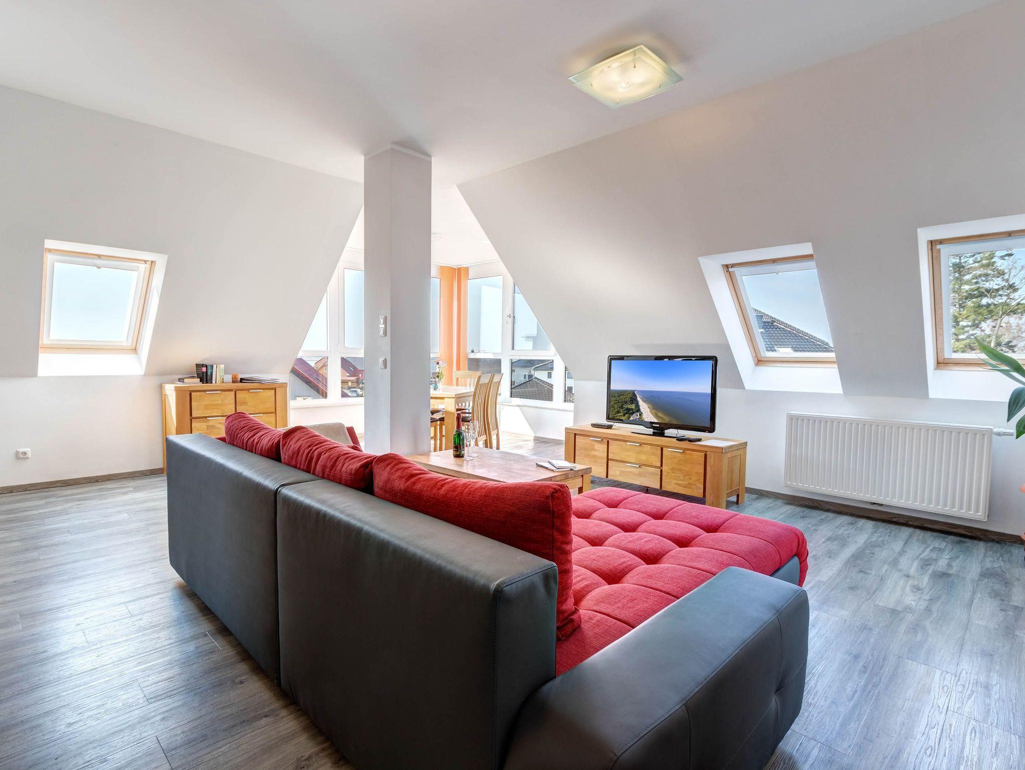 Die Maisonettewohnung erreichen Sie über den Eingangsbereich im Obergeschoss. Über eine Wendeltreppe gelangen Sie ins Dachgeschoss, wo sich der großzügige Wohnbereich mit gemütlicher Couch (ausziehbar), Flat-TV und einer einladenden Loggia mit großem Esstisch für bis zu 6 Personen befindet ? perfekt für gemeinsame Mahlzeiten oder Spieleabende mit Blick aufs Wasser.
