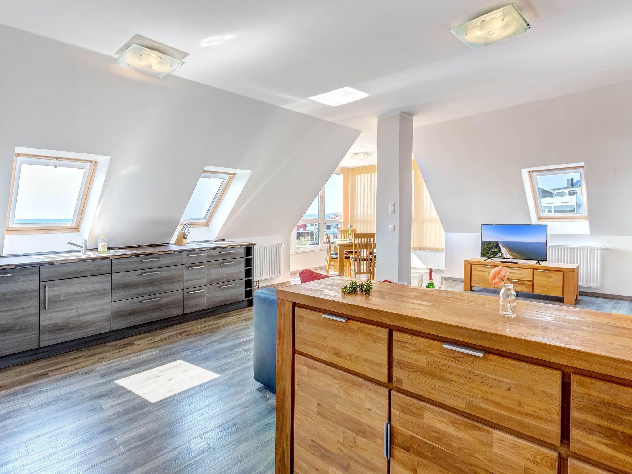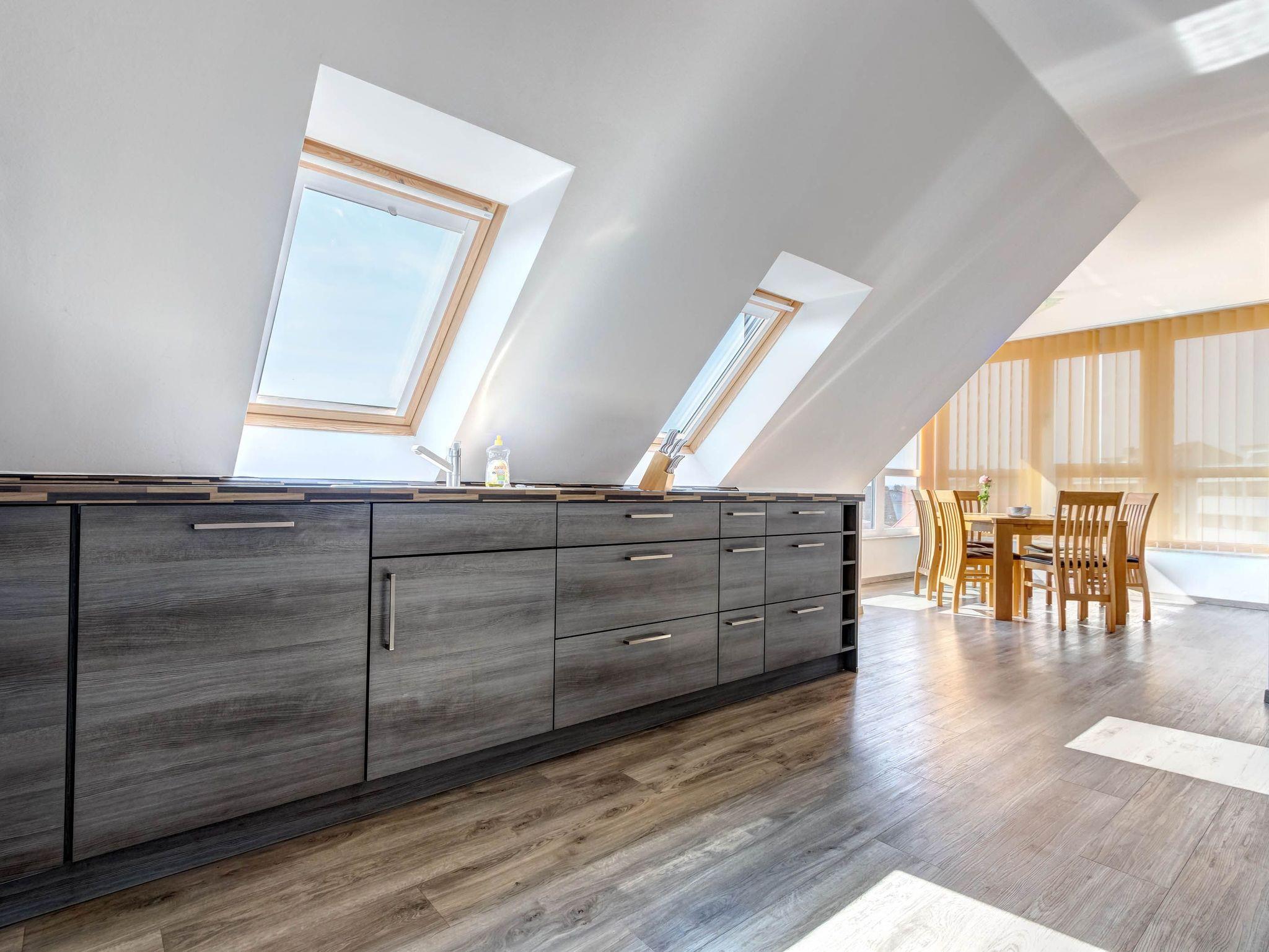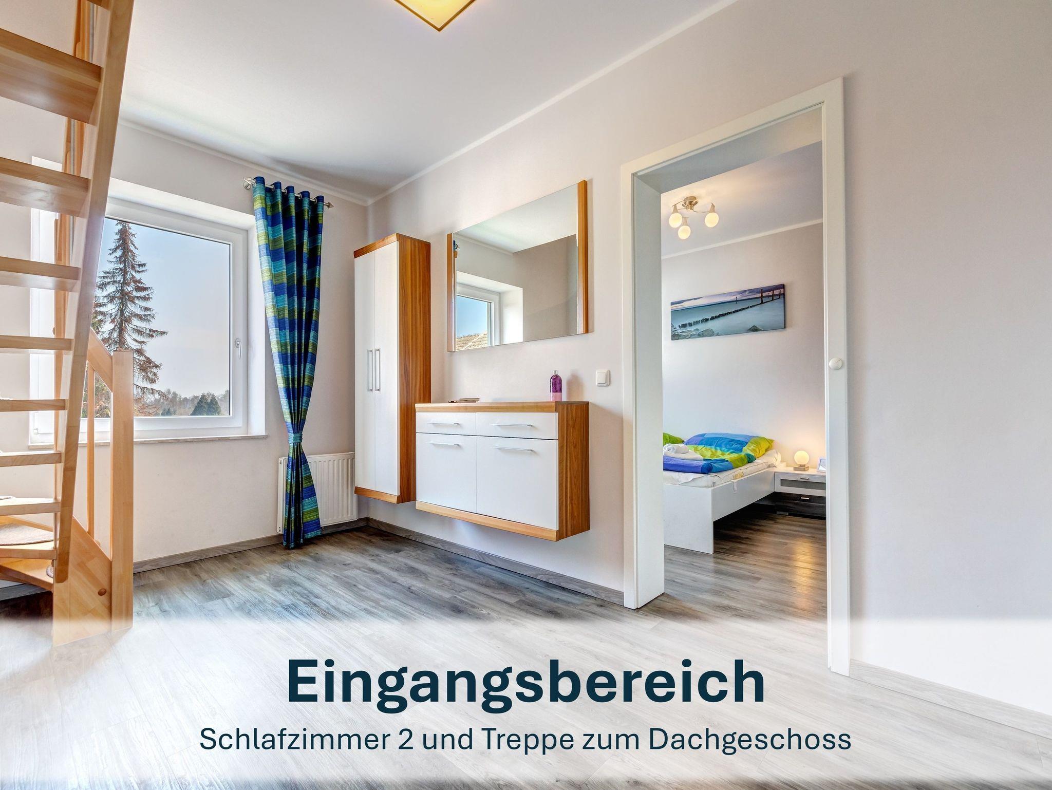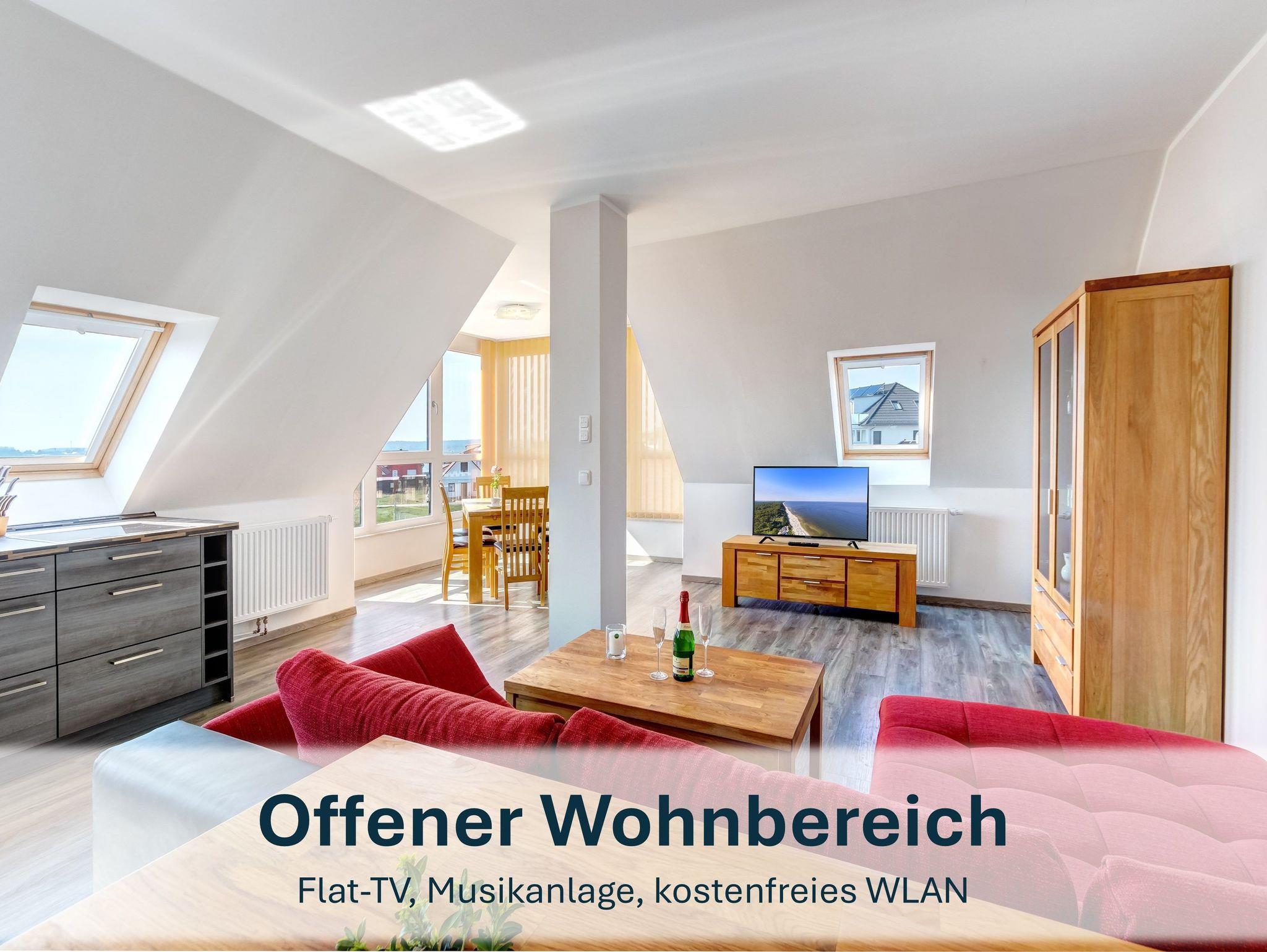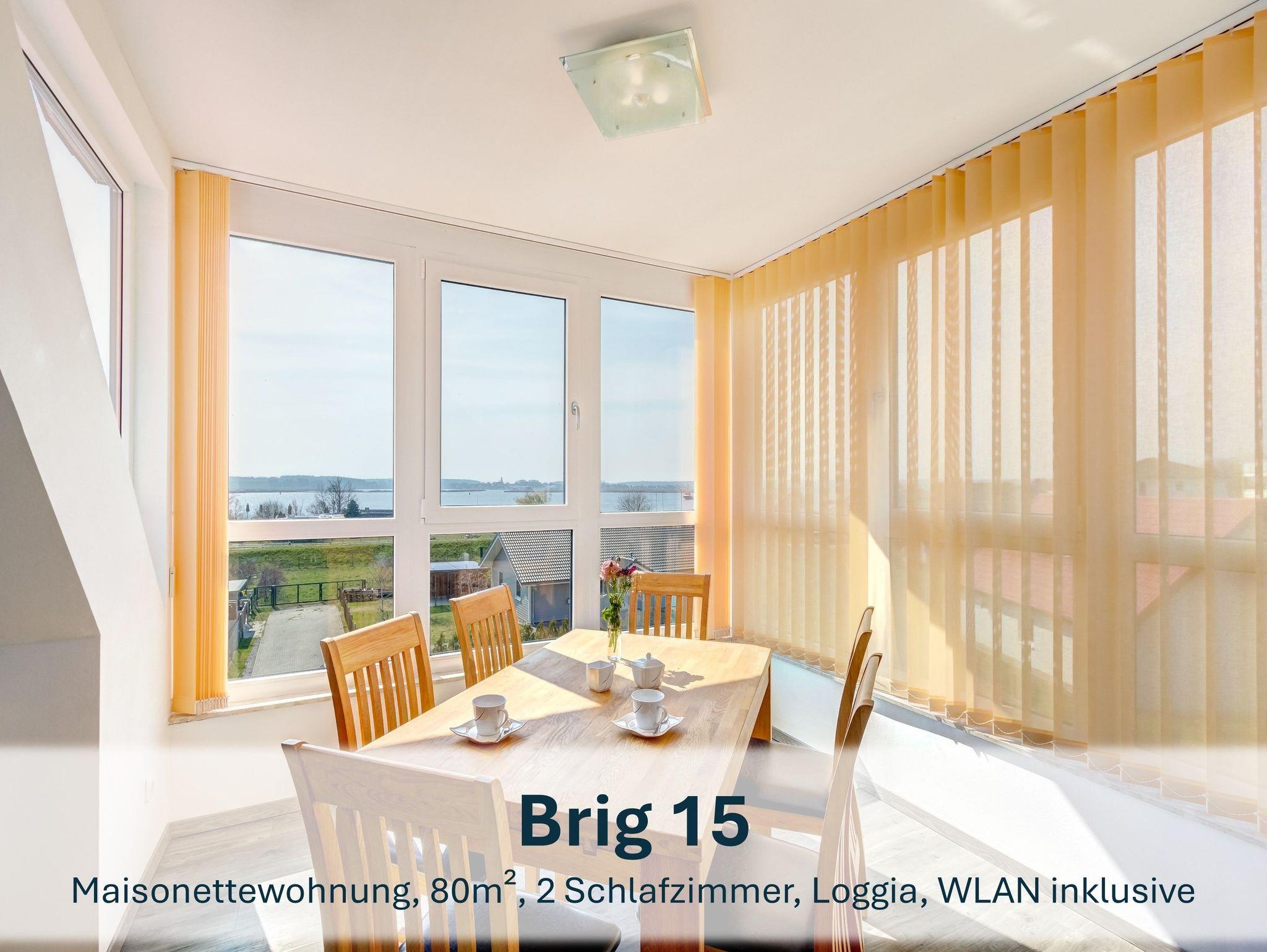 Die Maisonettewohnung Nr.15 erstreckt sich über das Ober- und Dachgeschoss und bietet auf 80m² Platz für bis zu 5 Personen und 1 Kleinkind. Highlight sind die zwei geschlossenen Loggien mit herrlichem Panoramablick auf den Seglerhafen und den Bodden.